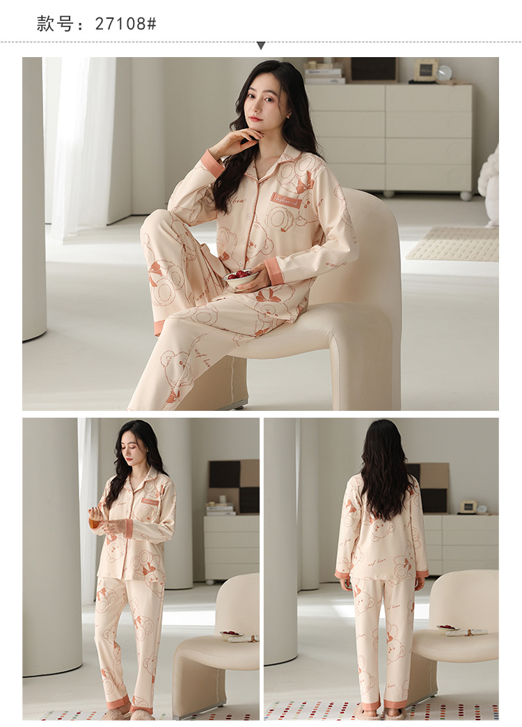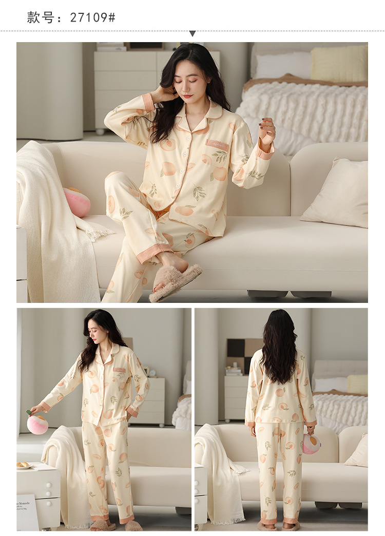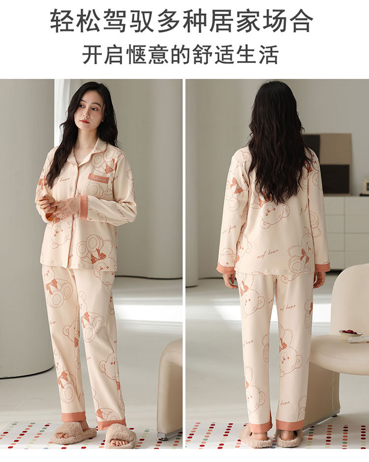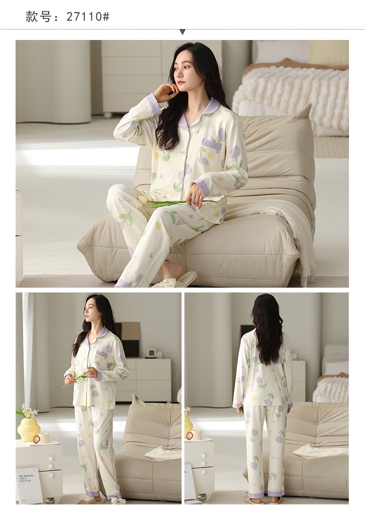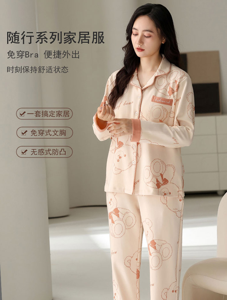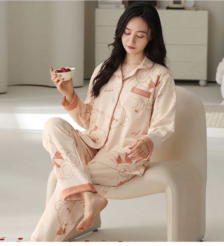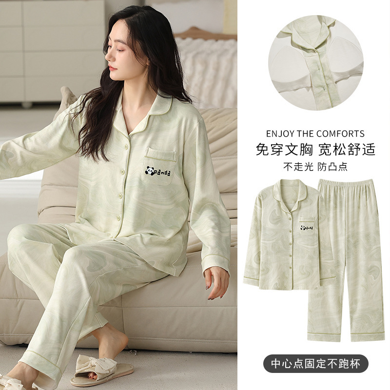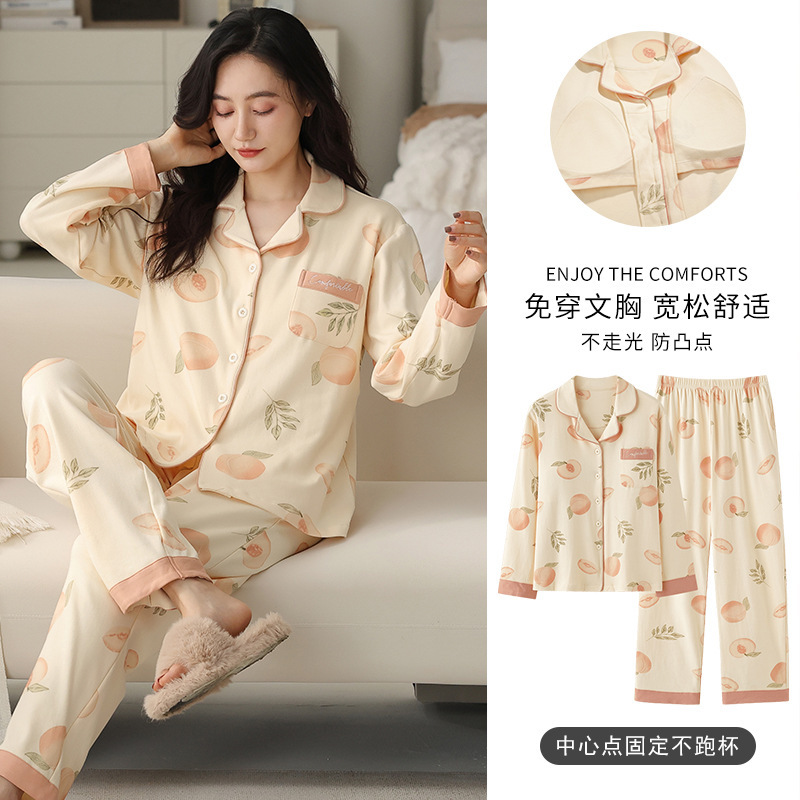 파자마 여성의 2024 봄과 가을 새 코튼 가슴 패드 원피스 긴 소매 바지 투피스 의상 홈 웨어
