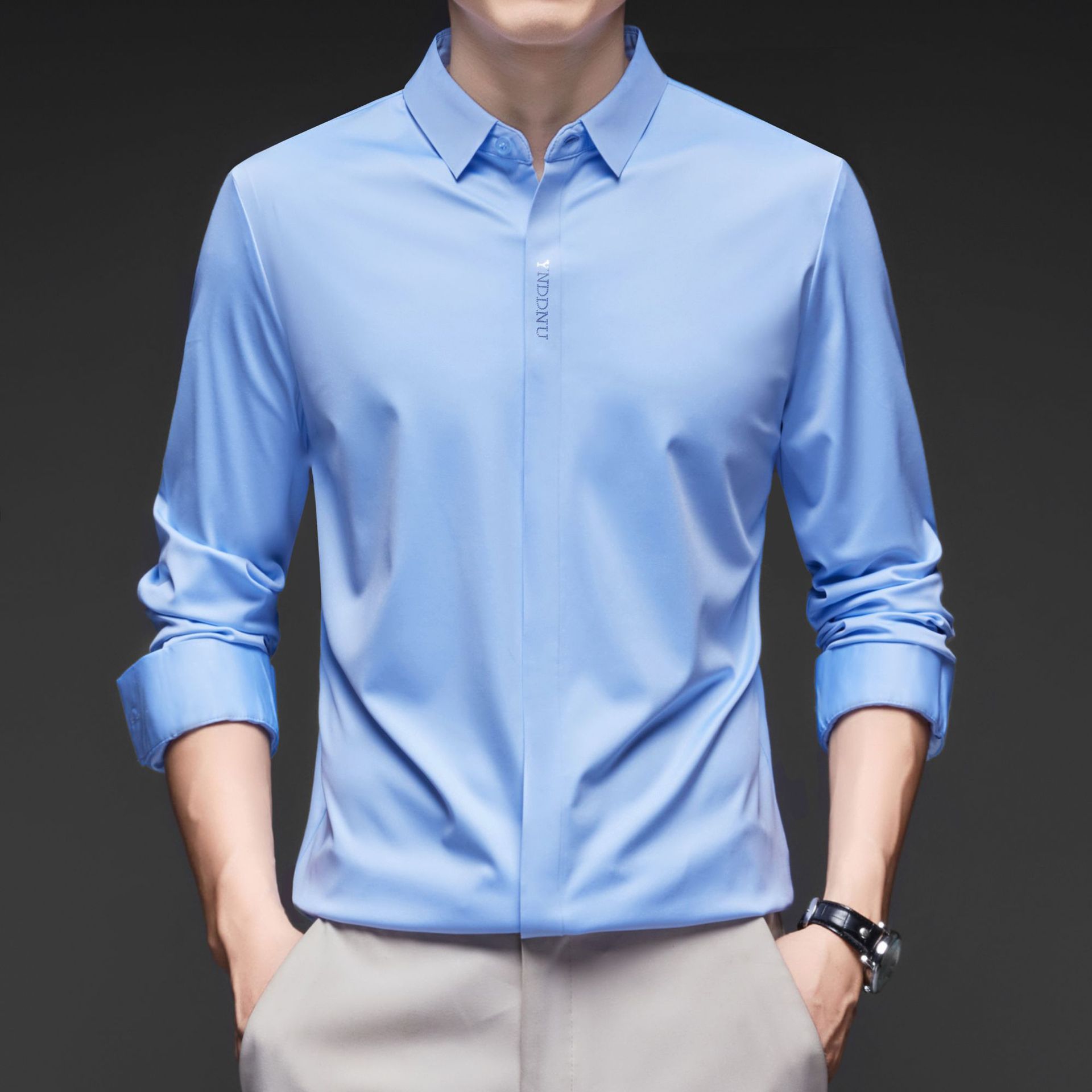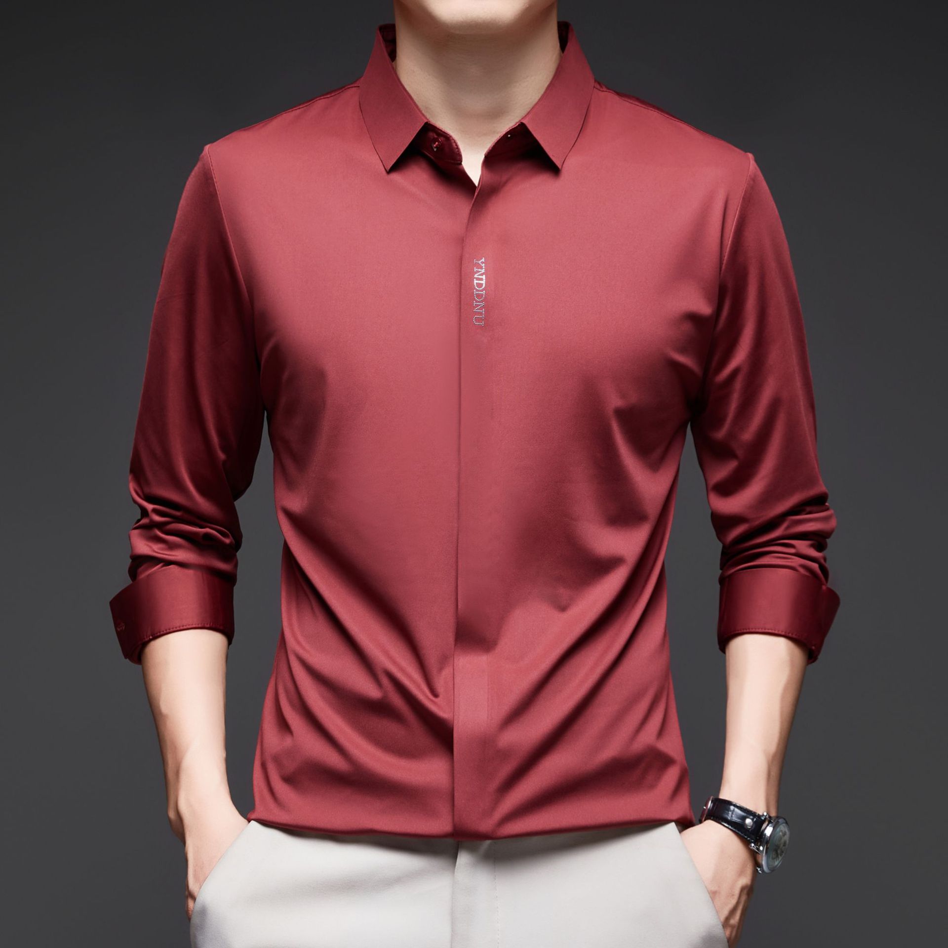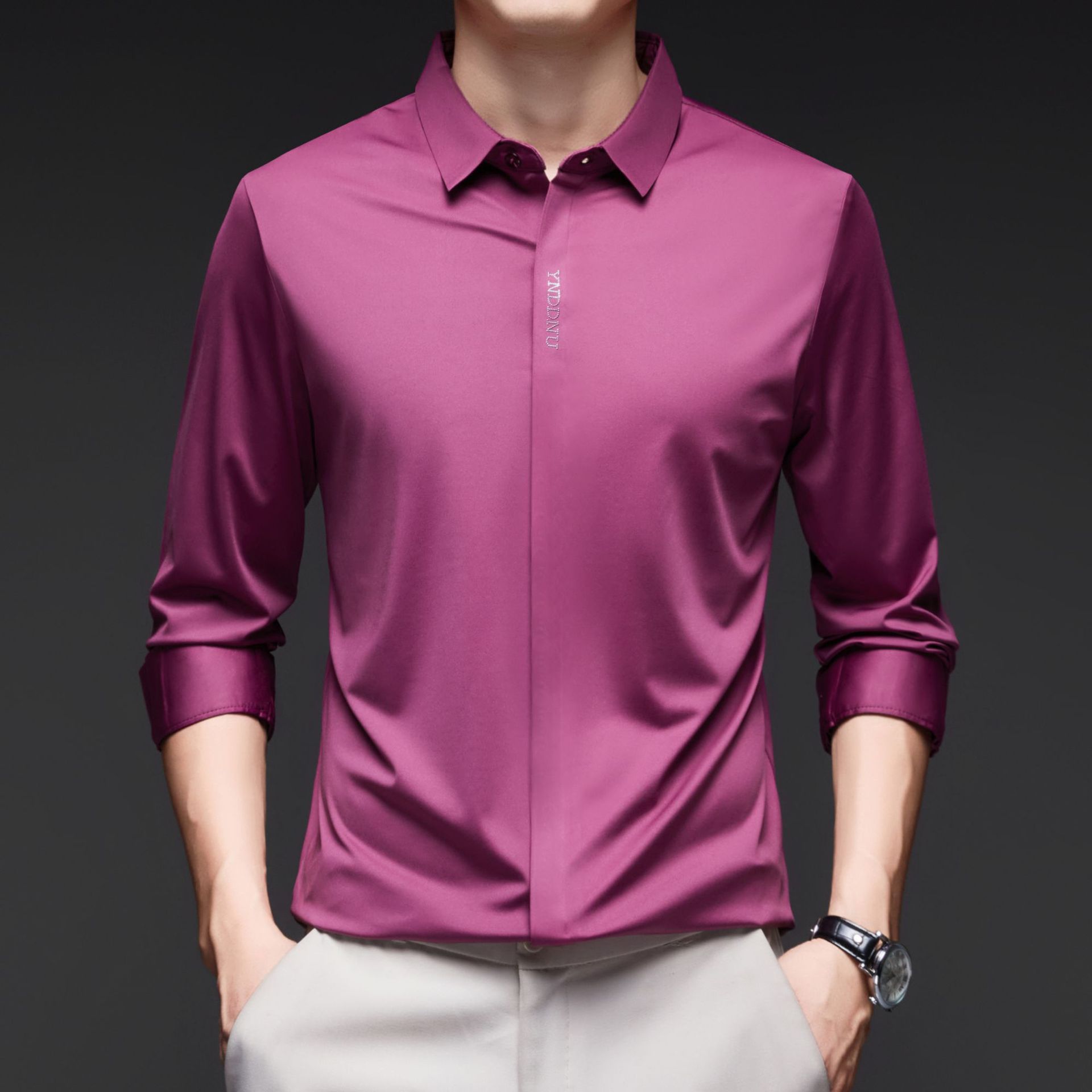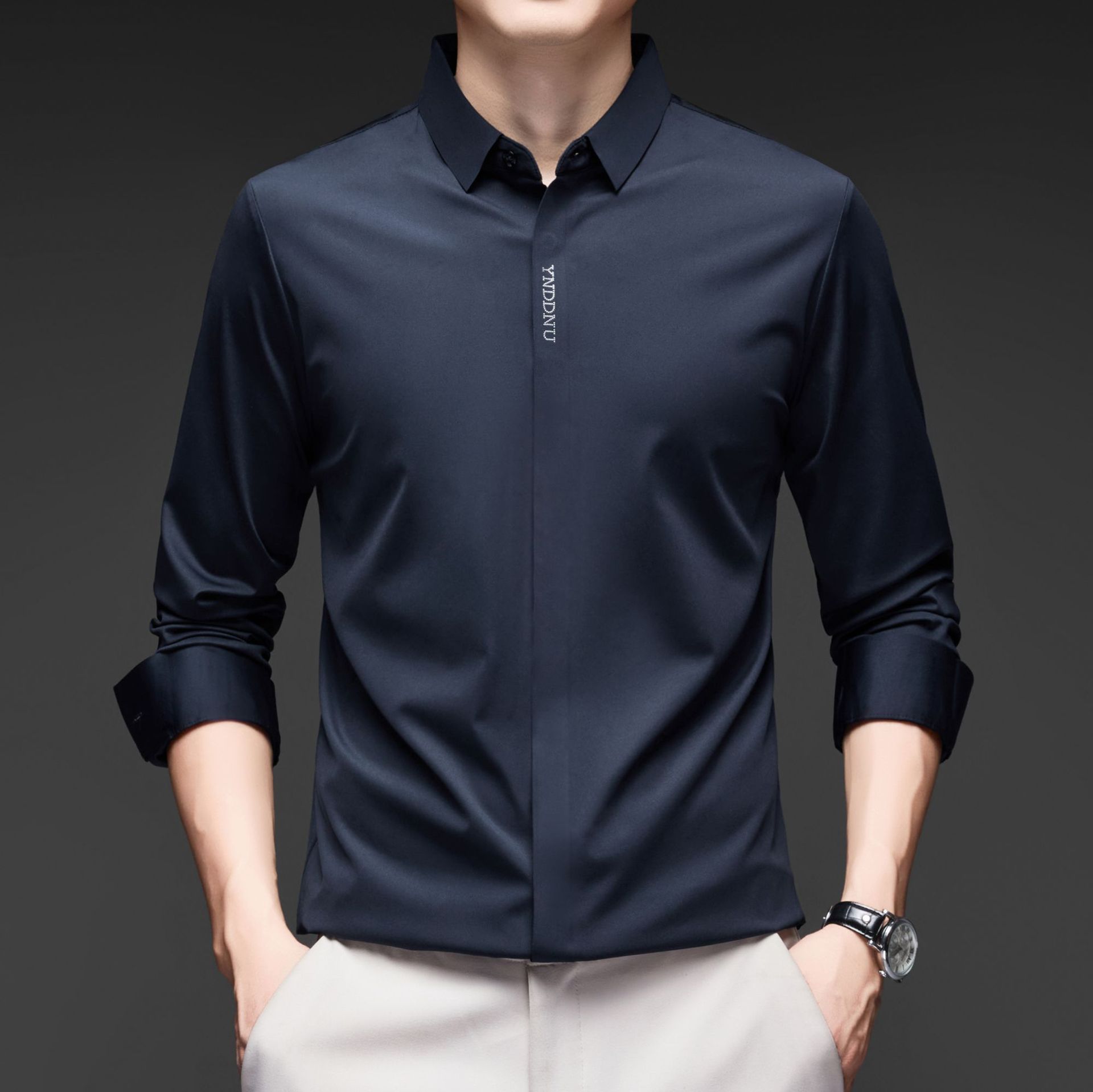 고급 다크 플래켓 원활한 고탄성 긴팔 셔츠 남성 중년 비즈니스 캐주얼 단색 올 매치 남성용 셔츠스토어 가기