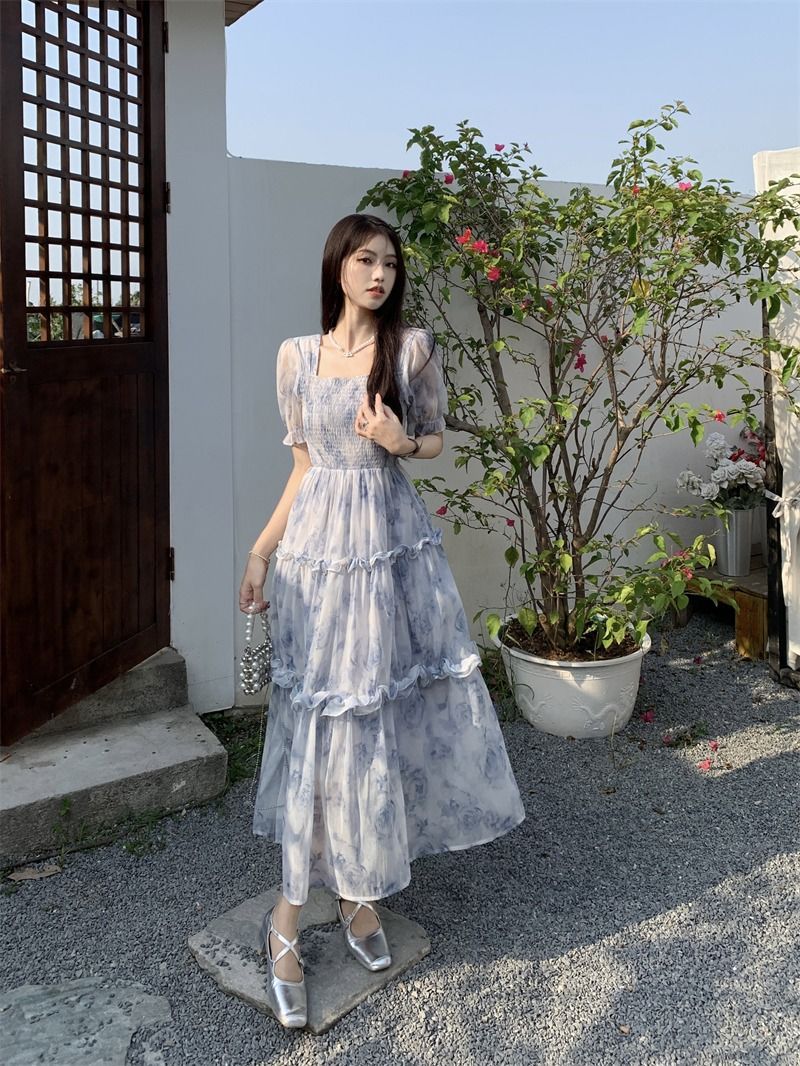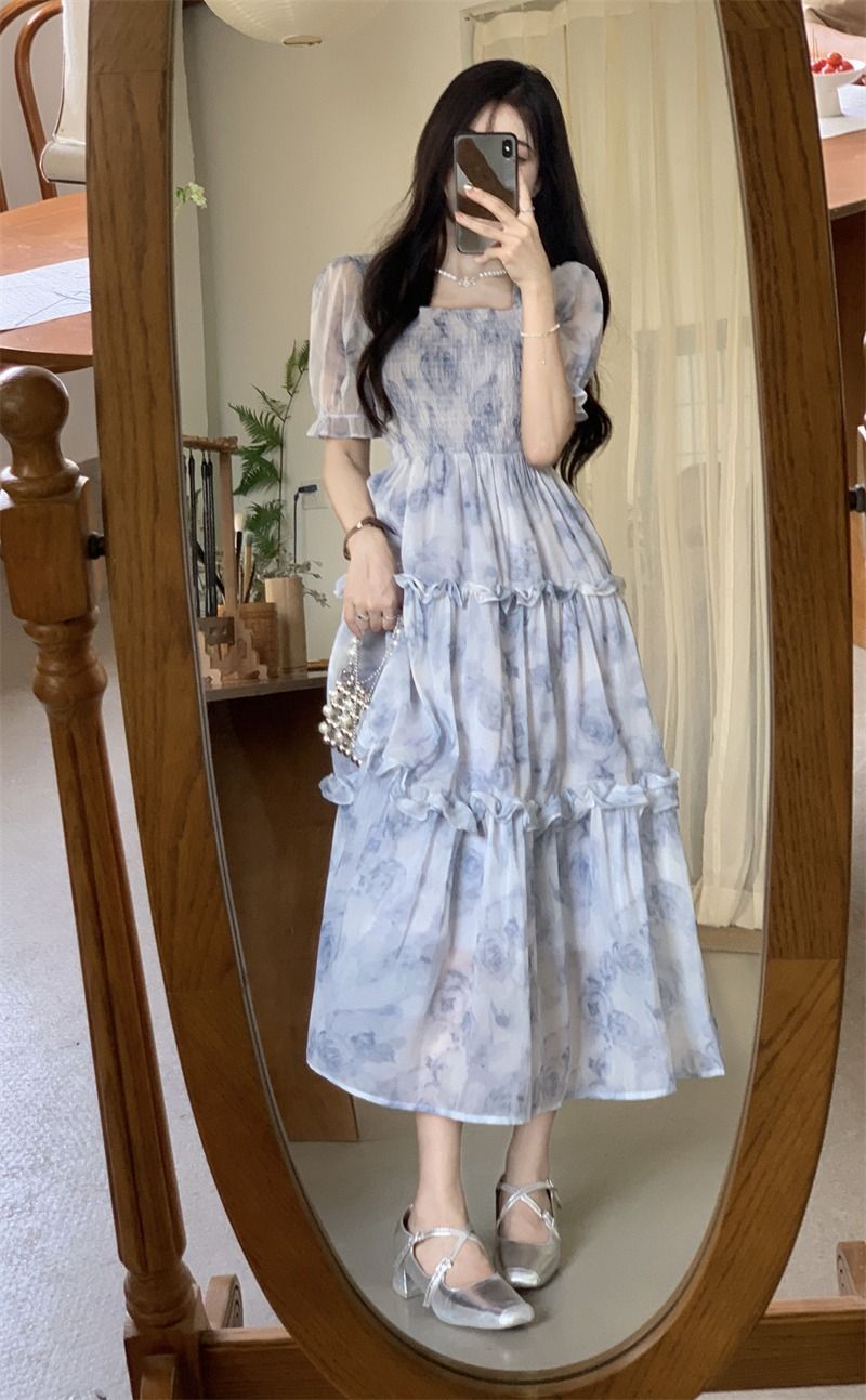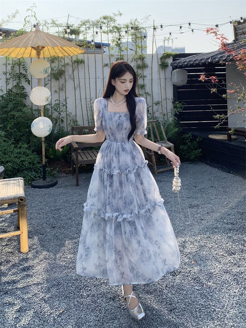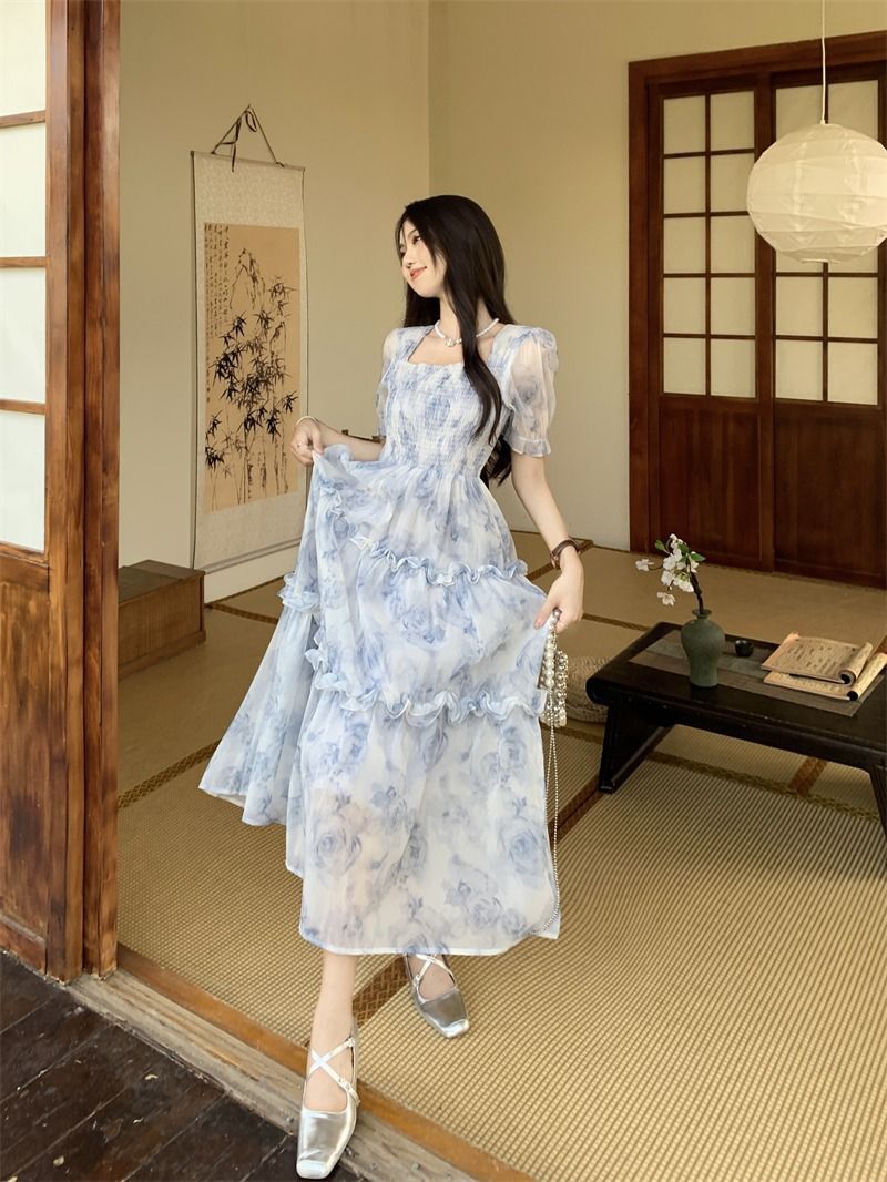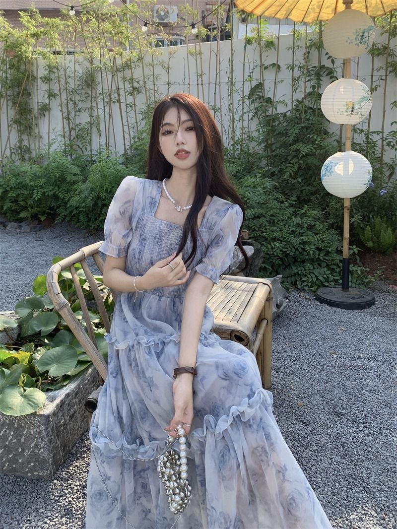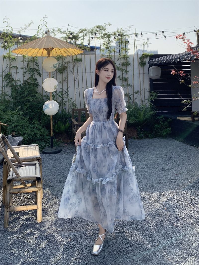 Chiffon Square Collar Floral 원피스 여성 여름 2025 새로운 슈퍼 페어리 스타일 슬리밍 롱 스커트, 타이트 허리와 우드 이어 엣지