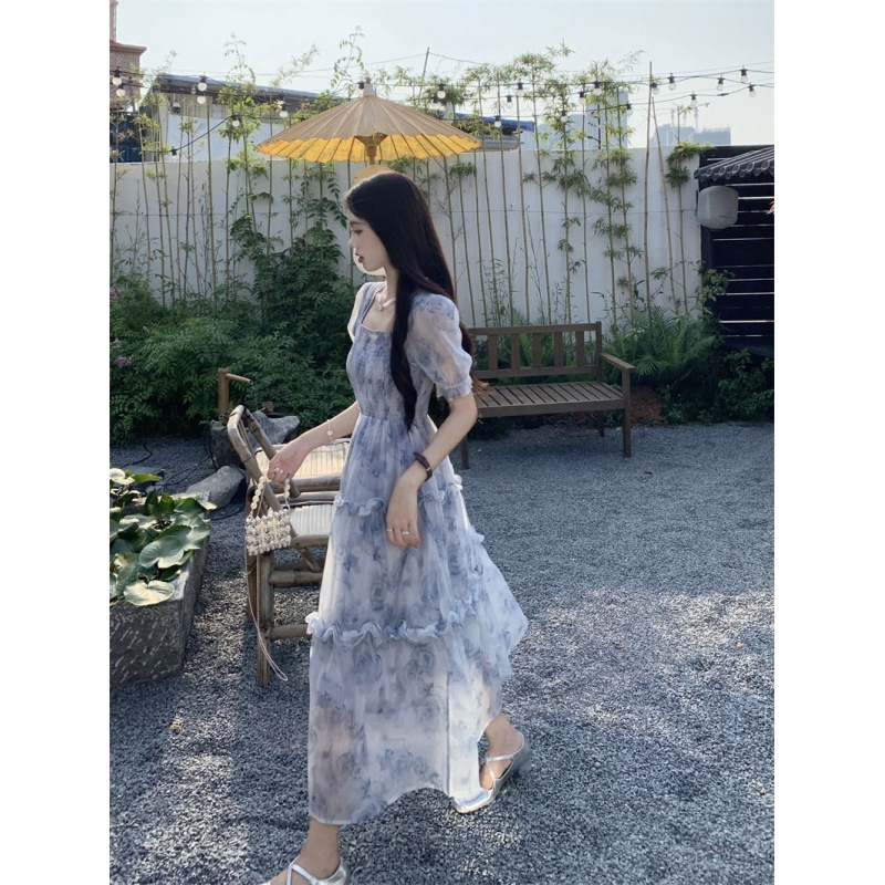 Chiffon Square Collar Floral 원피스 여성 여름 2025 새로운 슈퍼 페어리 스타일 슬리밍 롱 스커트, 타이트 허리와 우드 이어 엣지스토어 가기