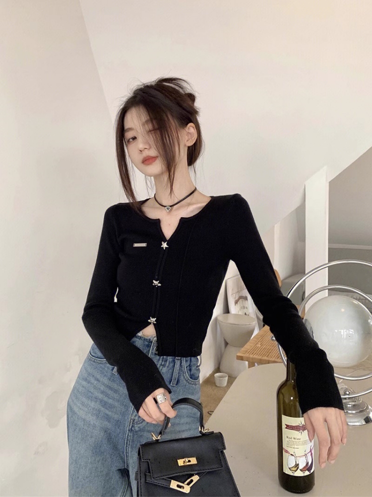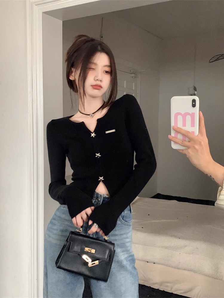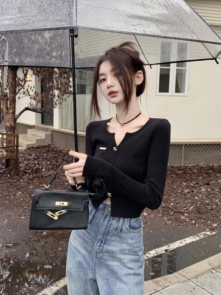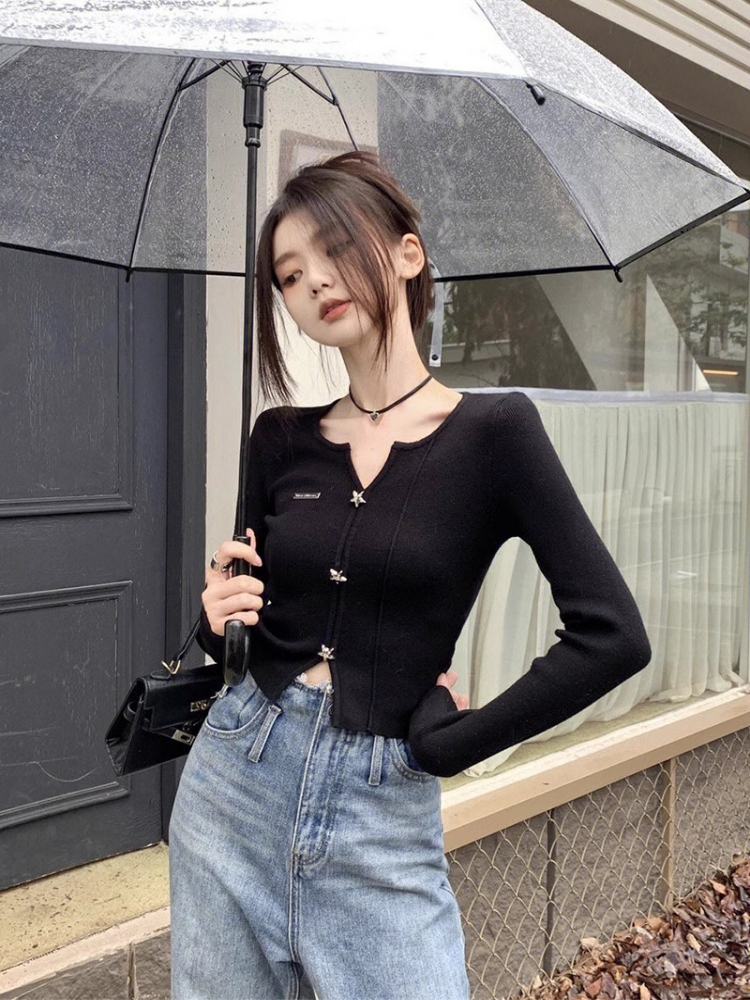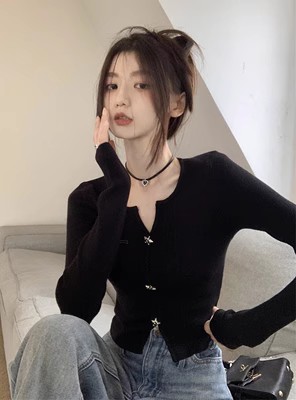 순수 V 넥 블랙 바닥 셔츠 여성 니트 카디건 2025 가을 새로운 핫 걸 디자인 틈새스토어 가기