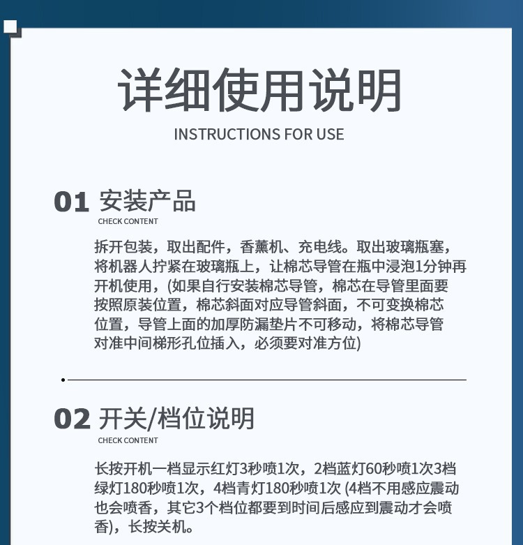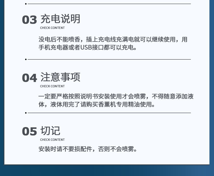 【安装步骤】:拆开包装,取出配件,香薰机 充电线拧开瓶子,取出瓶塞,将棉棒插入机芯后,拧紧在瓶上,让绵心导管在瓶中浸泡一分钟再开机使用,棉芯在导管里面要按照原装位置,棉芯斜面对应导管斜面不可变换棉芯位置,导管上面的防漏垫片不可移动,将棉芯导管对准中间梯形孔插入,必须要对准方位