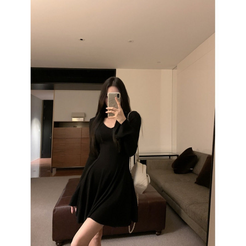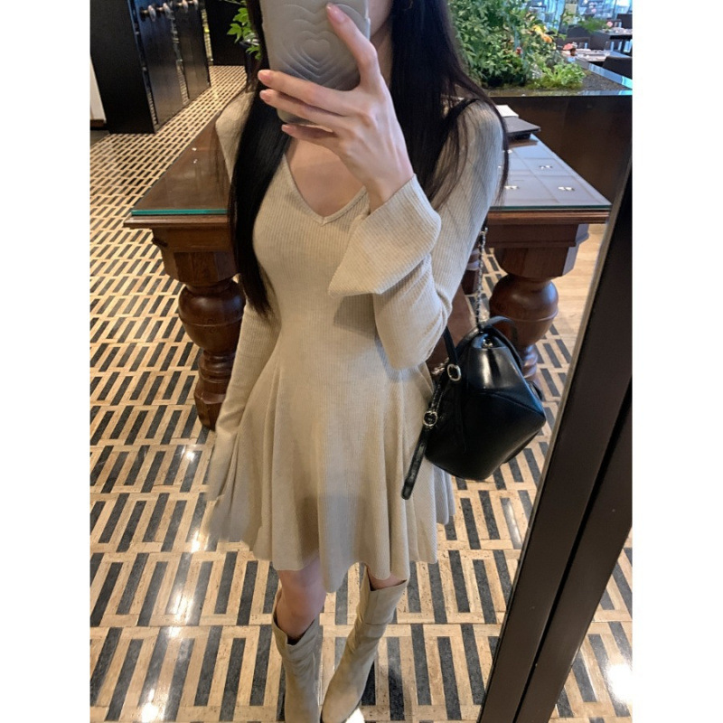 작은 뿔 슬리브 니트 원피스 여성 봄 2025 새로운 우아한 살구색 프랑스 허리 A 라인 스커트스토어 가기