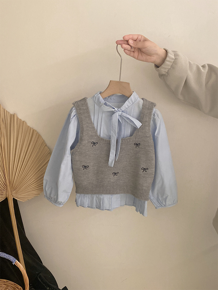 소녀의 봄 2025 세련 된 활 조끼 셔츠 넓은 다리 바지 어린이 한국어 착용 3 피스 유행 세트