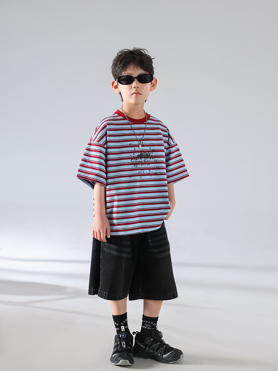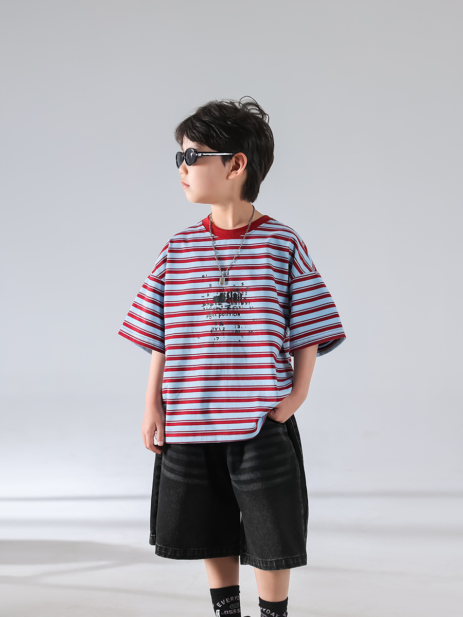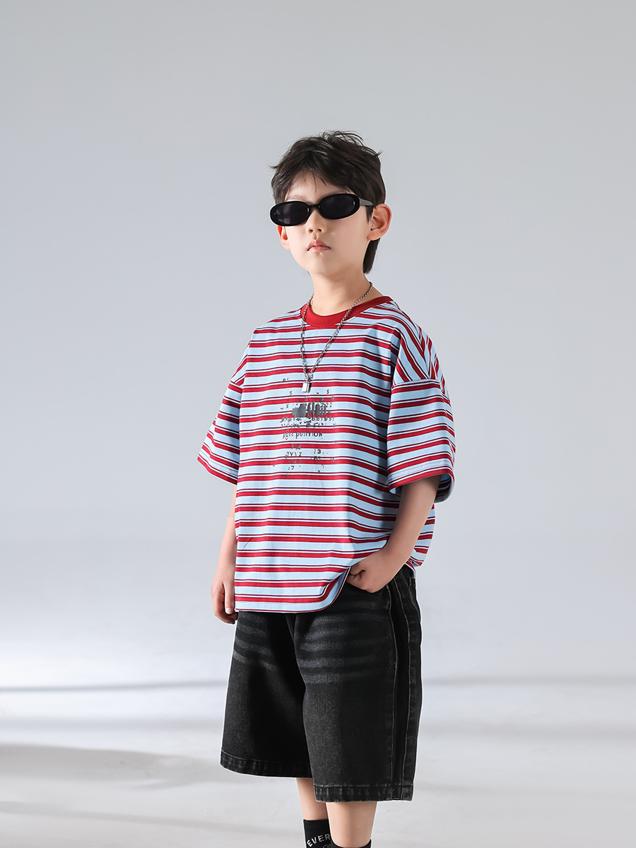 남아 여름 티셔츠 2025 신상 아동 한국 스타일 스트라이프 반팔 세트 스포츠 청바지 반바지 아동복 트렌드스토어 가기