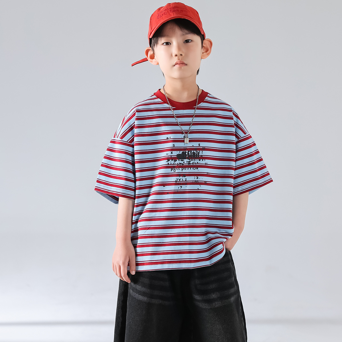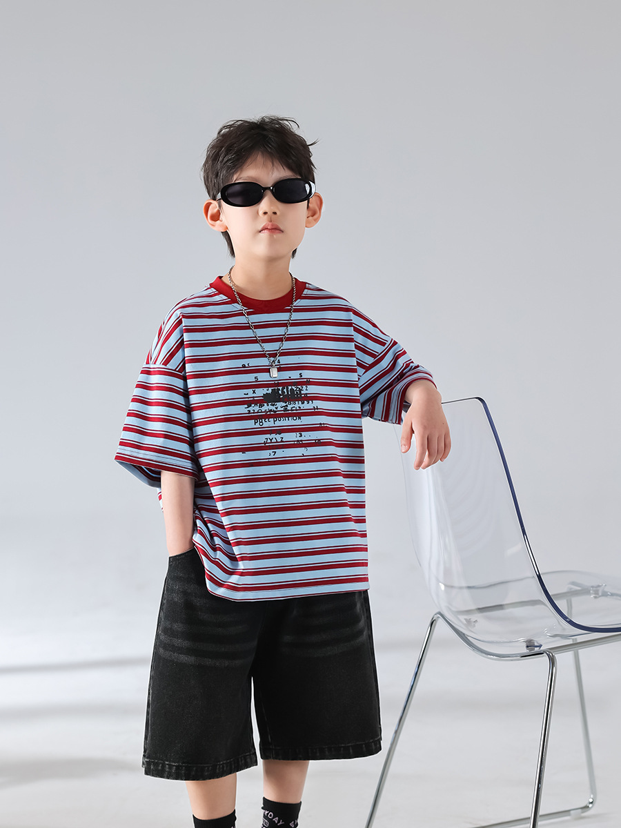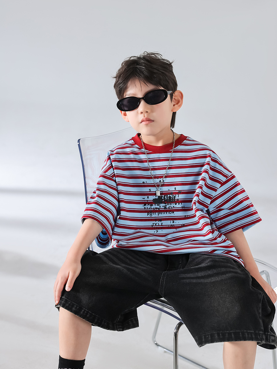 남아 여름 티셔츠 2025 신상 아동 한국 스타일 스트라이프 반팔 세트 스포츠 청바지 반바지 아동복 트렌드스토어 가기