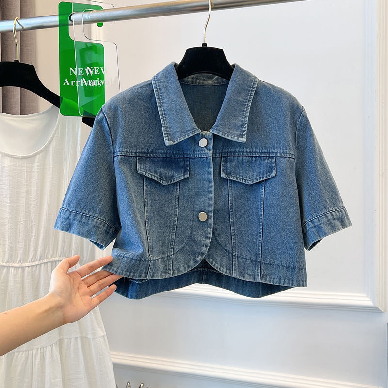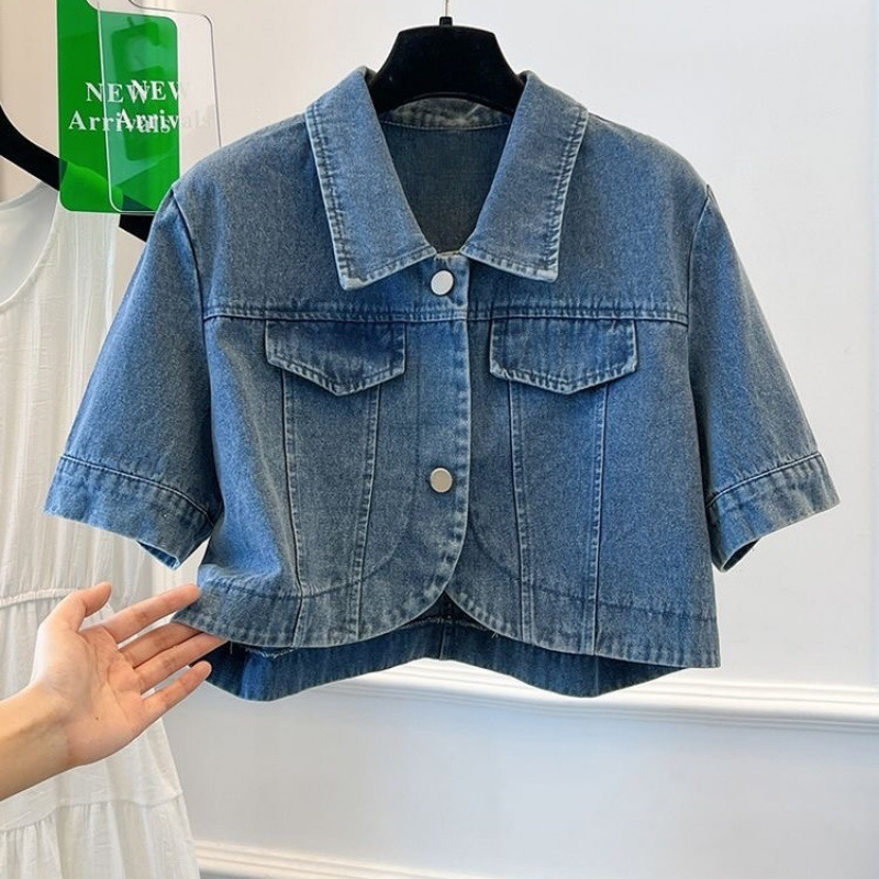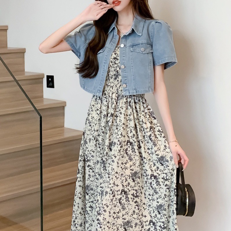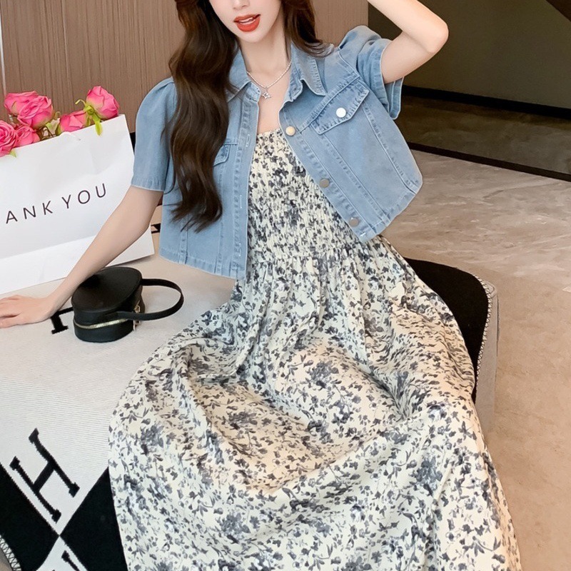 여름 새로운 패션 세트 여성 라이트 블루 데님 코트 짧은 달콤한 꽃 원피스 투피스 세트스토어 가기
