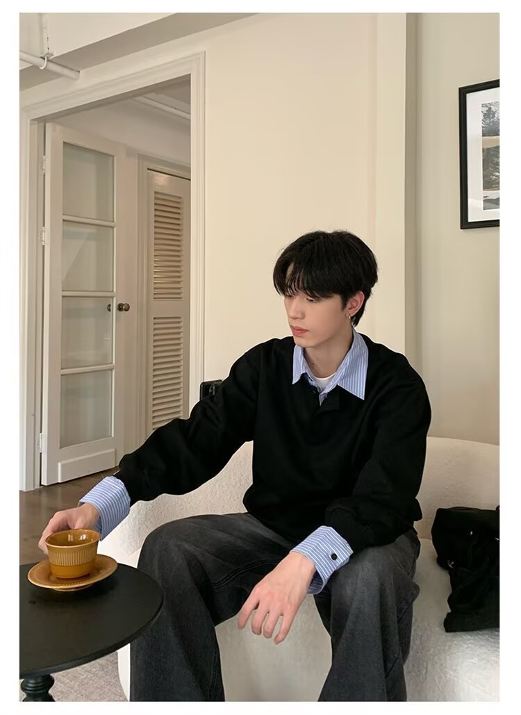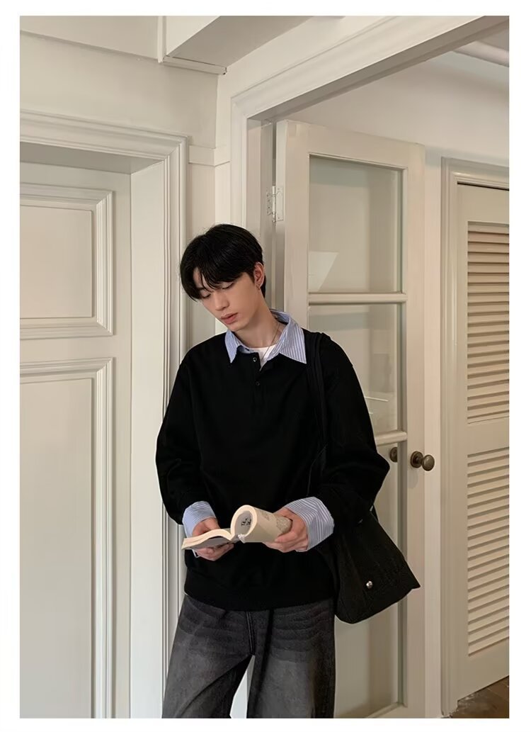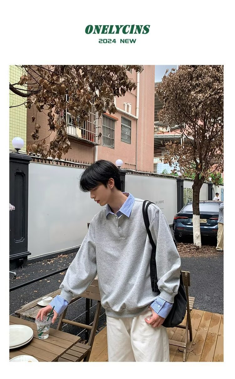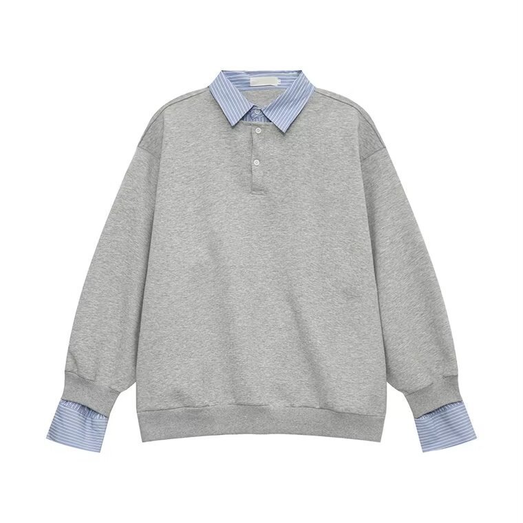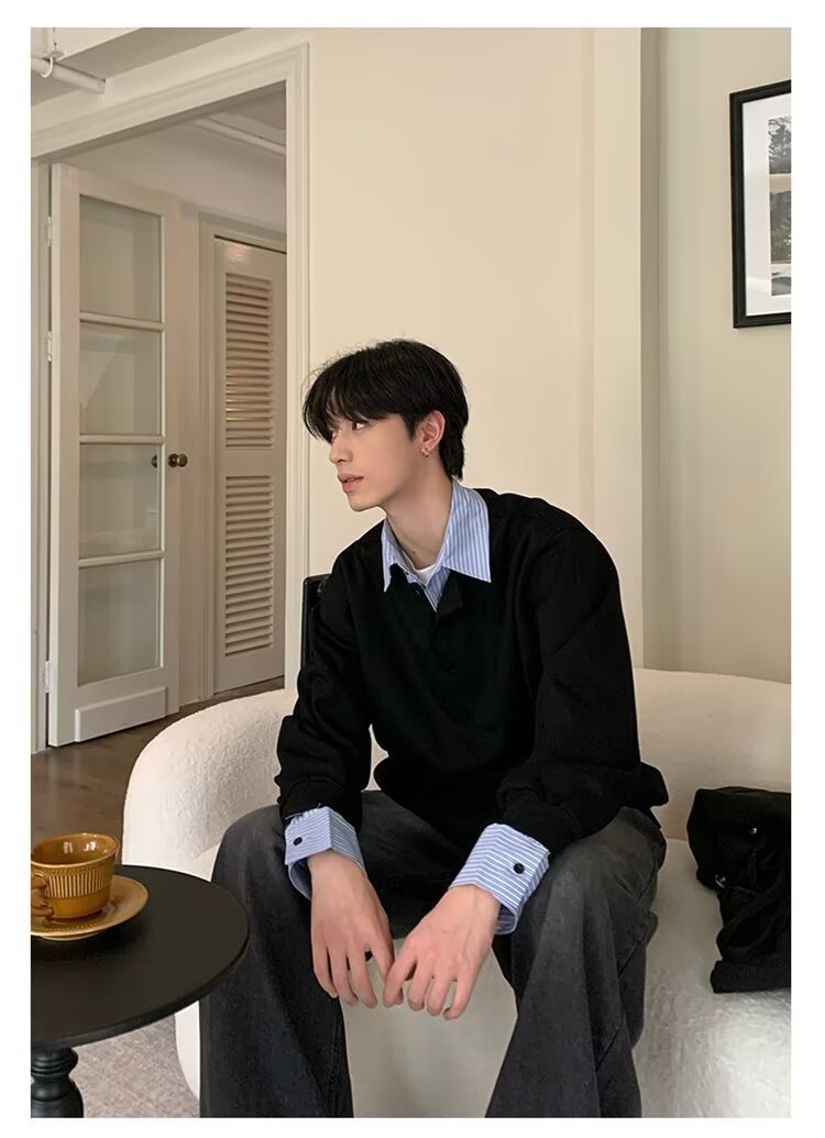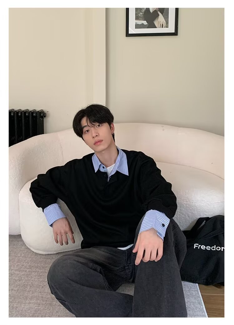 남성과 여성을위한 가짜 2 피스 대비 컬러 스티칭 셔츠 칼라 스웨터 가을 긴 소매 옷깃 느슨한 연인 디자인 센스 탑스토어 가기