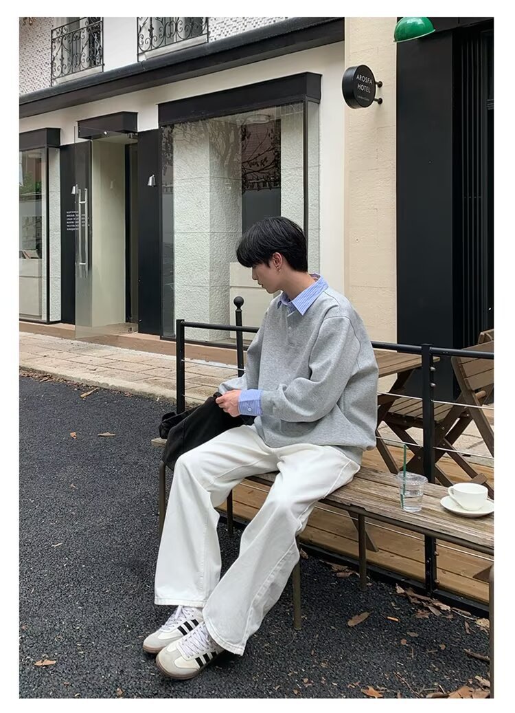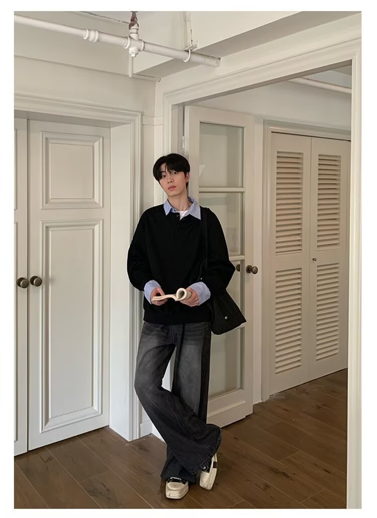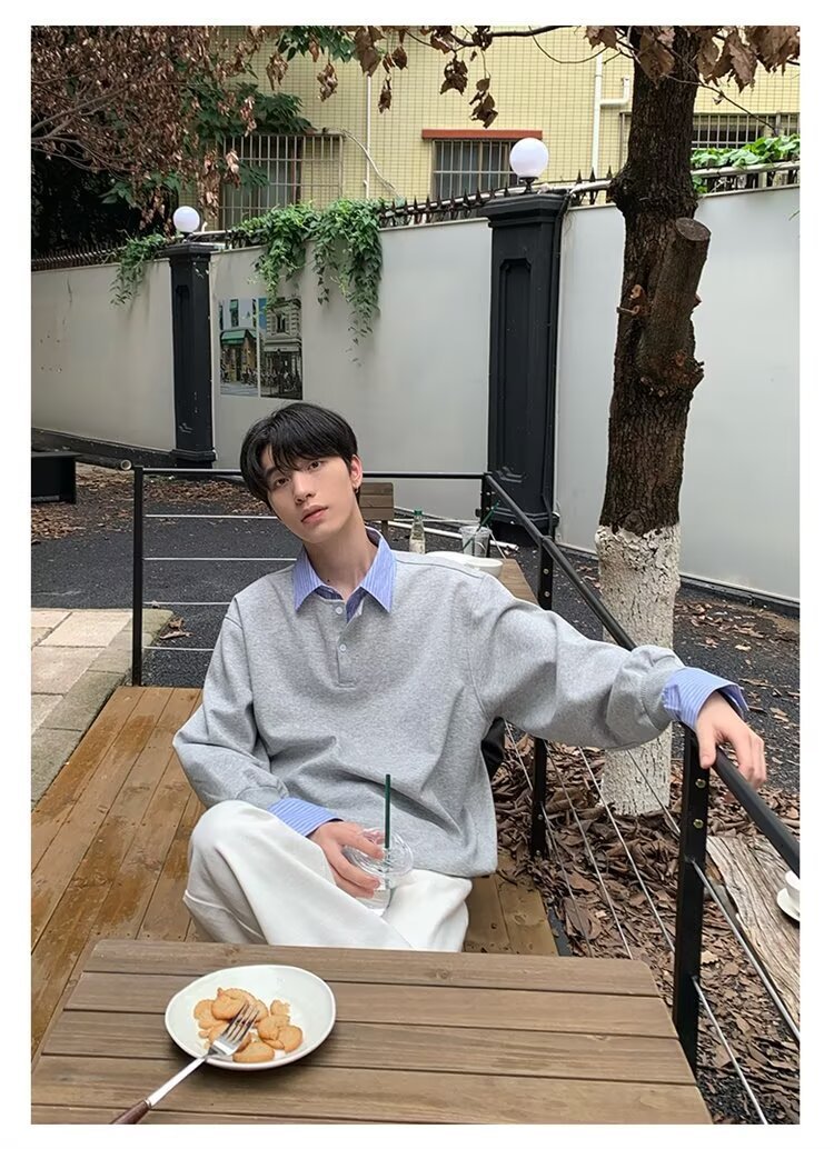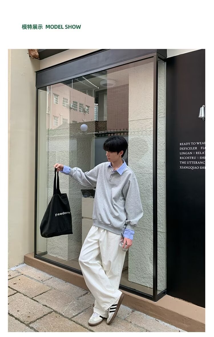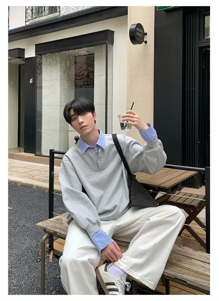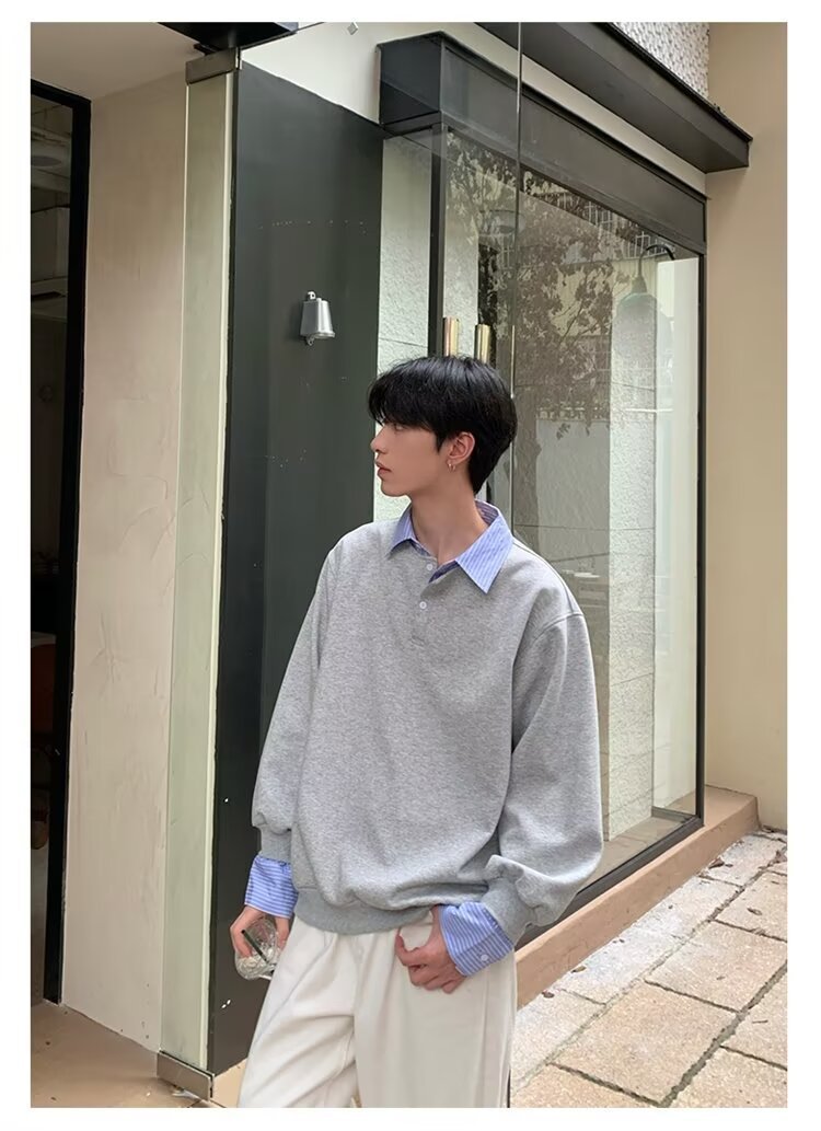 남성과 여성을위한 가짜 2 피스 대비 컬러 스티칭 셔츠 칼라 스웨터 가을 긴 소매 옷깃 느슨한 연인 디자인 센스 탑스토어 가기
