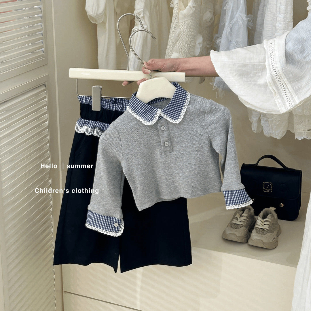 • 그레이 배색 탑 + 체크무늬 스플라이스 와이드 팬츠