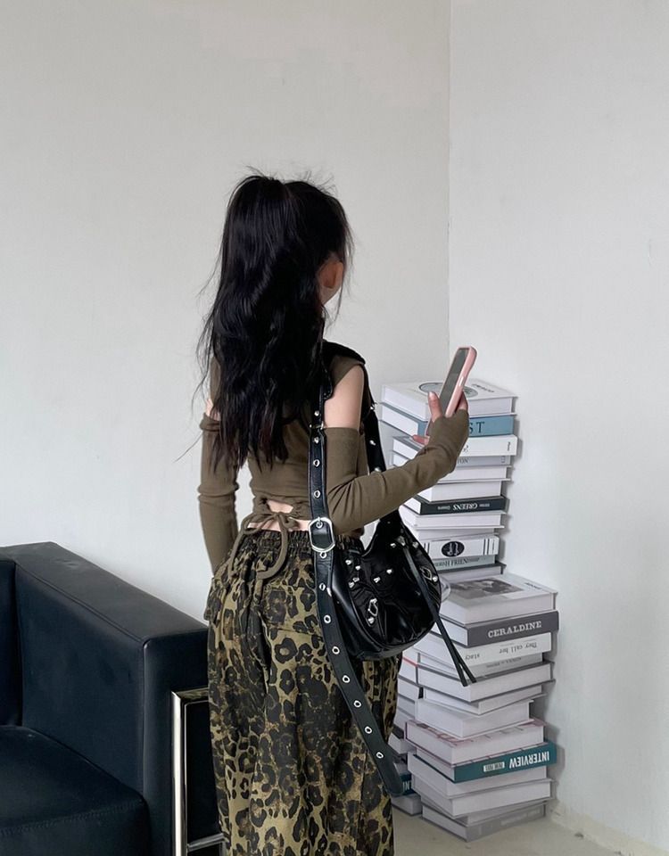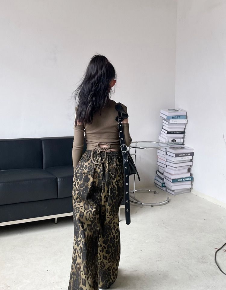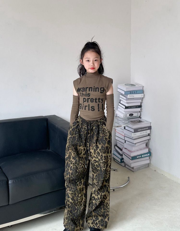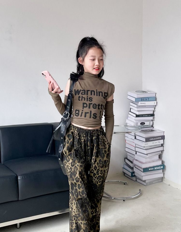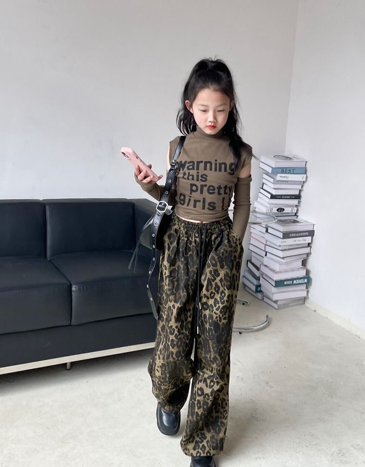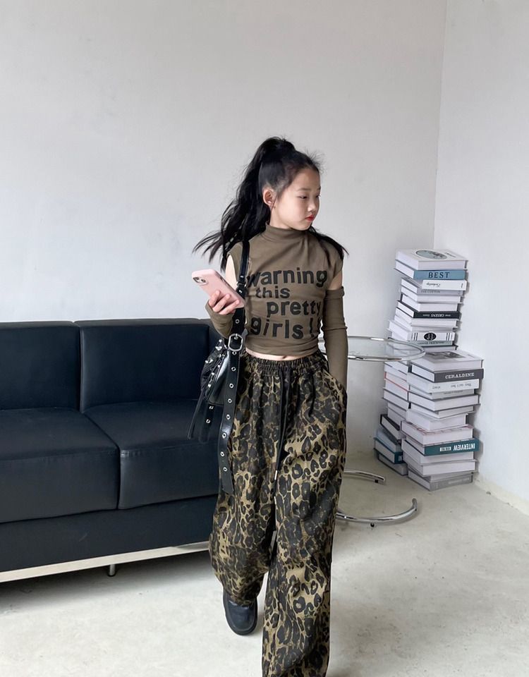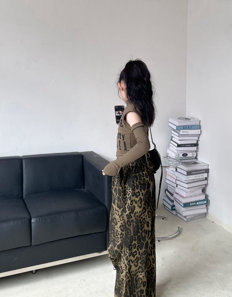 • 브라운 소매 레터탑 + 레오파드 프린트 멜빵바지