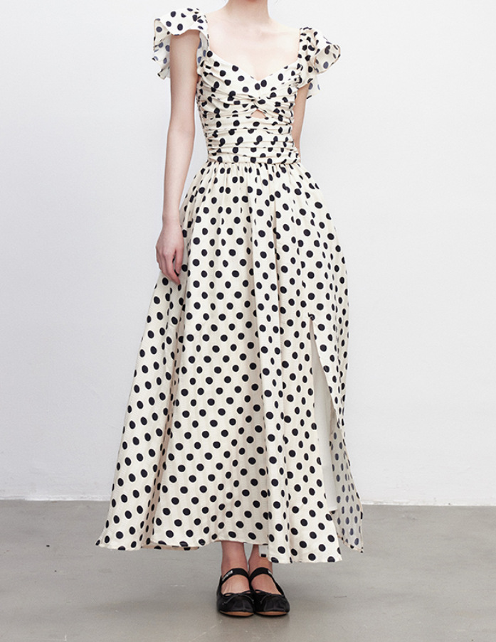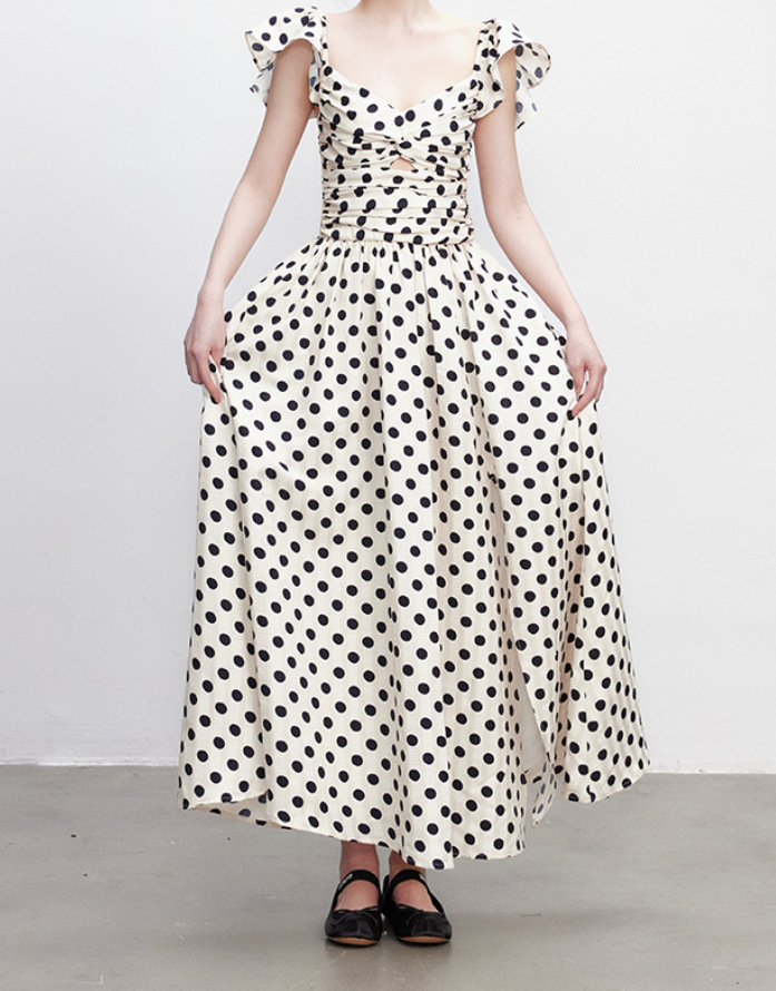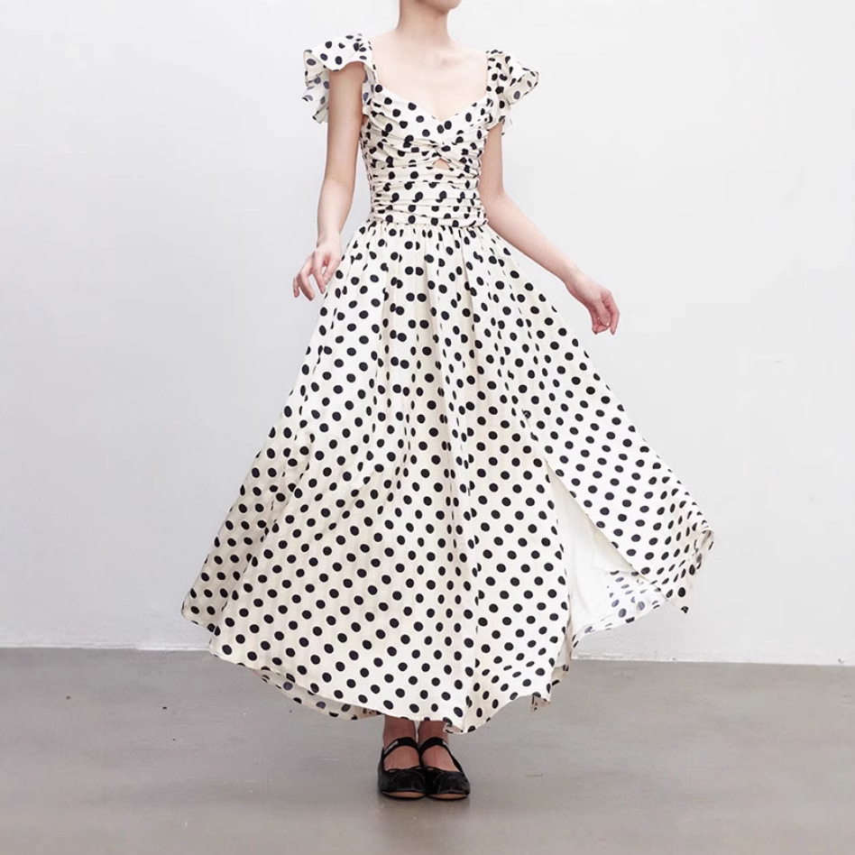 고급 웨이브 도트 원피스 여름 새로운 틈새 부드럽고 편안한 주름 허리 슬리밍 기질 긴 스커트