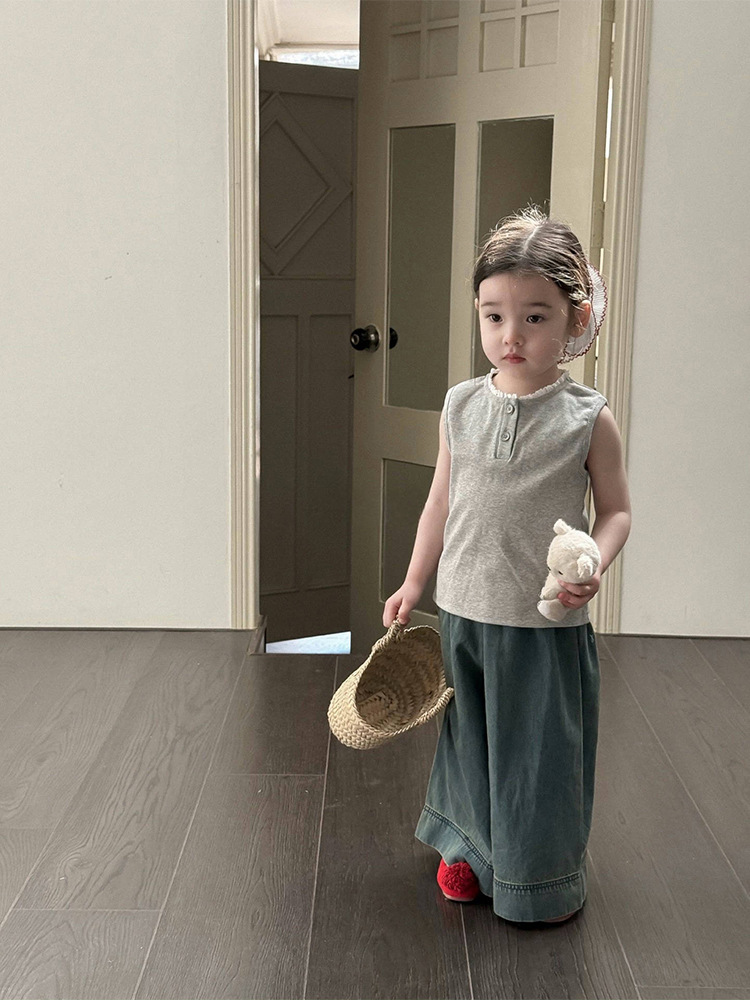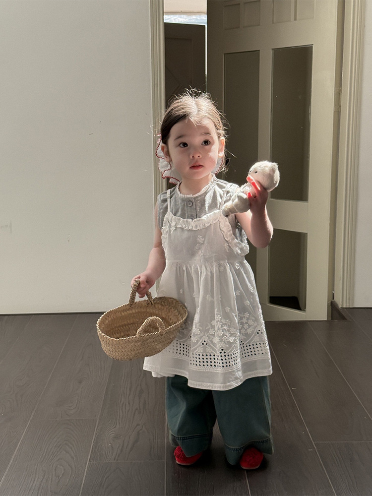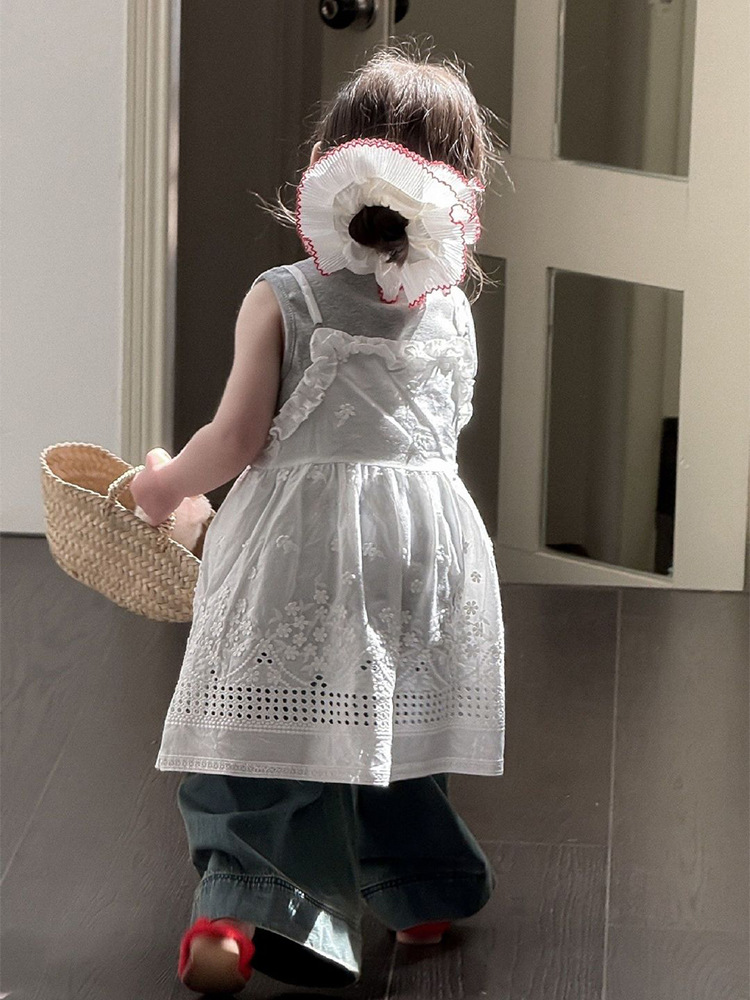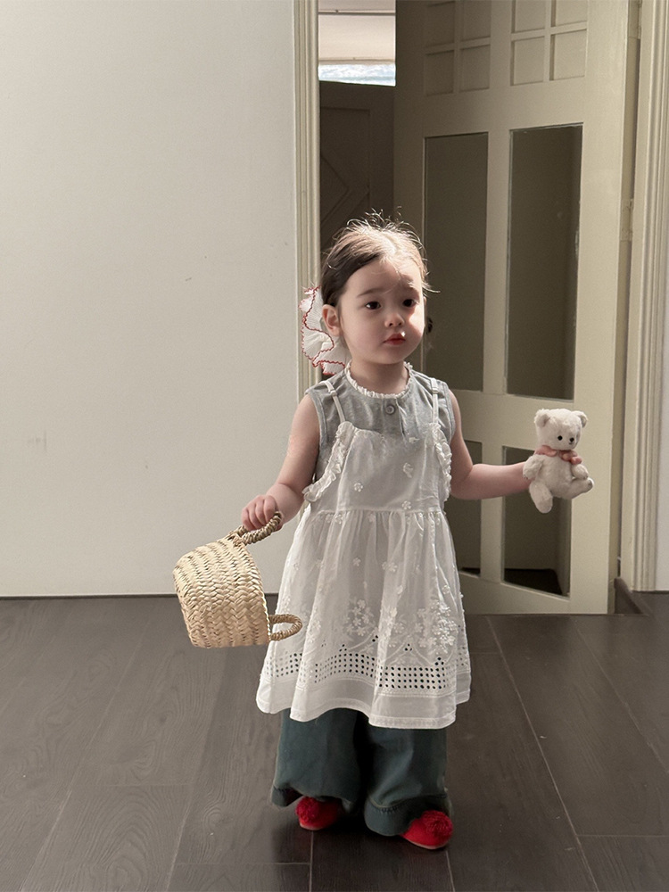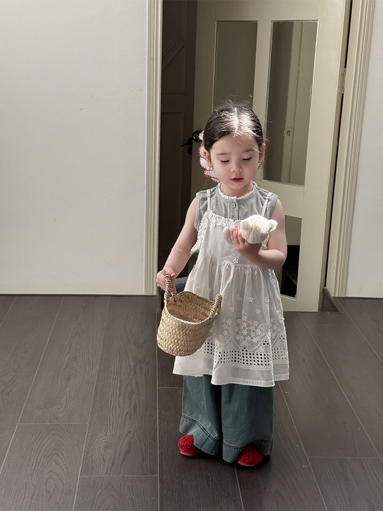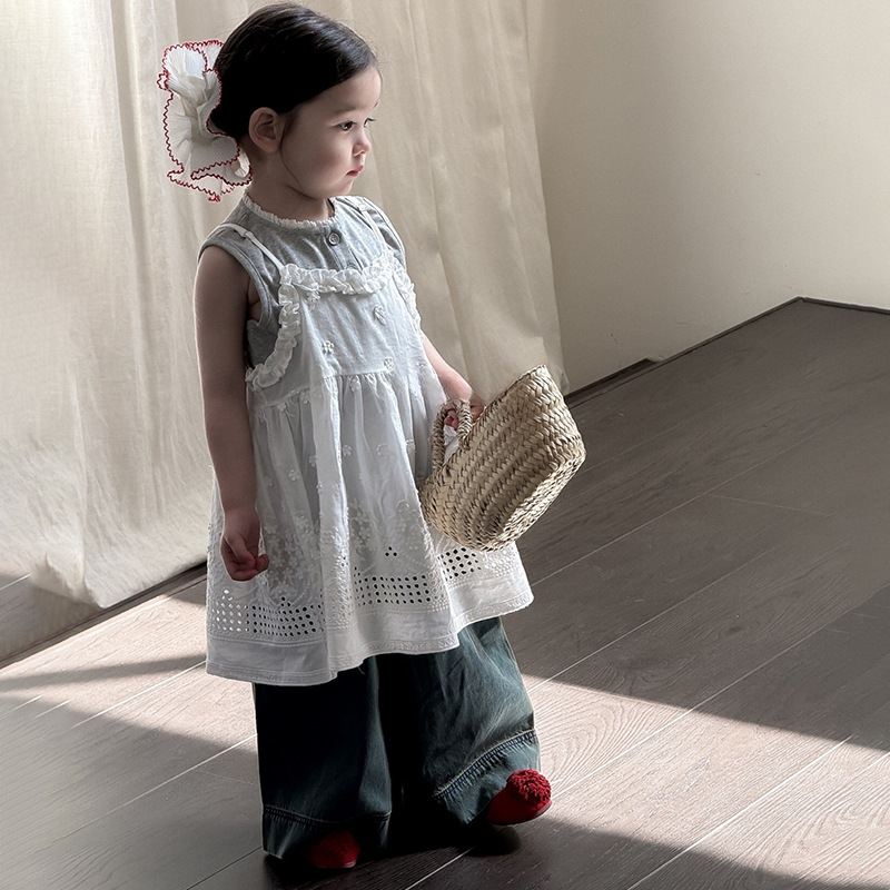 소녀 2025 년 여름 새로운 레이스 칼라 작은 조끼 꽃 슬링 원피스 올 매치 와이드 레그 바지 3 피스 유행 세트