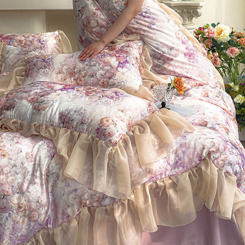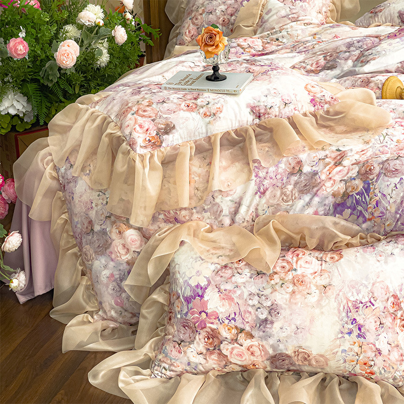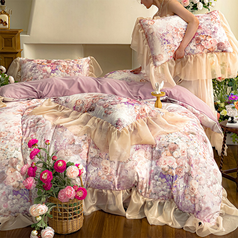 프렌치 레트로 레이스 엣지 세척 코튼 4 피스 세트 주름 원사 로맨틱 플라워 퀼트 커버 침대 시트 퀼트 커버 3 피스 세트스토어 가기