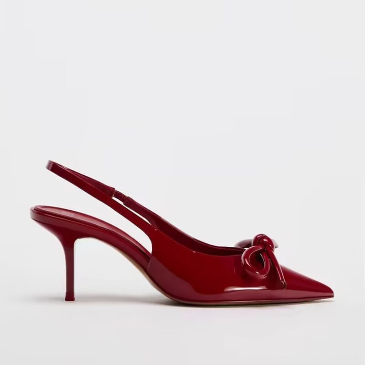 새로운 2025 뾰족한 여성 이른 봄 Baotou 샌들 스틸레토 힐 보우 얕은 입 신발 섹시한 버건디 하이힐