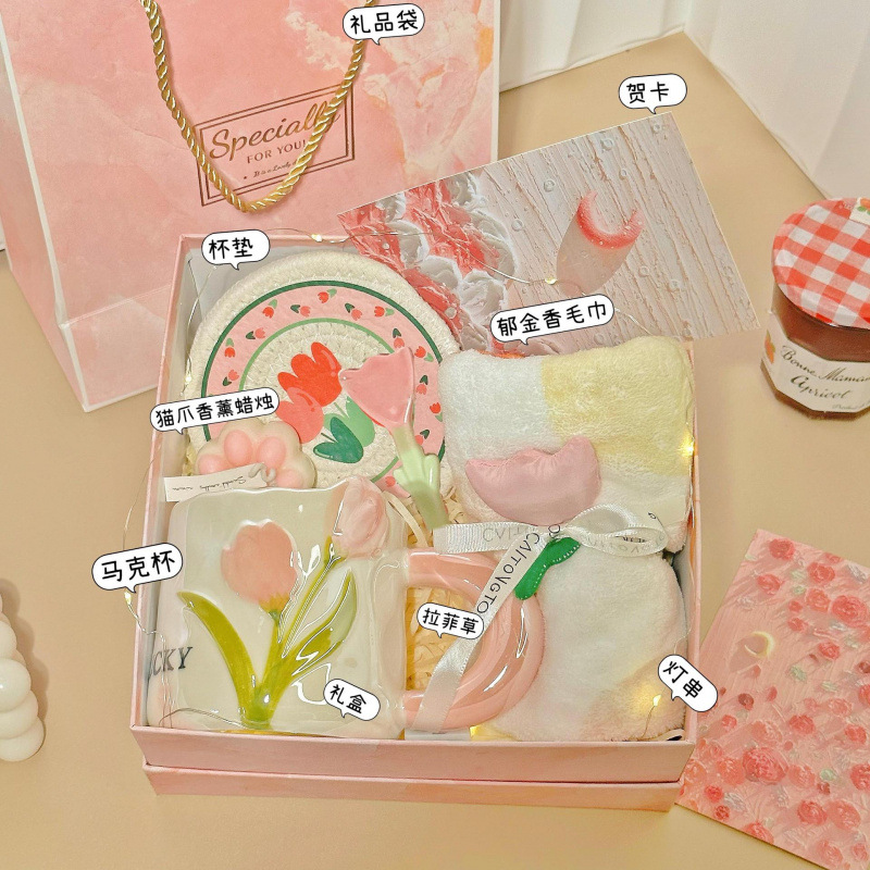 • 진주 빛 브라운 튤립 컵 + 스푼 + 수건 + 코스터 + 향초 + 가벼운 끈 + 선물 상자 선물 가방