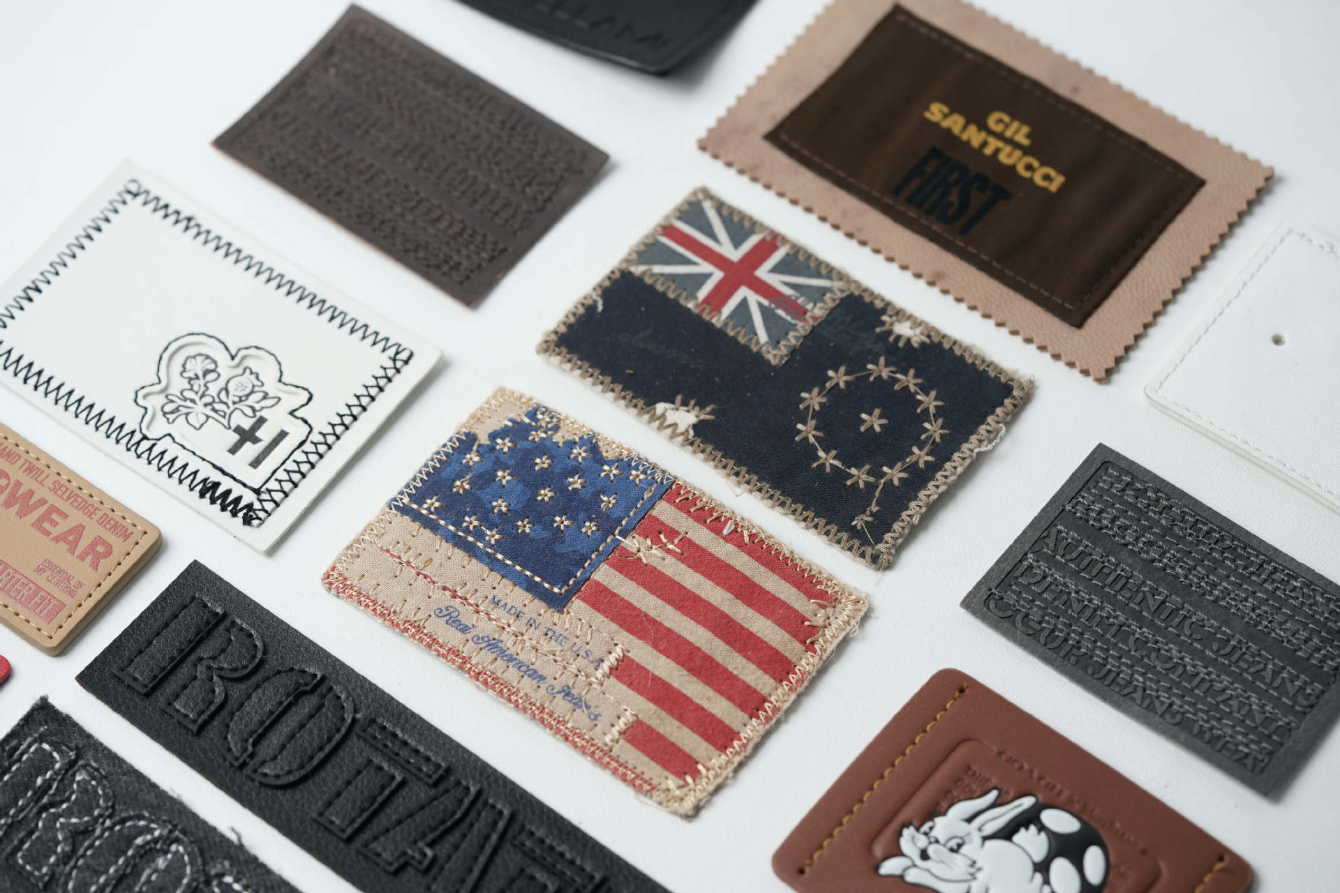 공장 의류 PU 가죽 로고 엠보싱 로고 정품 가죽 청바지 가죽 브랜드 금박을 입힌 마이크로 화이버 가죽 가방 신발 모자 디자인스토어 가기
