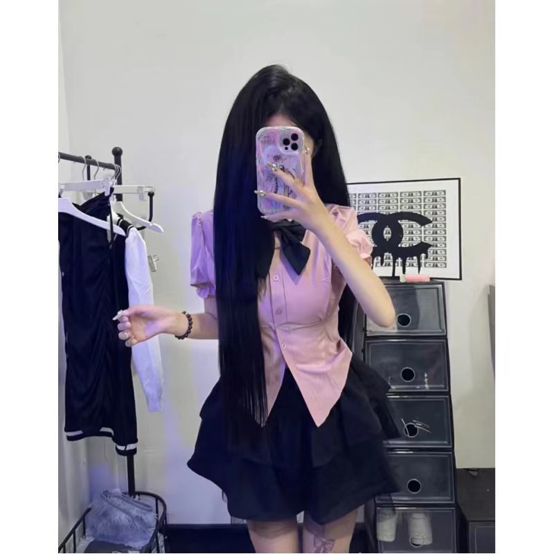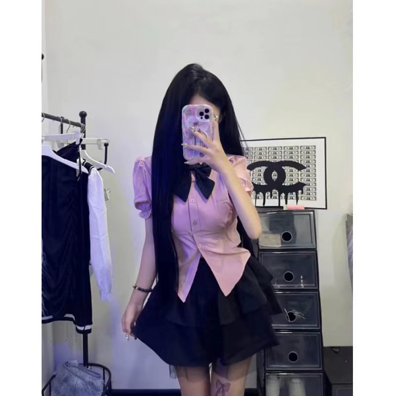 달콤한 소녀 대학 스타일 우아한 슬림 핏 반팔 셔츠 탑 여성의 여름 푹신한 스커트 짧은 스커트 투피스 세트스토어 가기