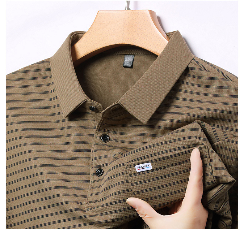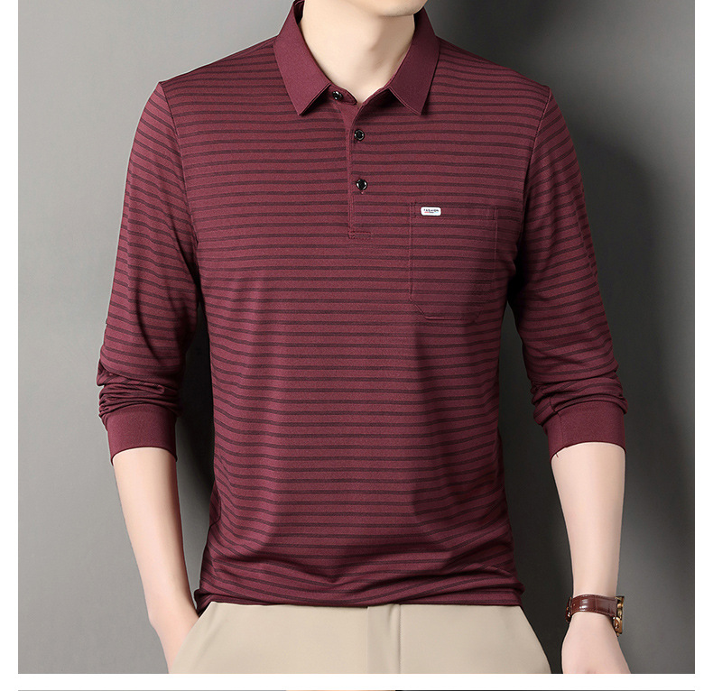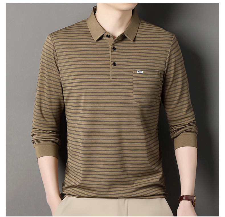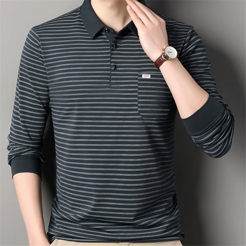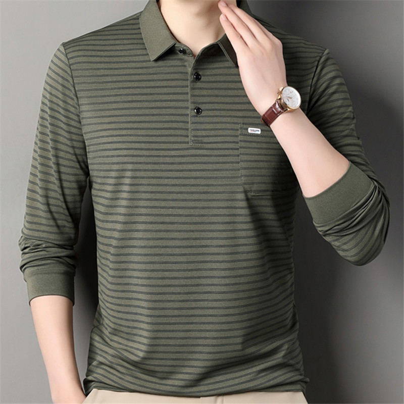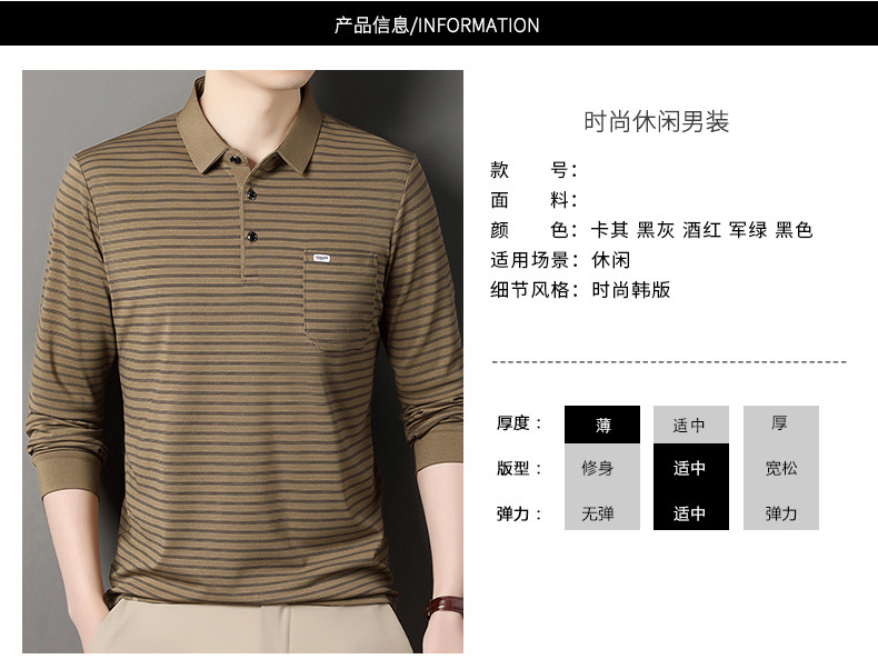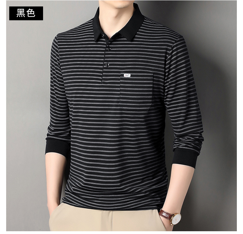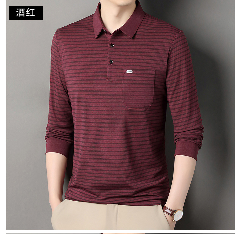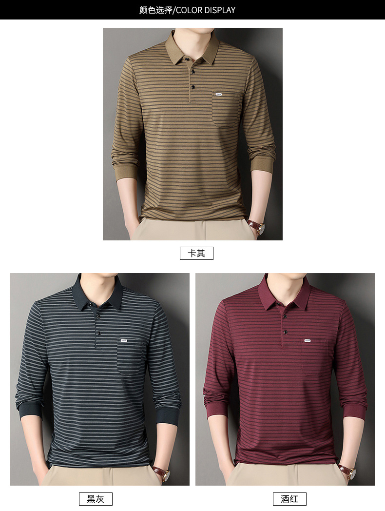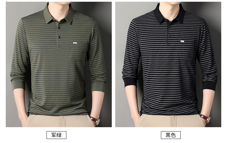 2025 라이브 방송 중년 남성 긴팔 티셔츠 얇고 루즈한 싱글 포켓 캐주얼 스트라이프 남성 카라 티셔츠 가을 아빠용스토어 가기