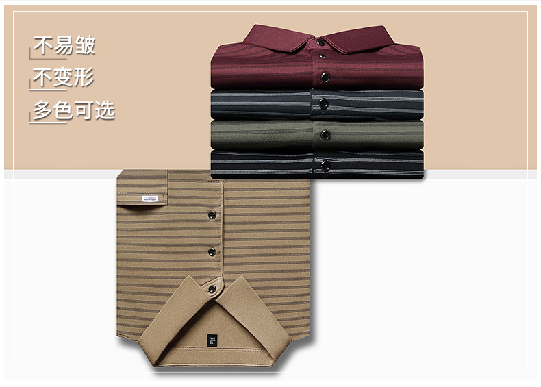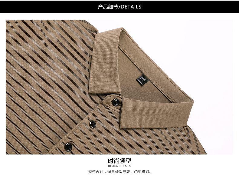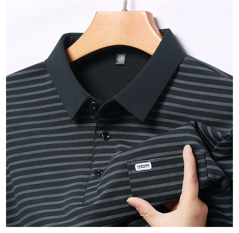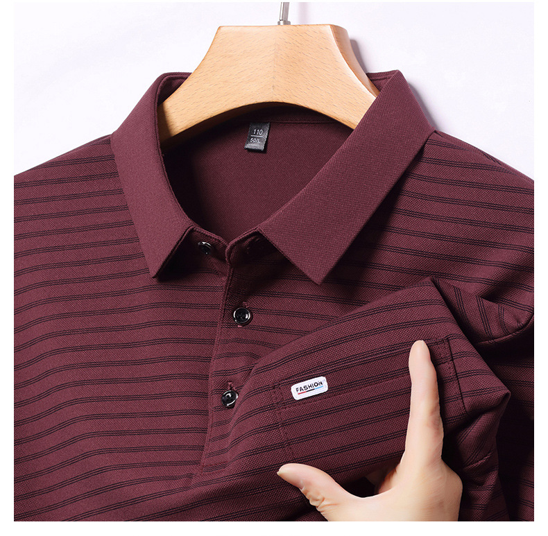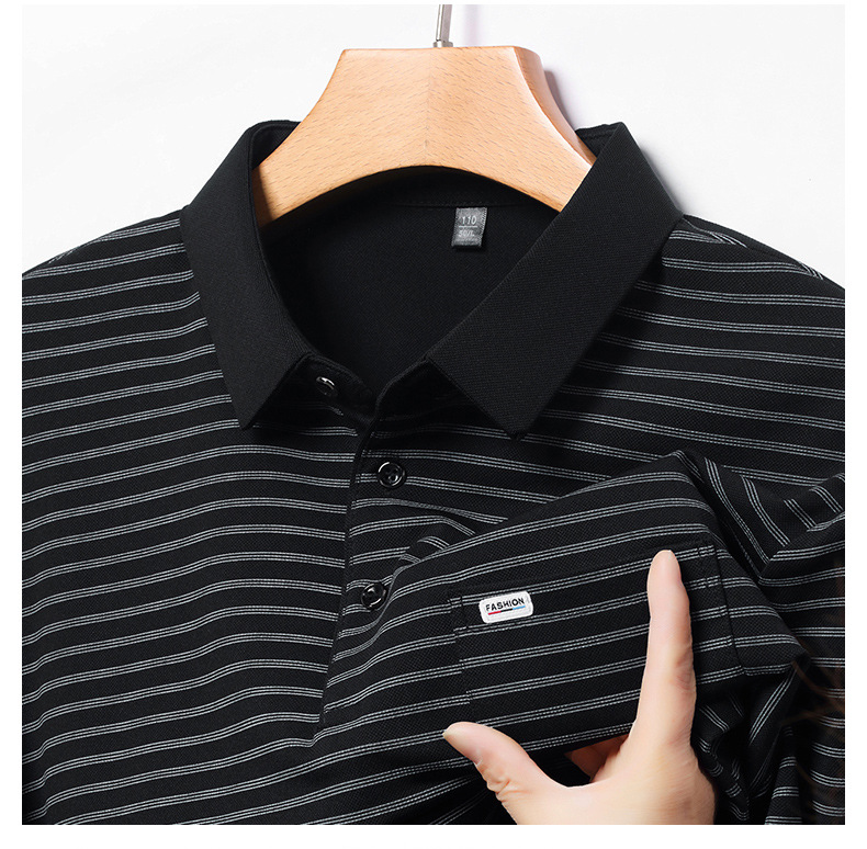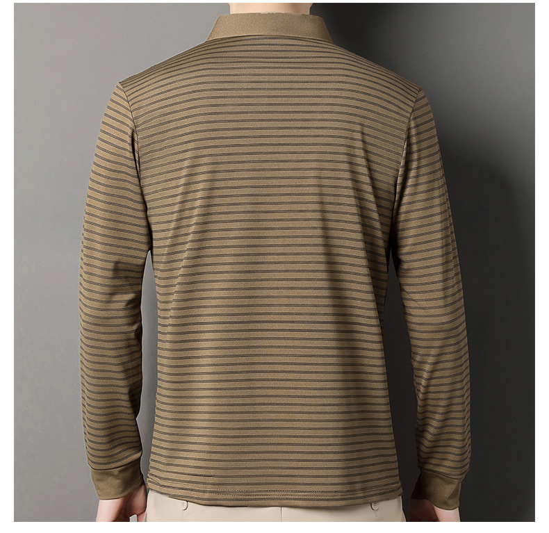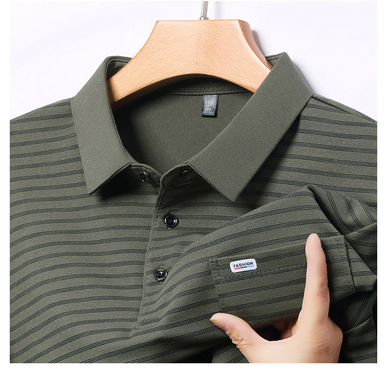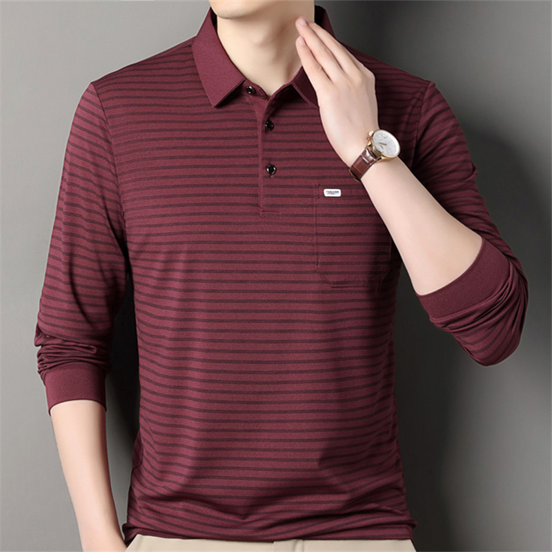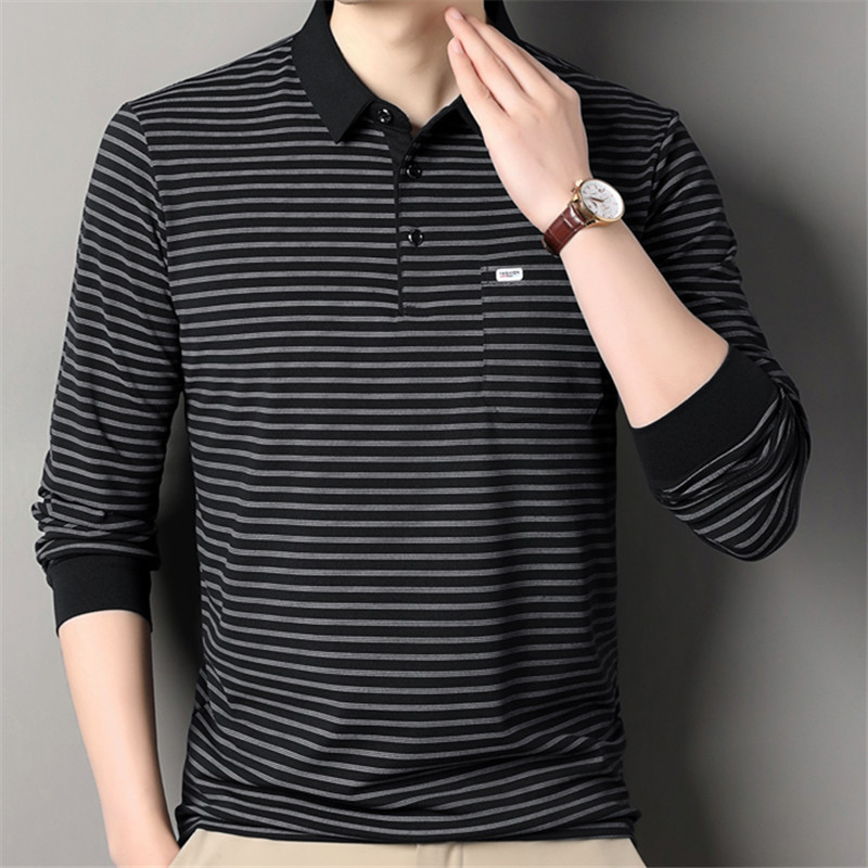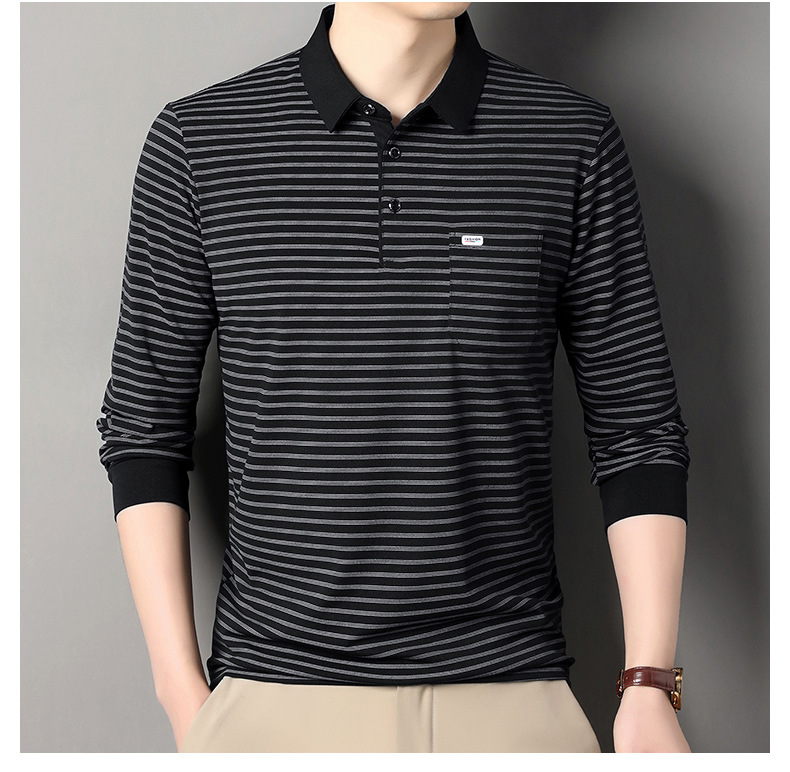 2025 라이브 방송 중년 남성 긴팔 티셔츠 얇고 루즈한 싱글 포켓 캐주얼 스트라이프 남성 카라 티셔츠 가을 아빠용스토어 가기