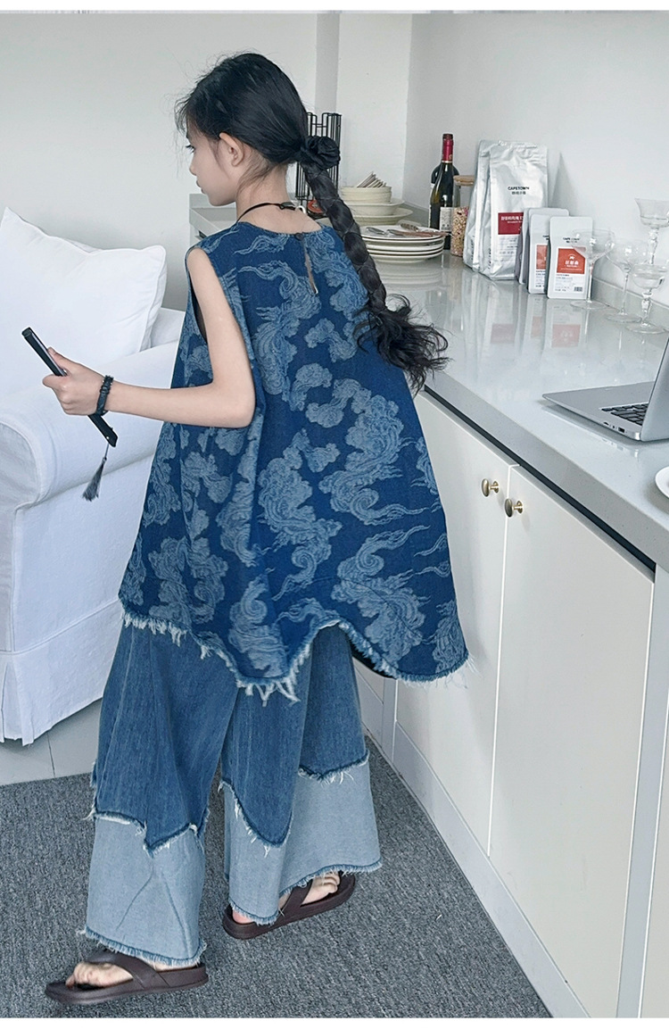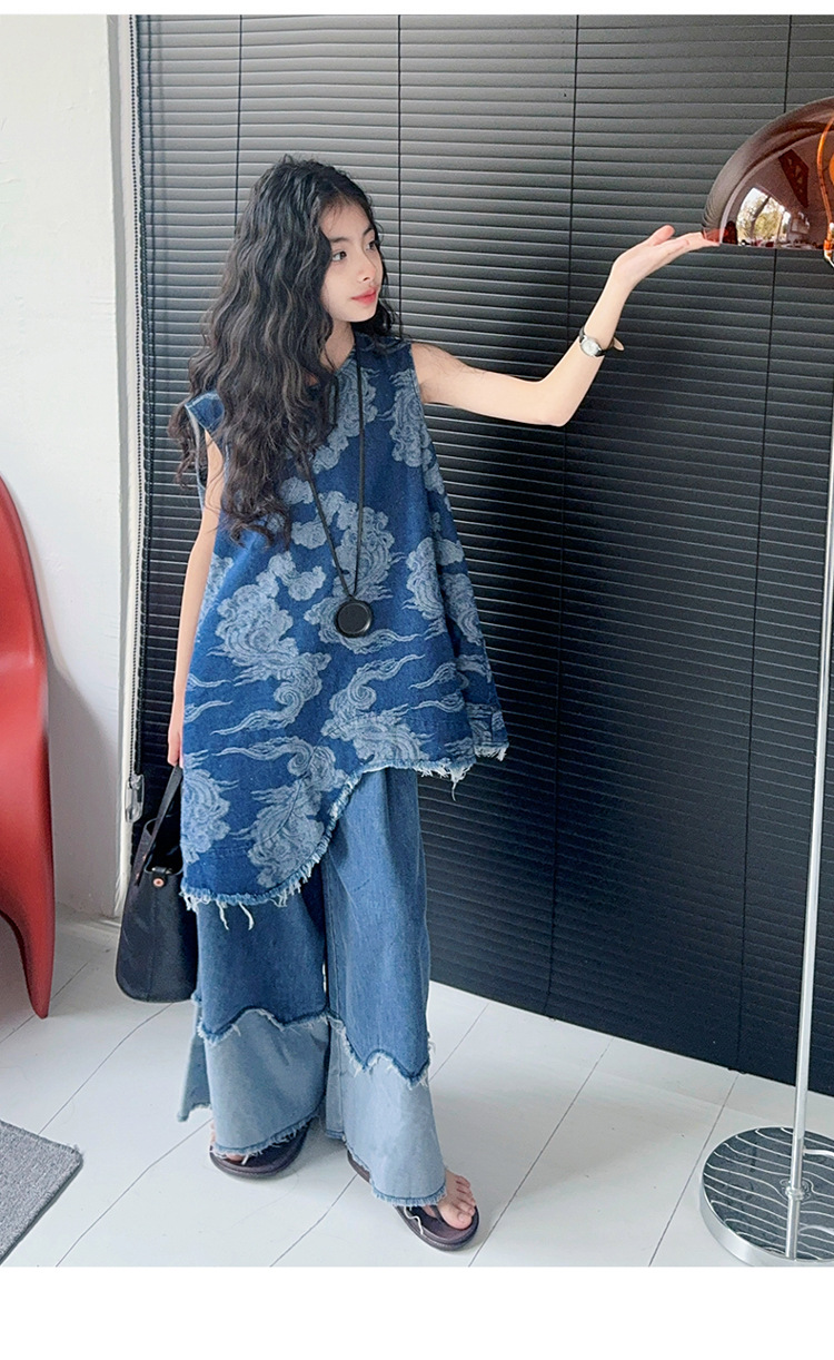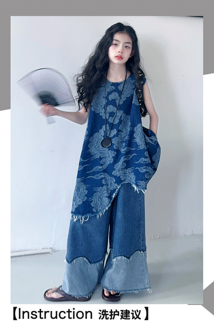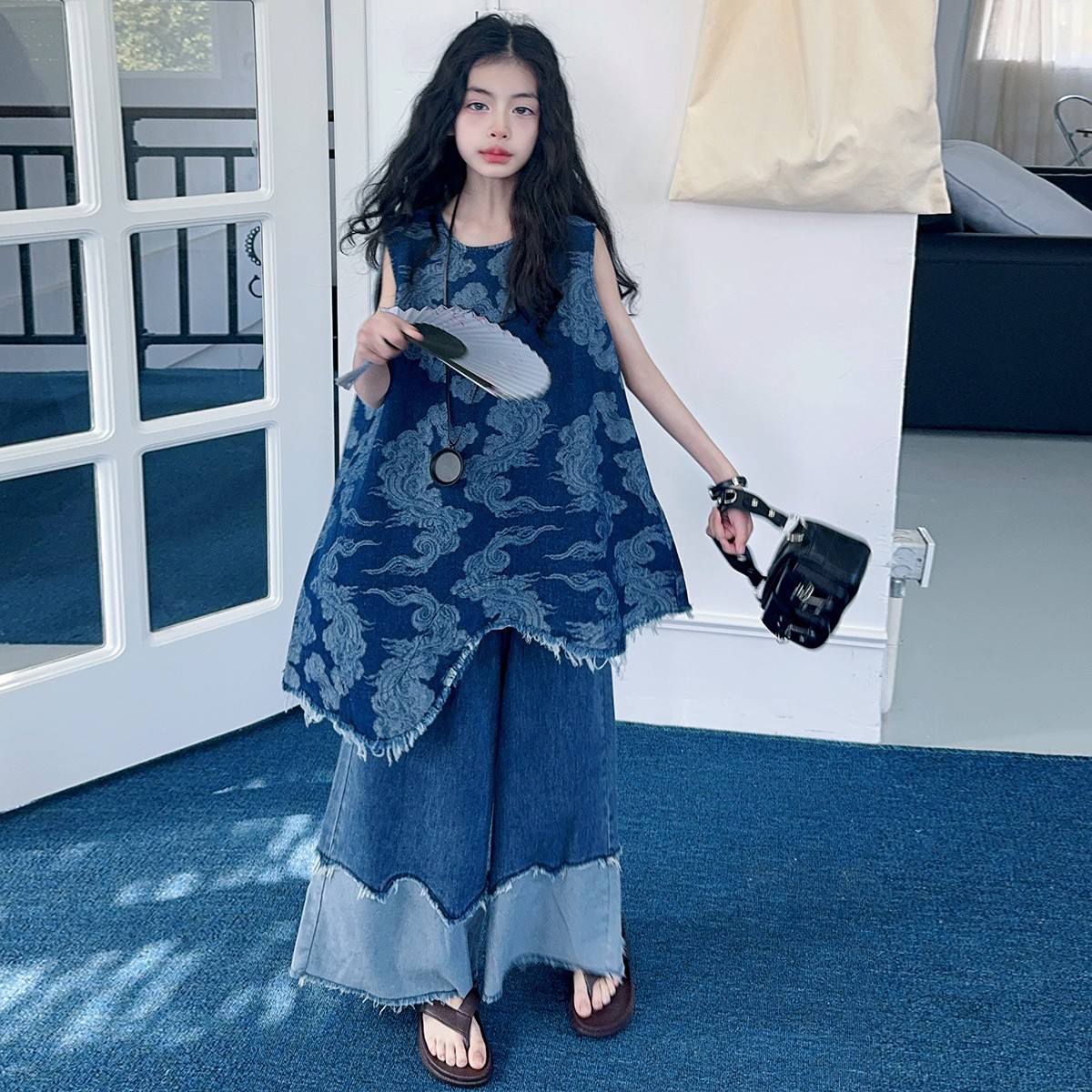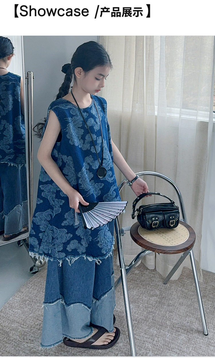 여자 2025 봄과 여름 새로운 서양식 디자인 데님 토템 크루 넥 선박 원피스 국가 스타일 데님 넓은 다리 바지 세트