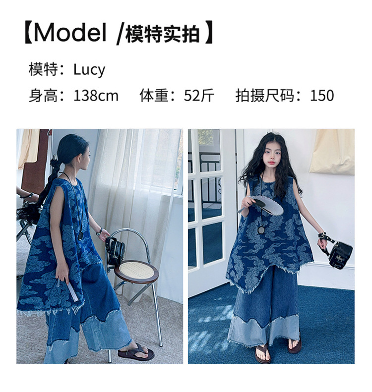 여자 2025 봄과 여름 새로운 서양식 디자인 데님 토템 크루 넥 선박 원피스 국가 스타일 데님 넓은 다리 바지 세트스토어 가기