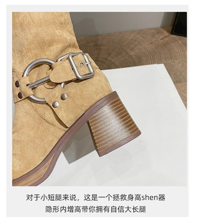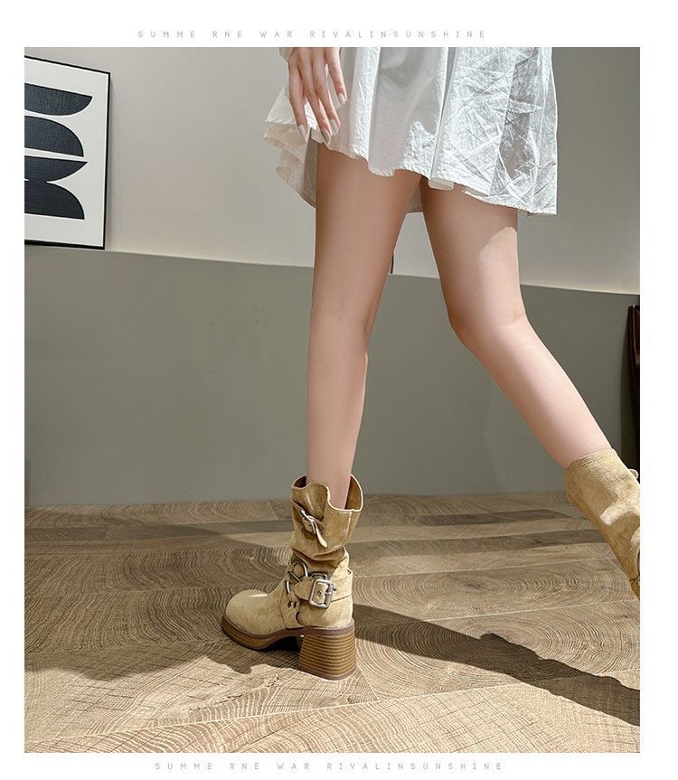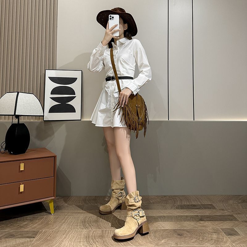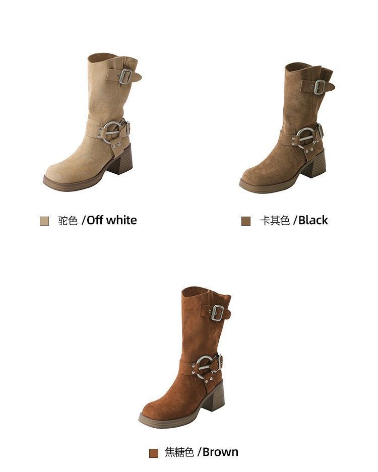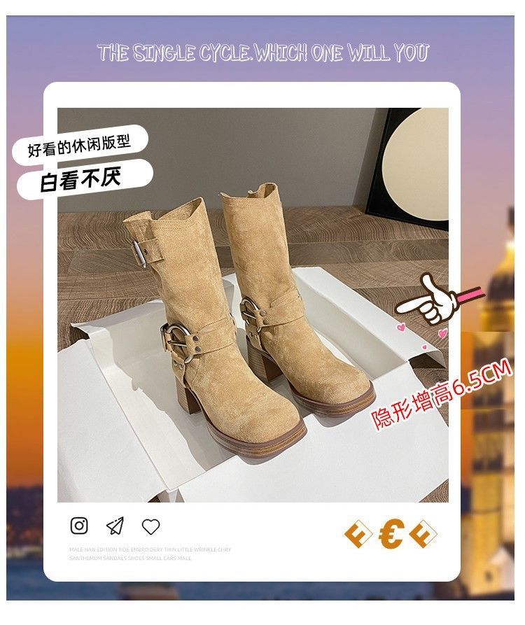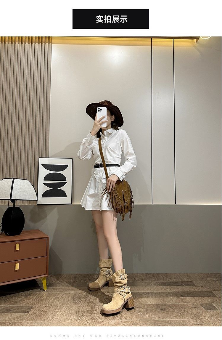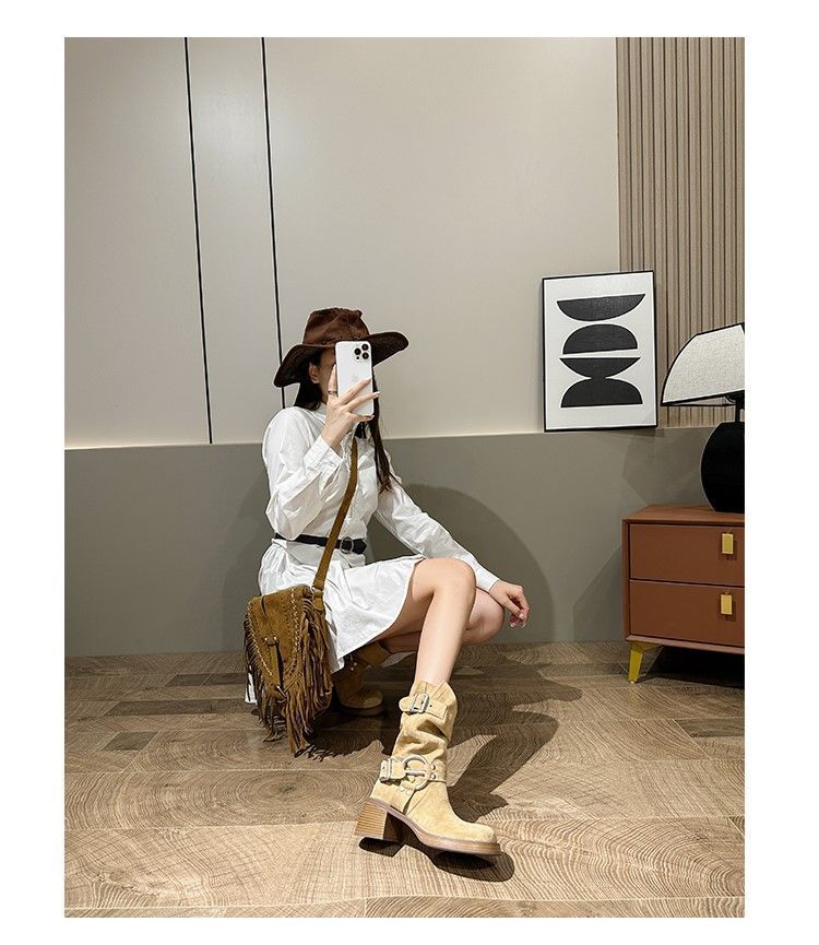 화이트 힙 부츠 여성 두꺼운 힐 하이힐 웨스턴 카우보이 부츠 봄과 가을 새로운 스웨이드 중형 부츠스토어 가기