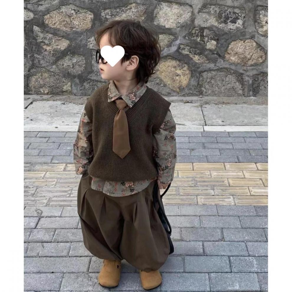 • 브라운 조끼 + 꽃무늬 셔츠, 2종 세트, 프리 타이