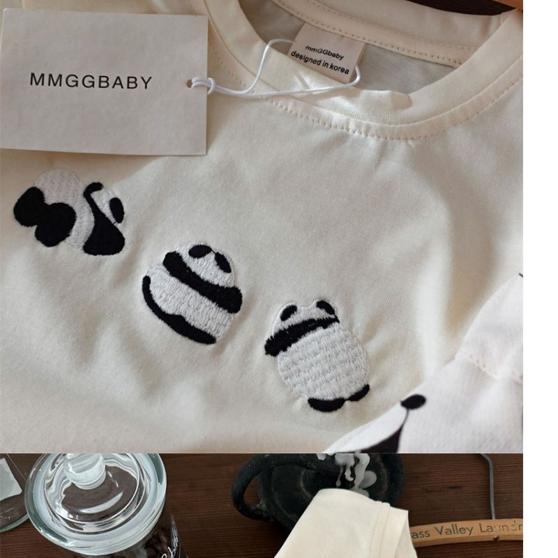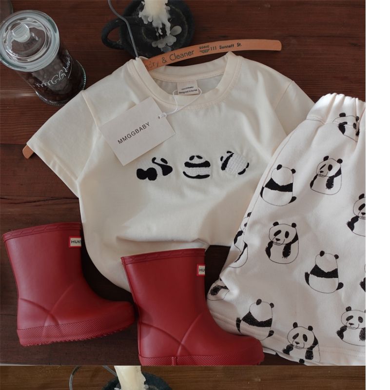 100 면화 어린이 반팔 세트 2023 여름 새 소년 소녀 아기 팬더 수 놓은 반팔 반바지 세트 t스토어 가기