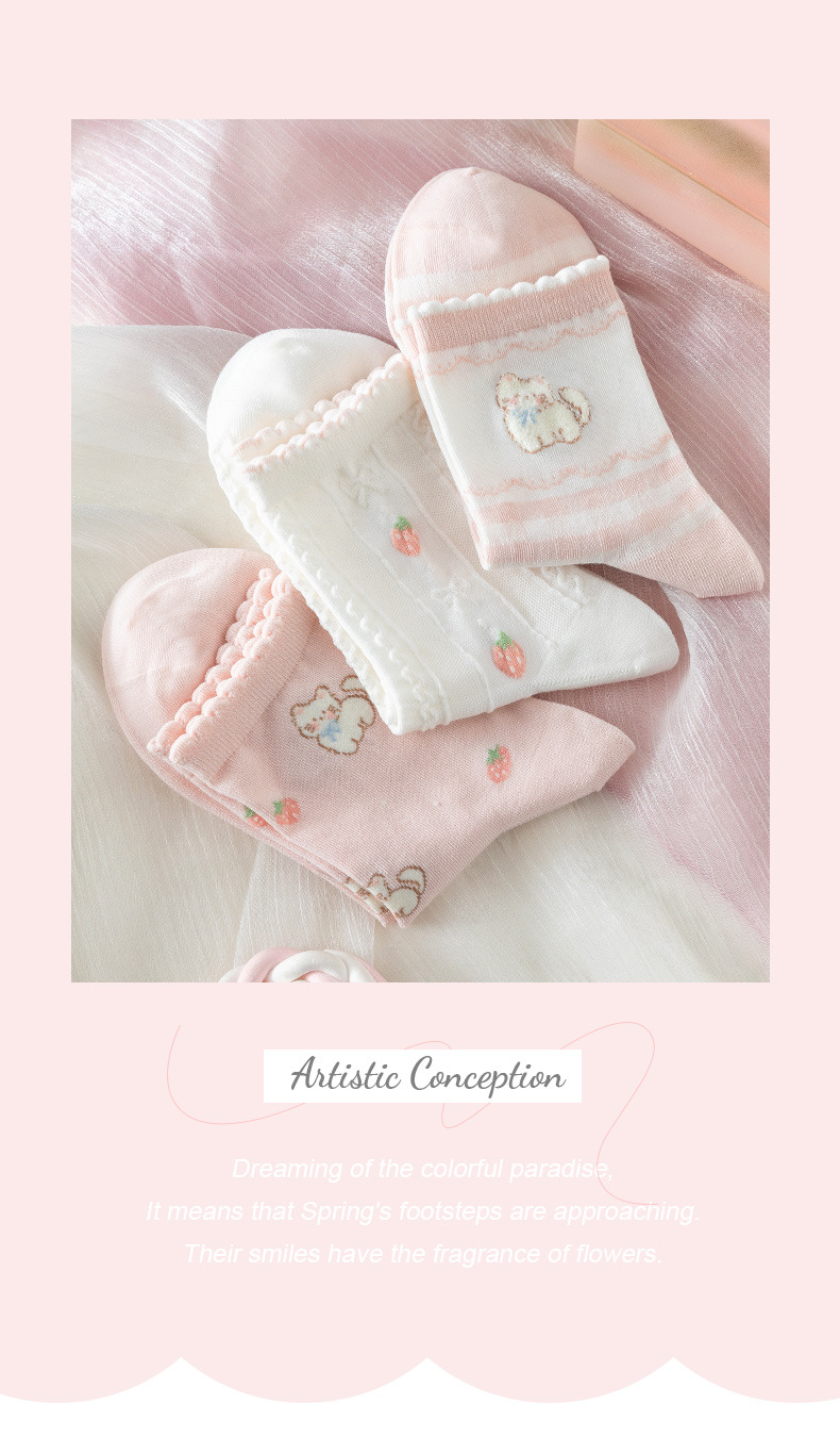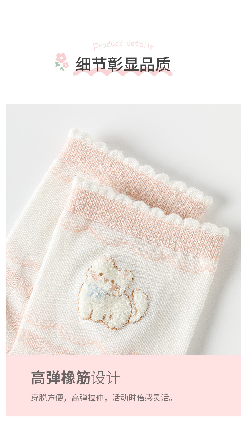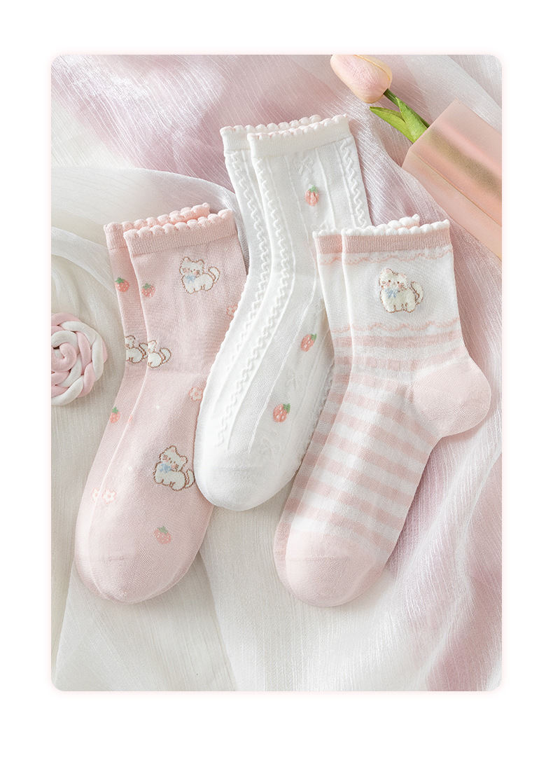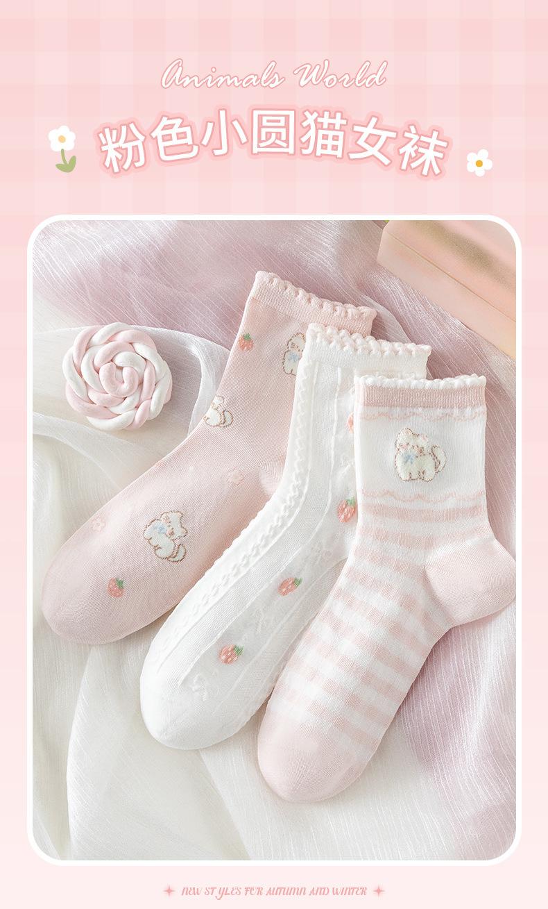 봄 여름 양말 여자 3 쌍 핑크 만화 새끼 고양이 여자의 얇은 중간 크기 양말 한국 아카데미 스타일 여성 양말 면 양말