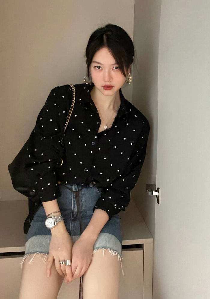 프랑스 하이 엔드 헵번 스타일 블랙 웨이브 도트 쉬폰 셔츠 여성의 봄과 가을 스택 폴로 칼라 셔츠 세련된 작은 셔츠스토어 가기