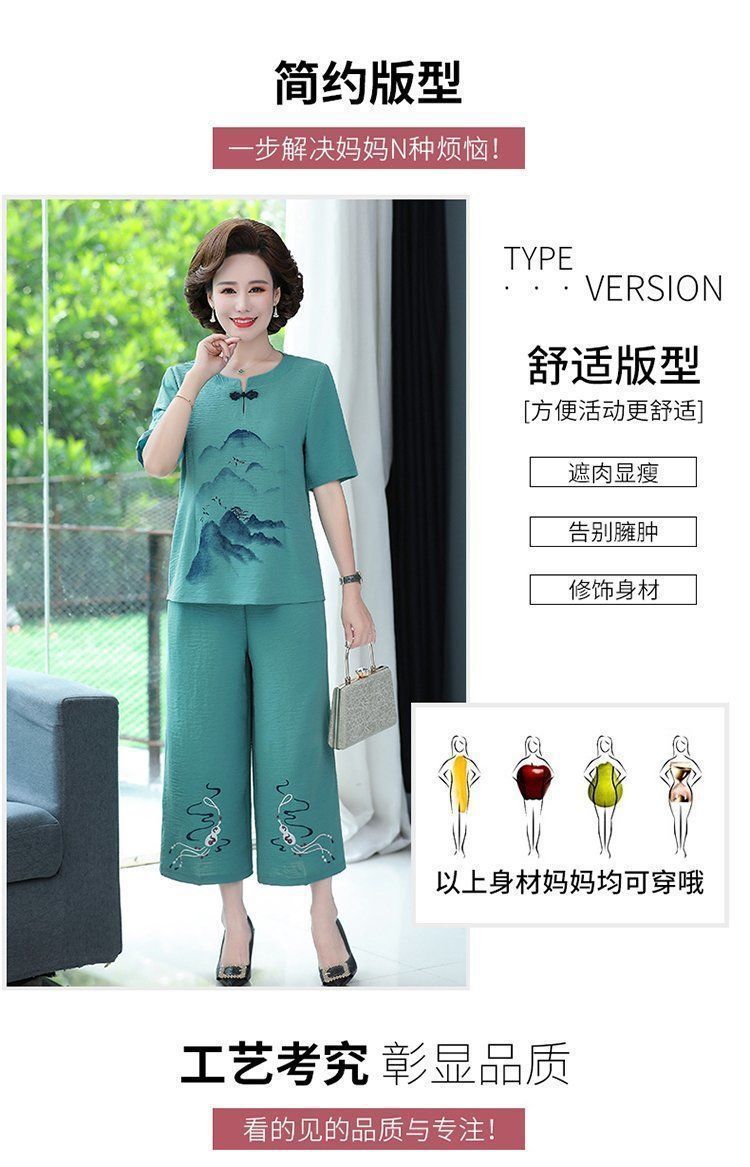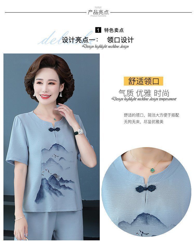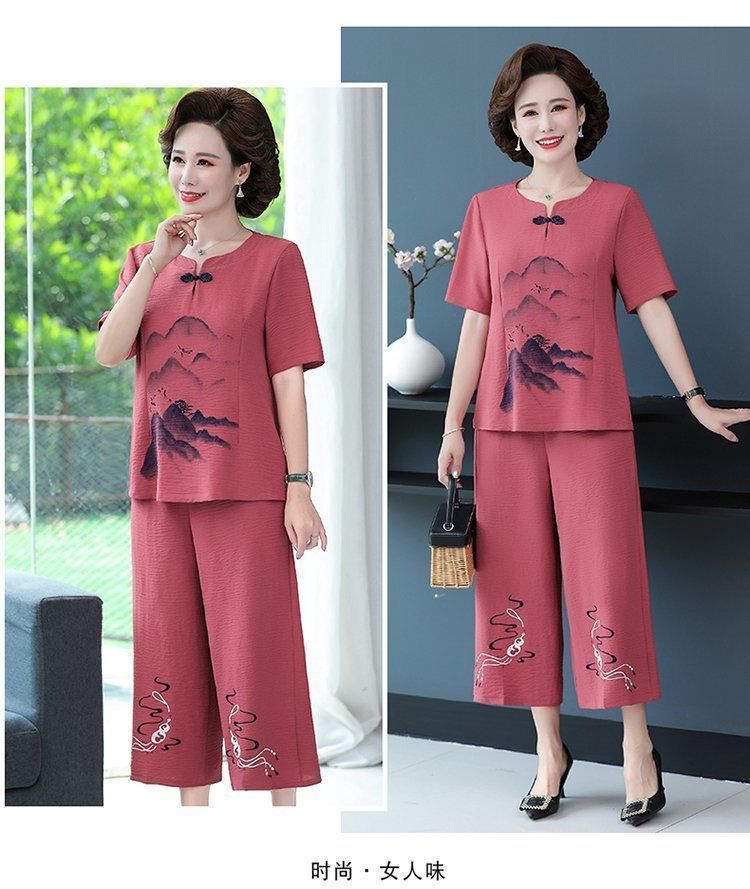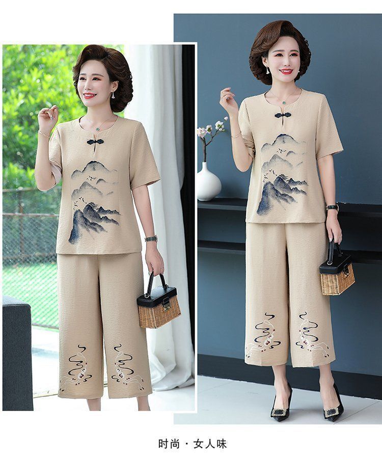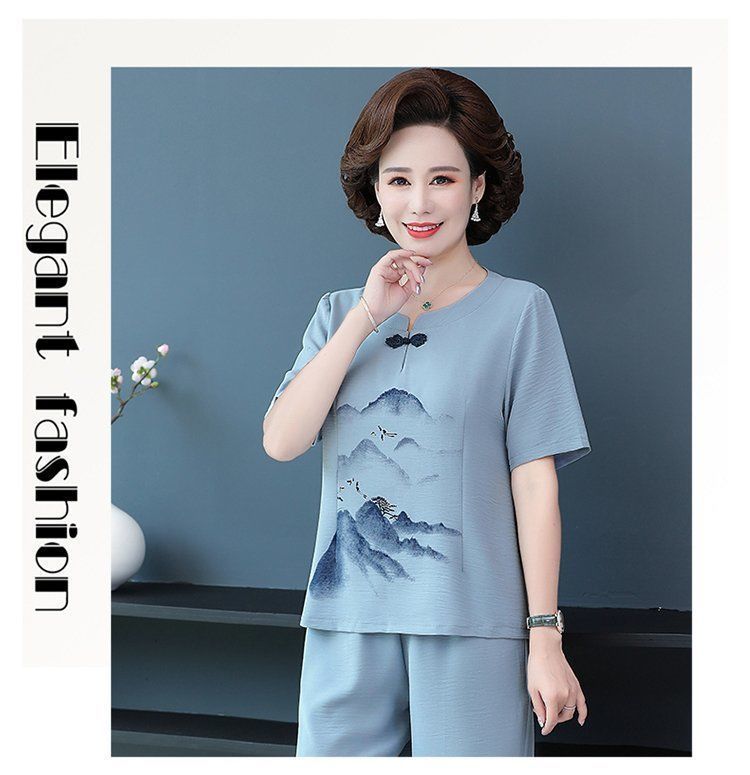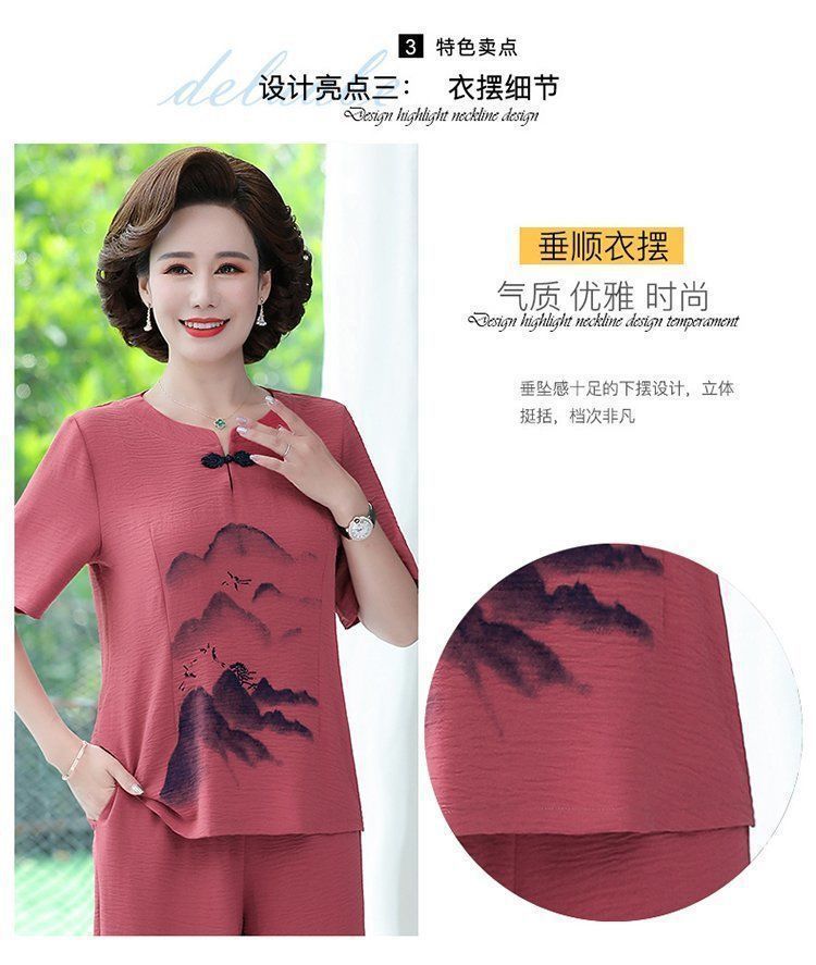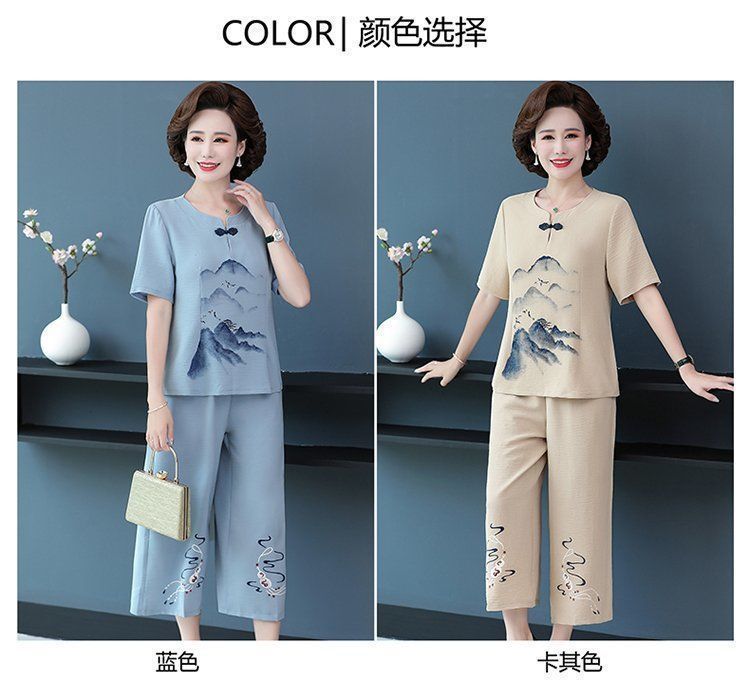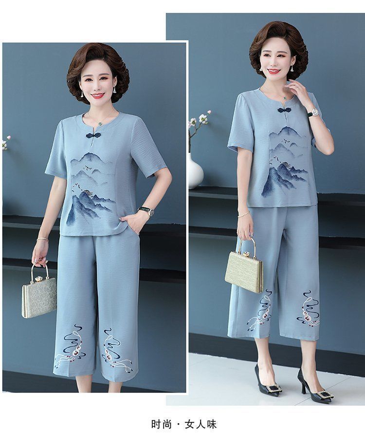 어머니의 여름 캐주얼 세트 서양식 연령 감소 5060 세 여성 느슨한 플러스 사이즈 탑 바지 투피스 세트