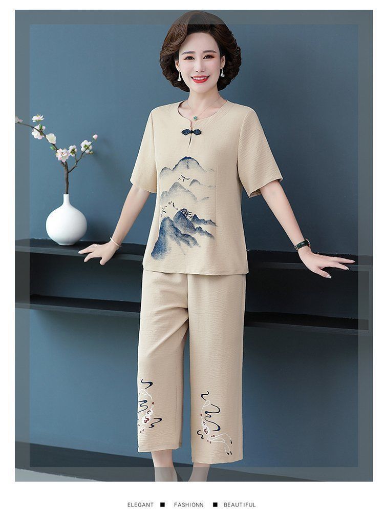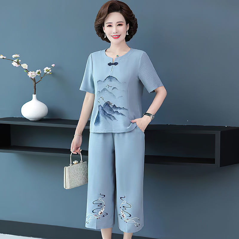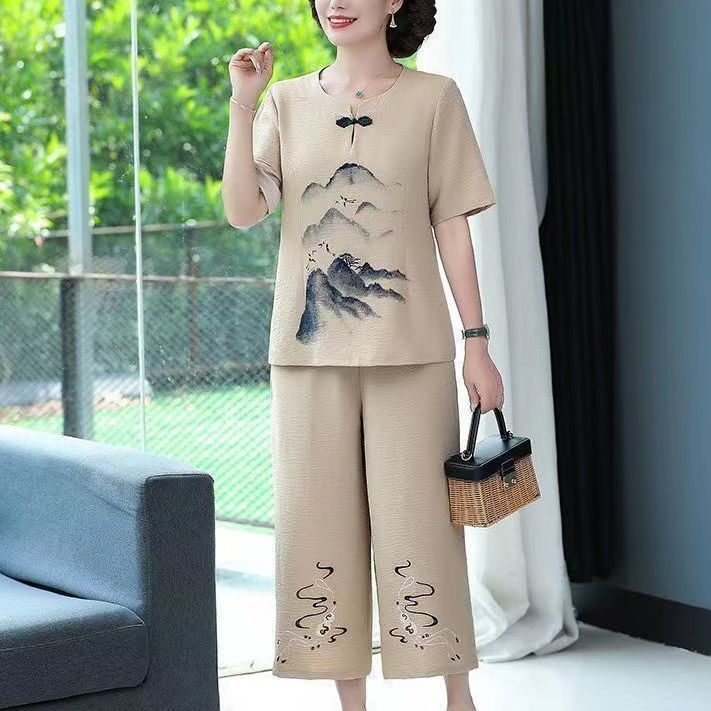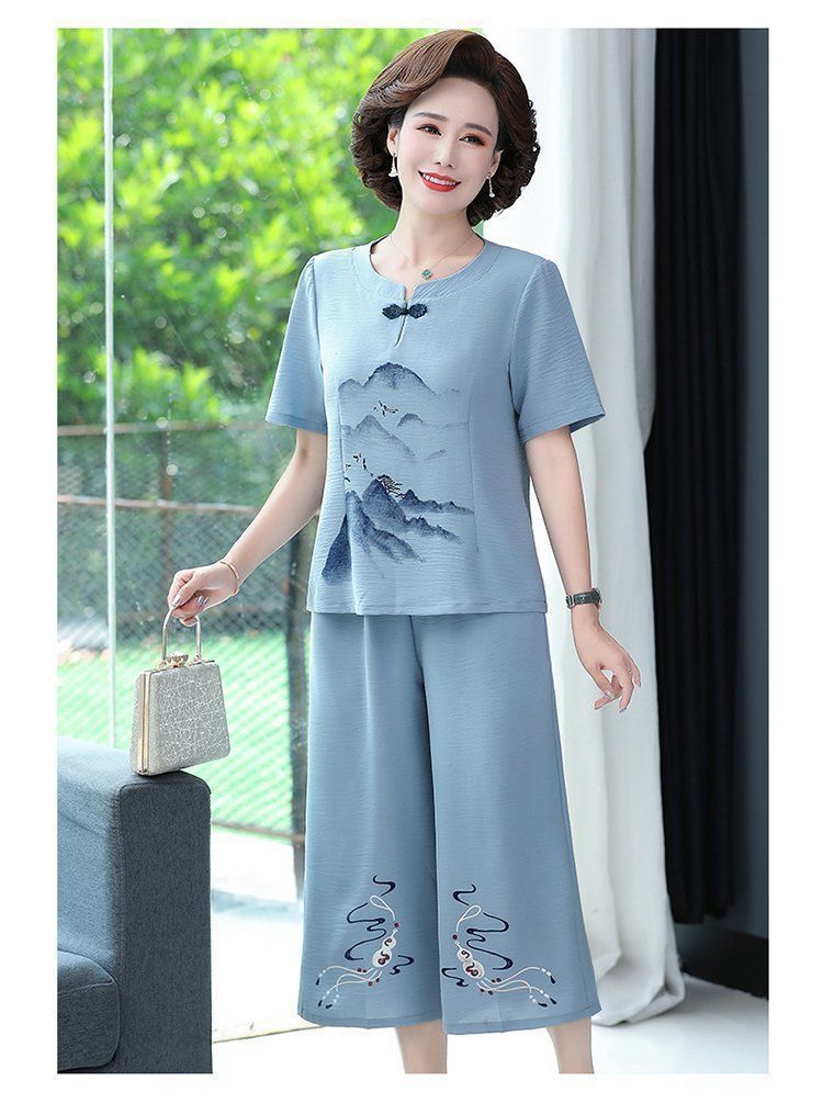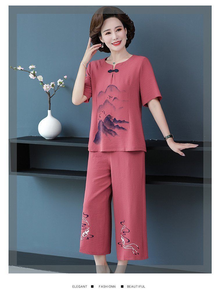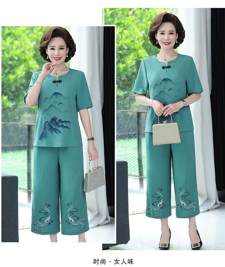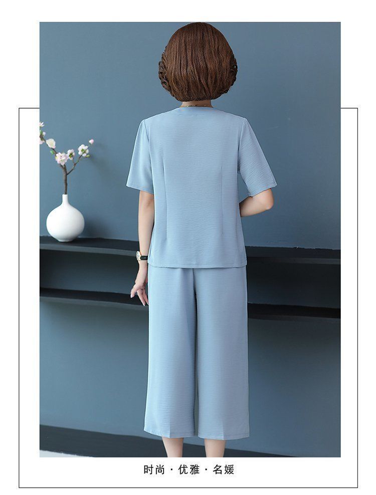 어머니의 여름 캐주얼 세트 서양식 연령 감소 5060 세 여성 느슨한 플러스 사이즈 탑 바지 투피스 세트