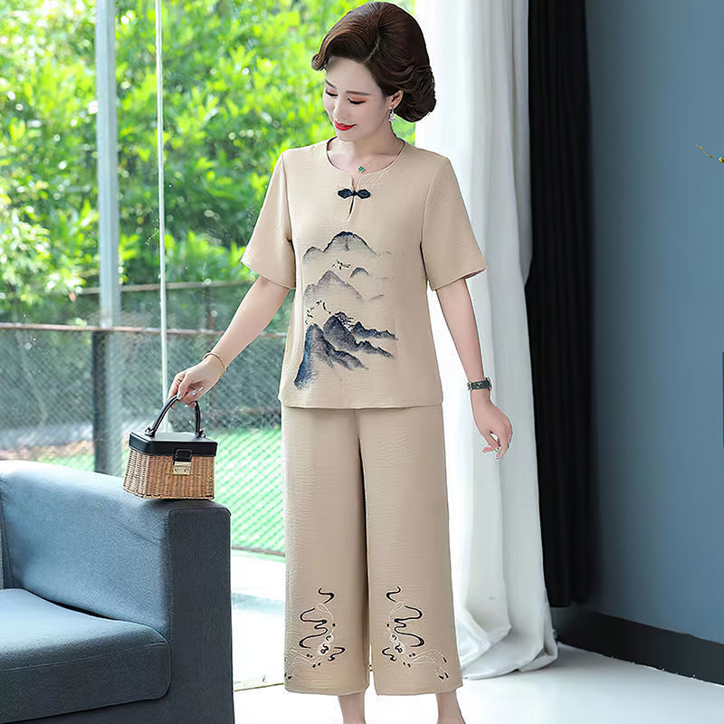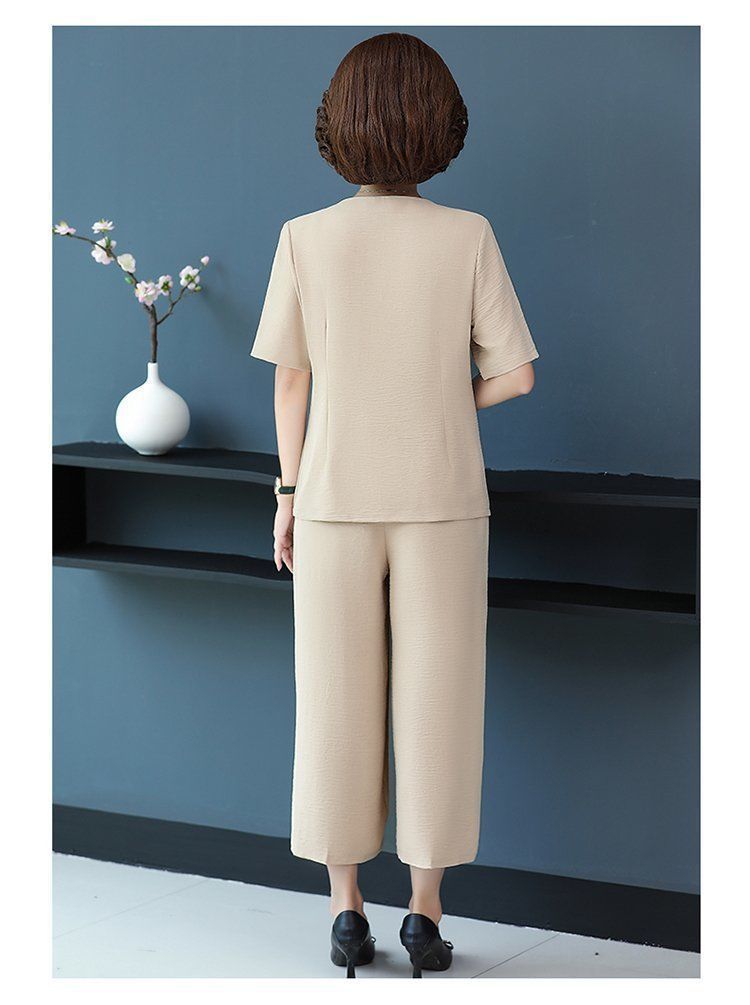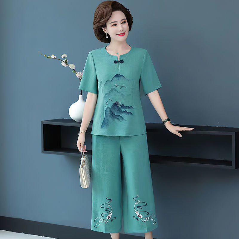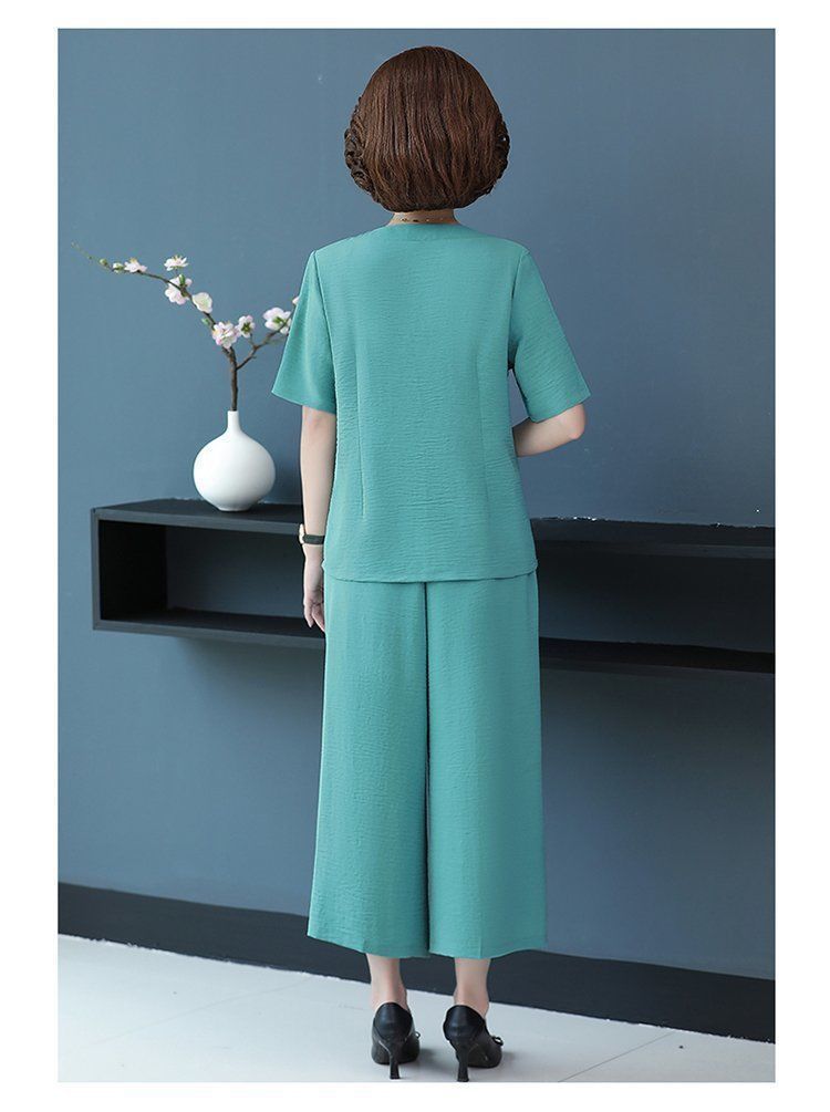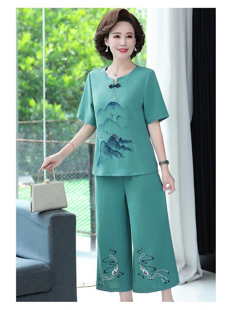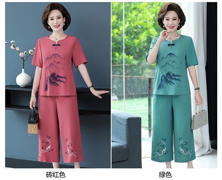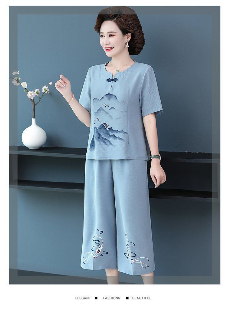 어머니의 여름 캐주얼 세트 서양식 연령 감소 5060 세 여성 느슨한 플러스 사이즈 탑 바지 투피스 세트