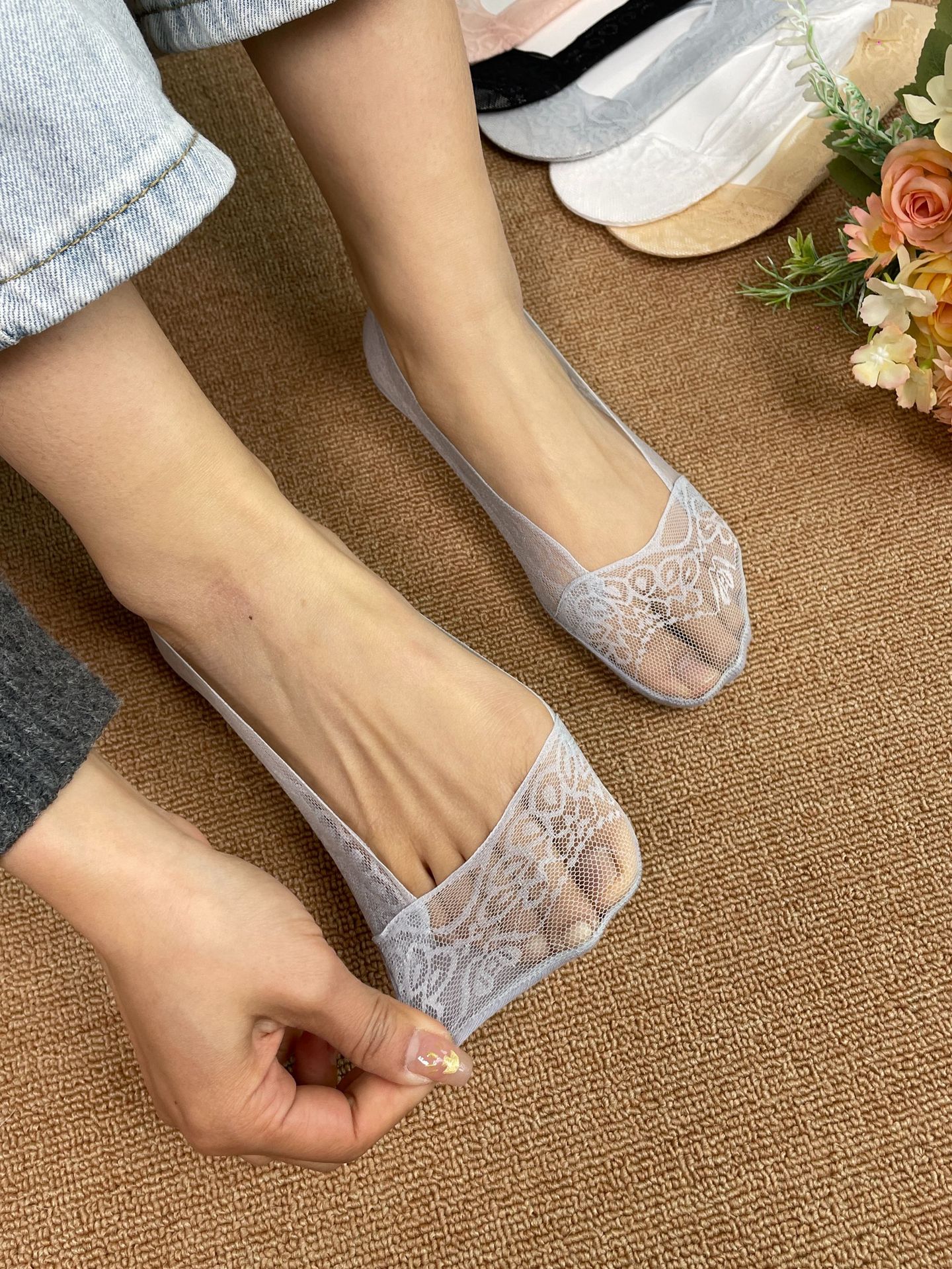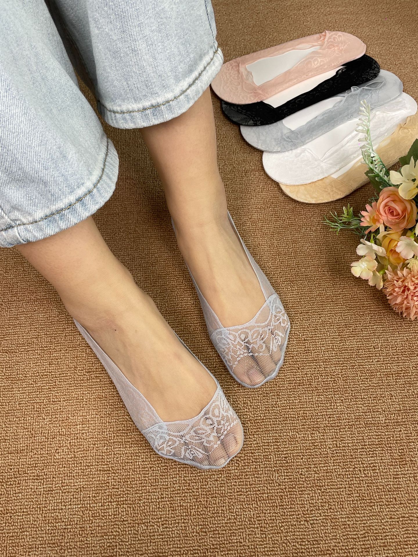 Lanfengling 레이스 양말 여름 얇은 통기성 땀 흡수 미끄럼 방지 실리콘 보트 양말 여성용 얇은 보이지 않는 양말