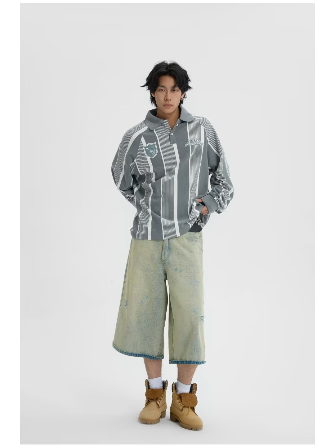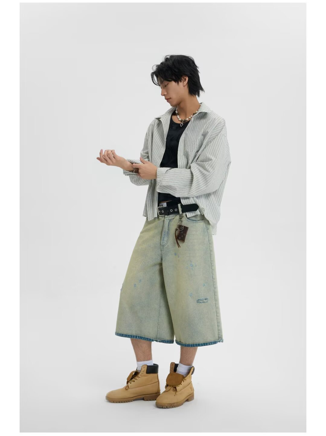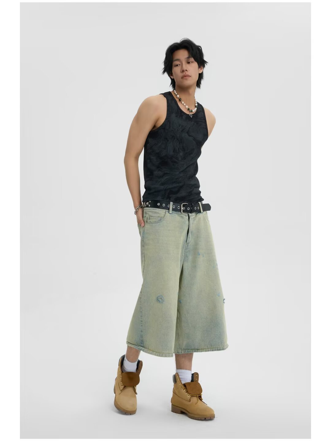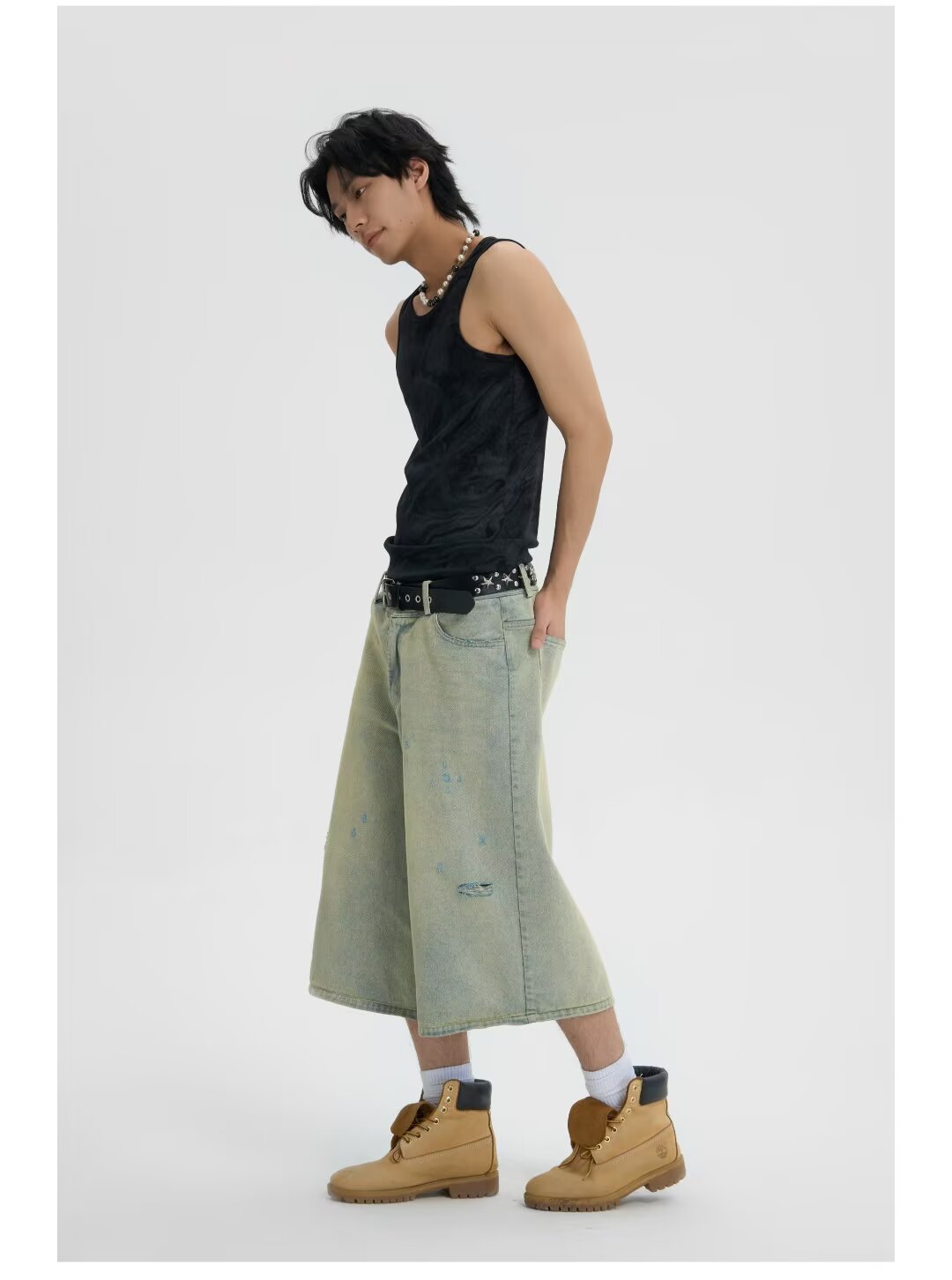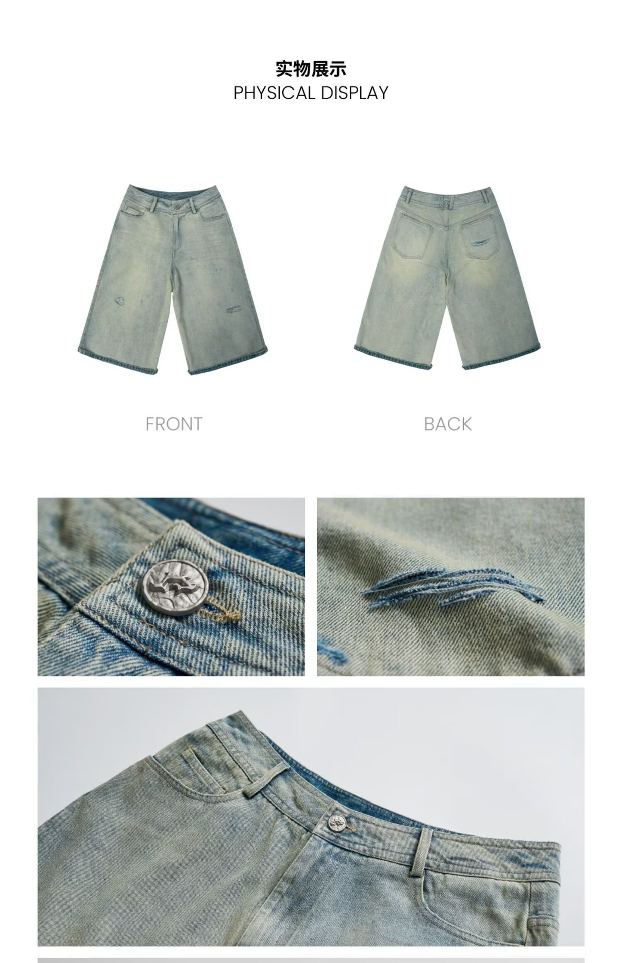 미국 스타일의 복고풍 남성과 여성을위한 오래된 찢어진 바지 여름 디자인 감각 느슨한 캐주얼 와이드 다리 데님 바지스토어 가기