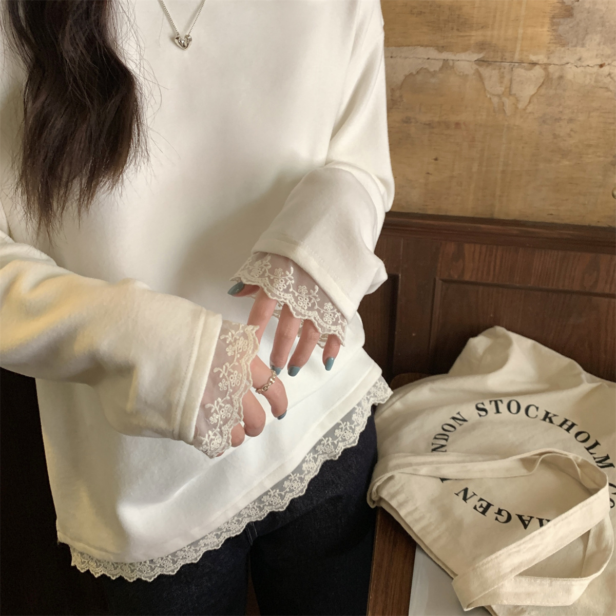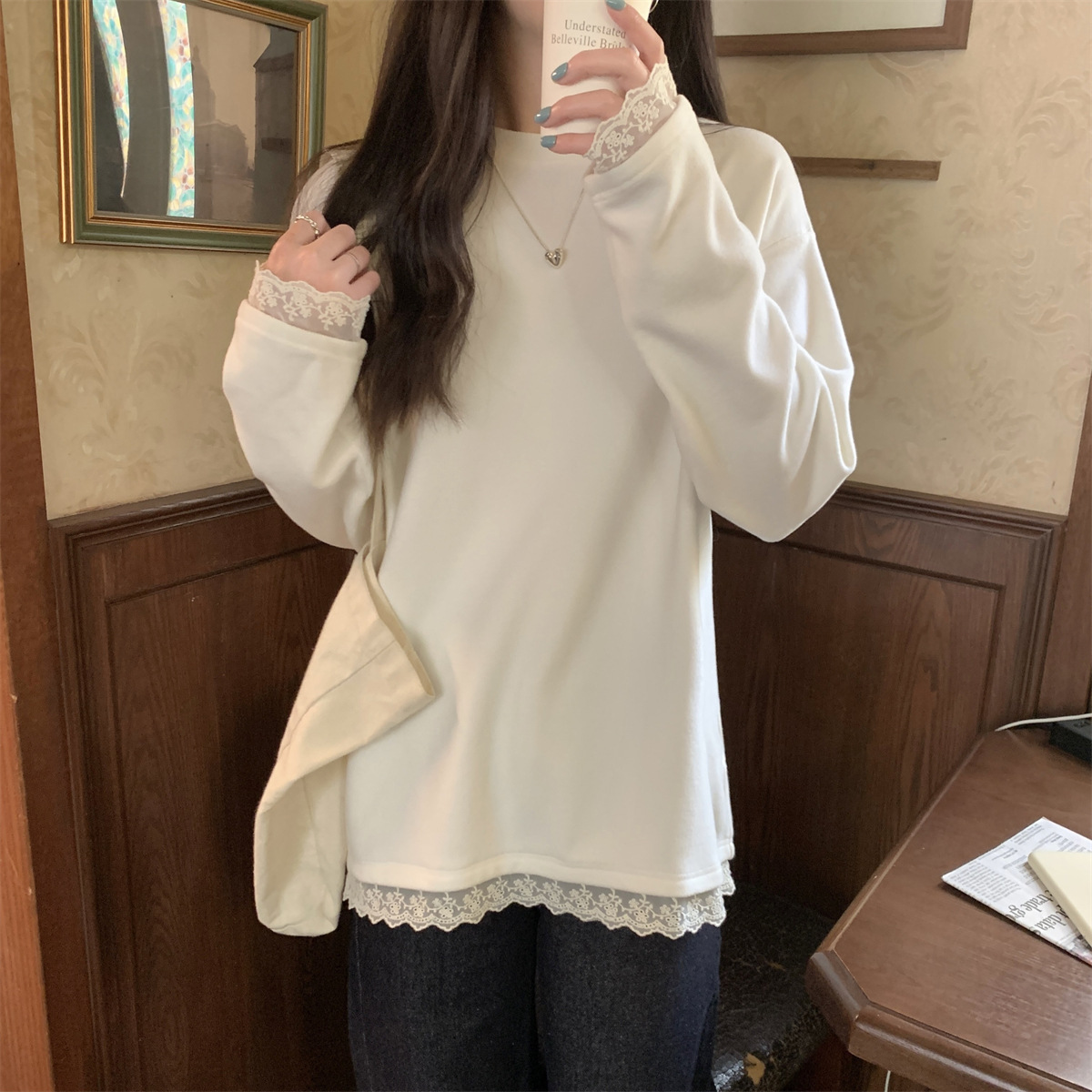 흰색 긴팔 티셔츠 봄 한국 둥근 목 느슨한 디자인 레이스 스티칭 뜨거운 소녀 조커 재킷 도매스토어 가기