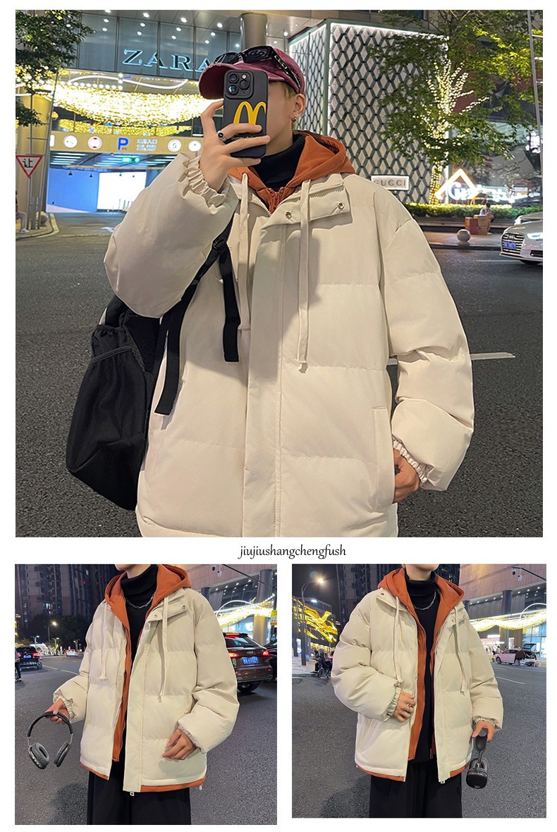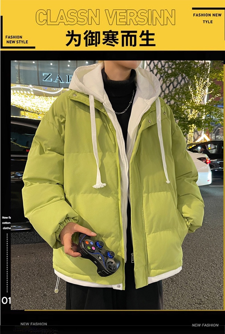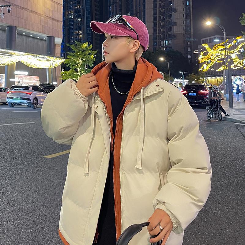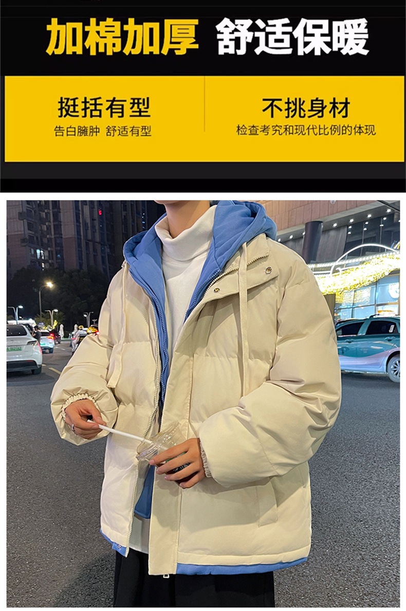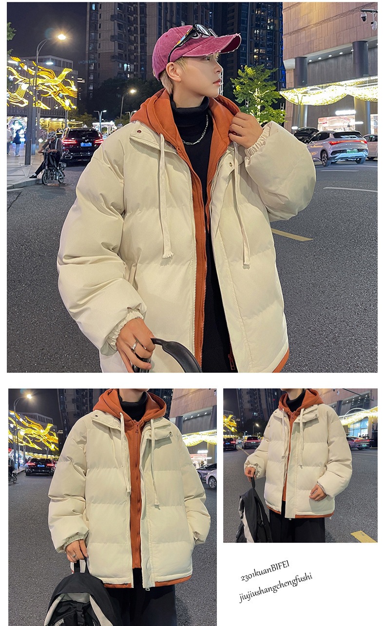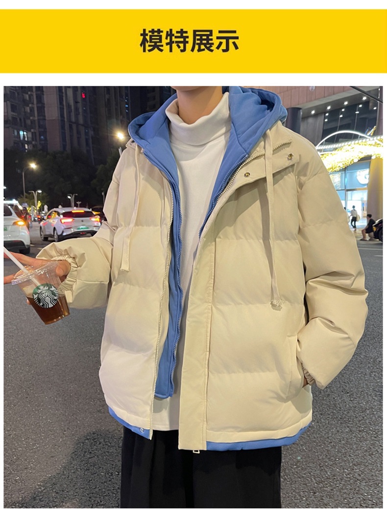 2301 겨울 대비 색상 바느질 가짜 투피스 커플 면 패딩 재킷 유행 후드 두꺼운 면 패딩 의류 남성용 루즈 따뜻한스토어 가기