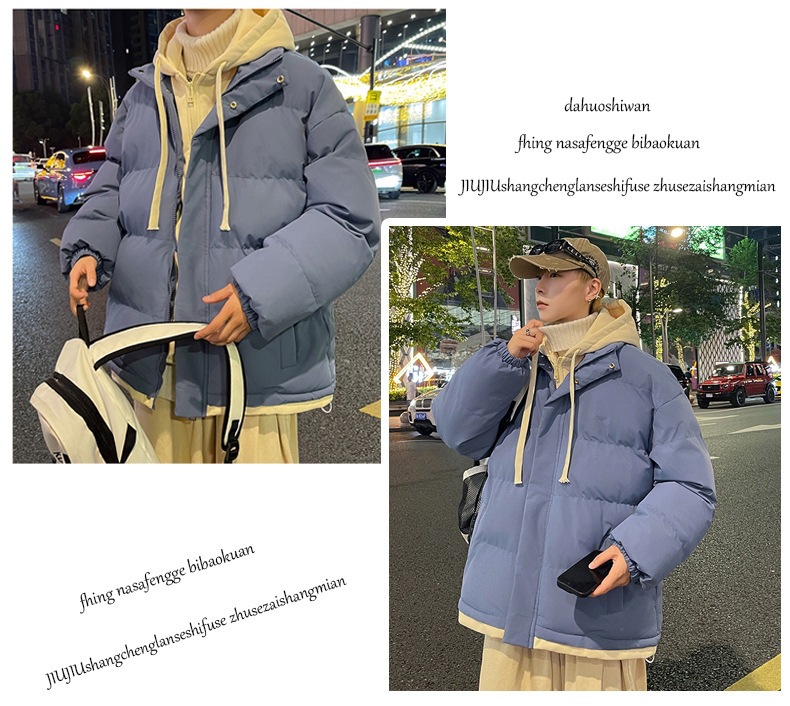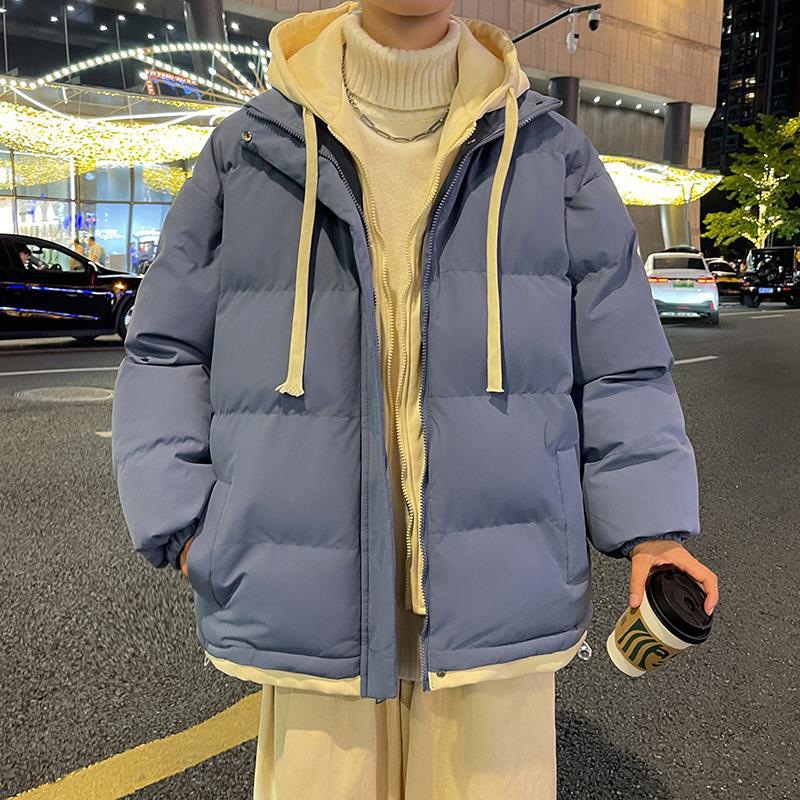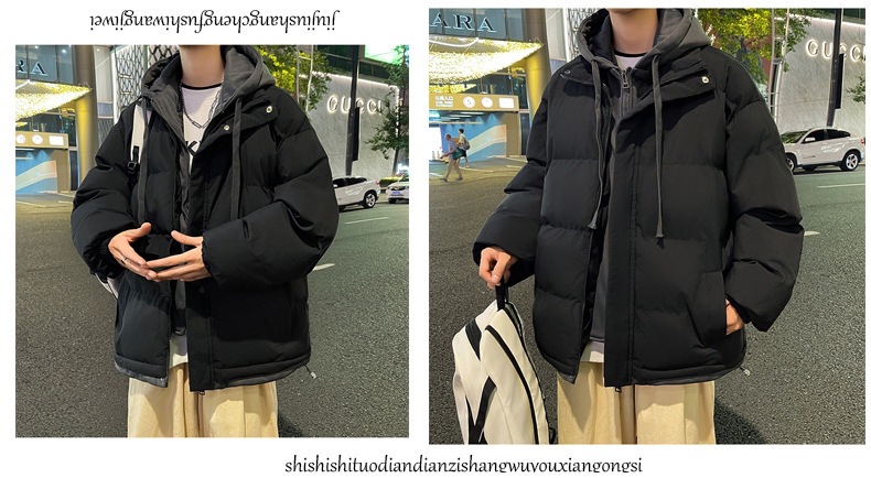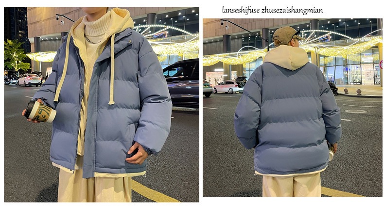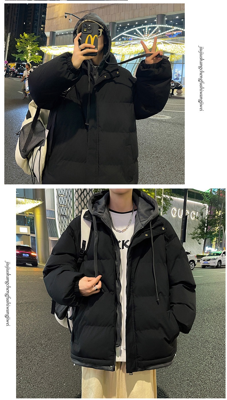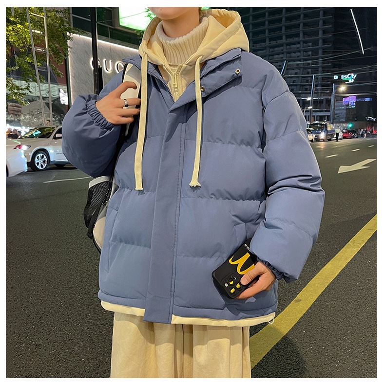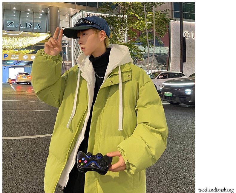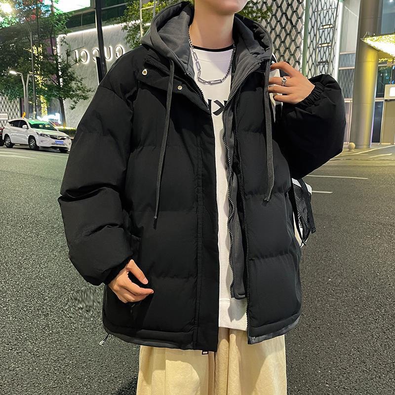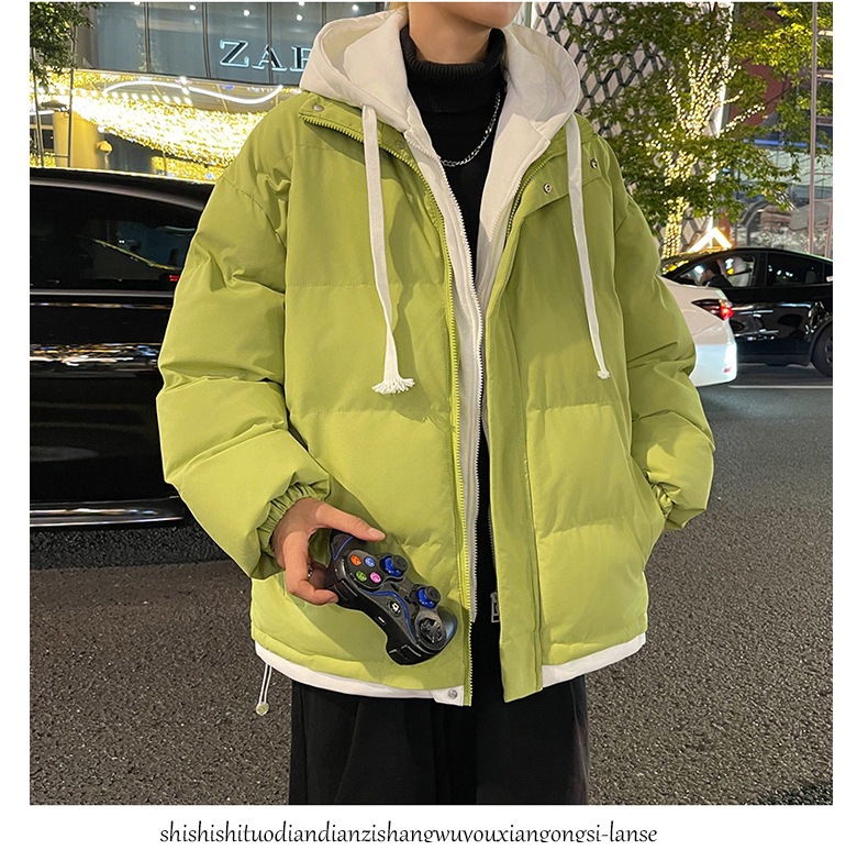 2301 겨울 대비 색상 바느질 가짜 투피스 커플 면 패딩 재킷 유행 후드 두꺼운 면 패딩 의류 남성용 루즈 따뜻한스토어 가기