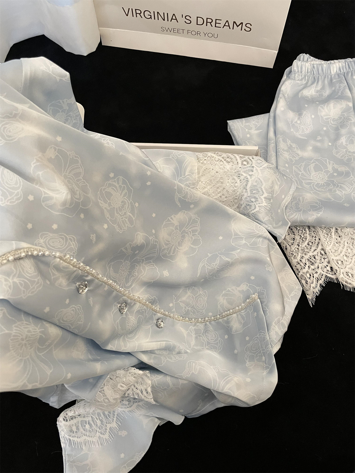 【재고 있음】 고급스러운 여성용 잠옷 봄 가을 신상 아이스 실크 가디건 레이스 긴바지 홈웨어 세트 외출복스토어 가기
