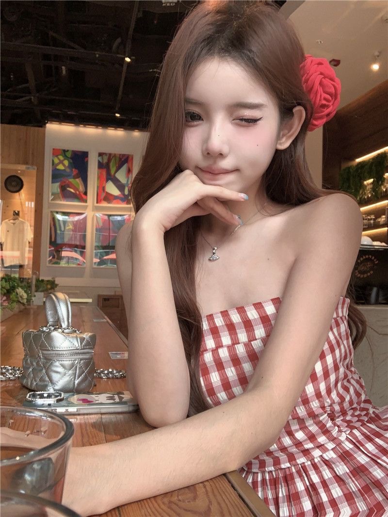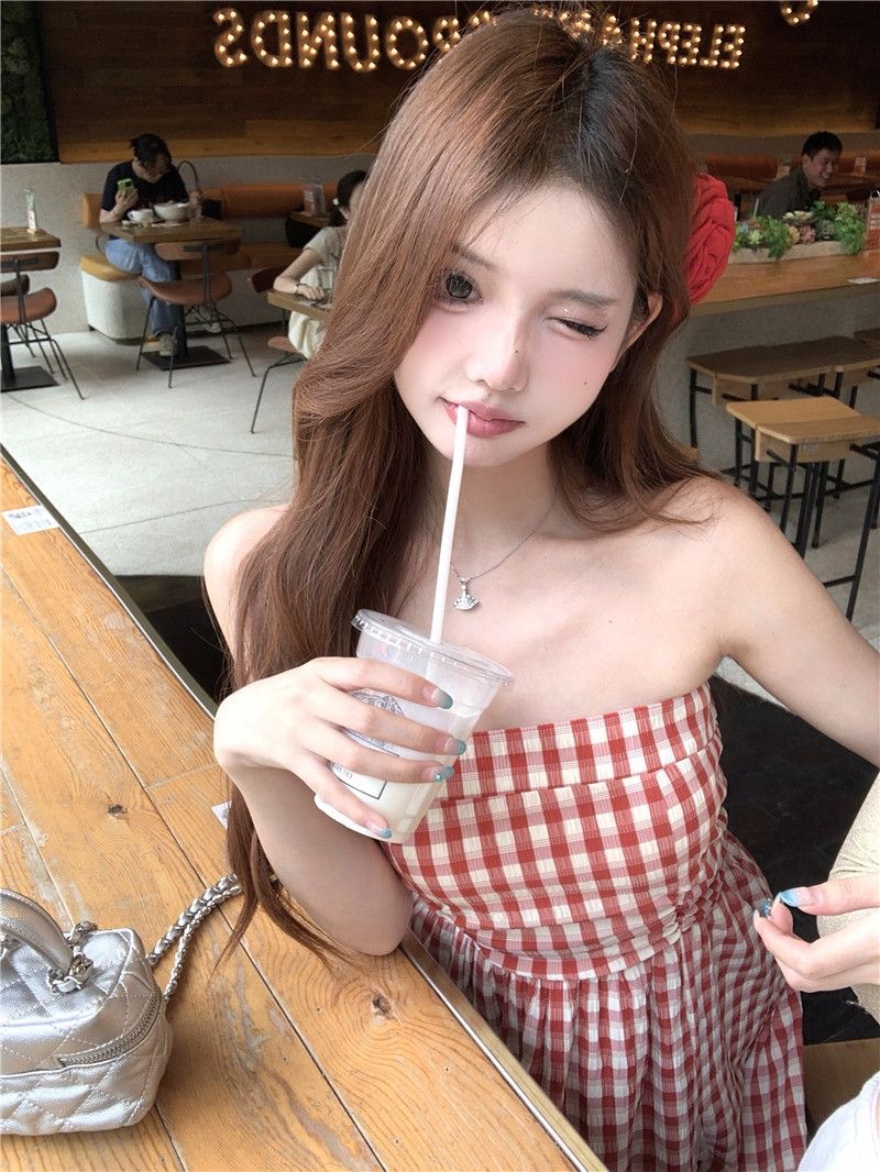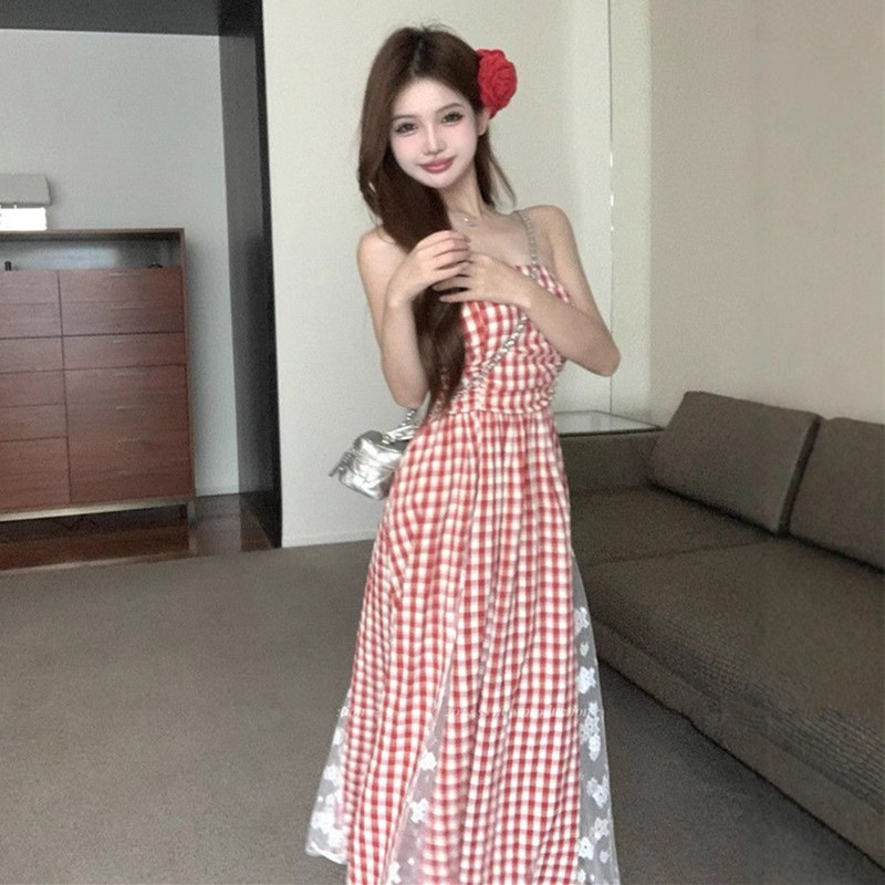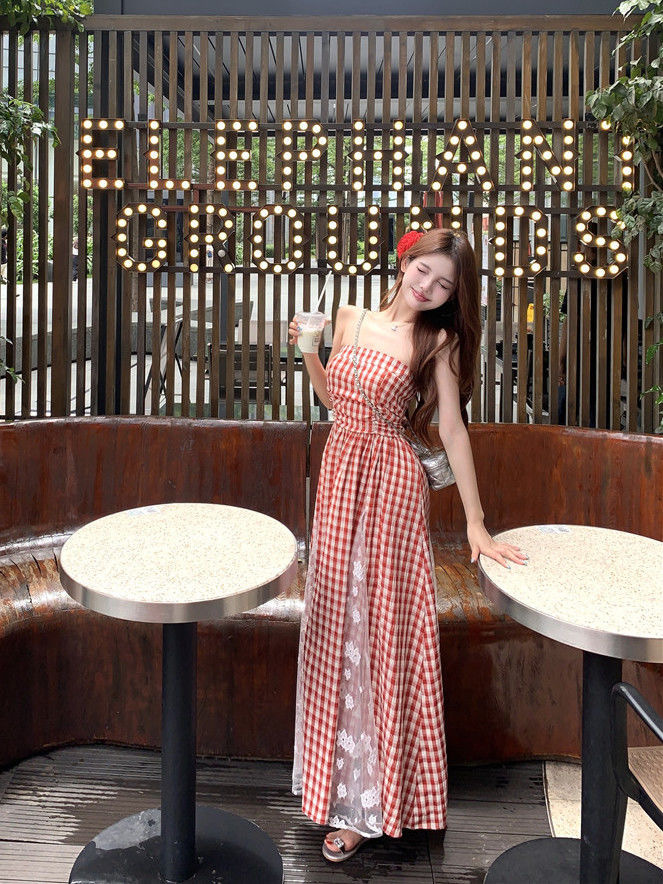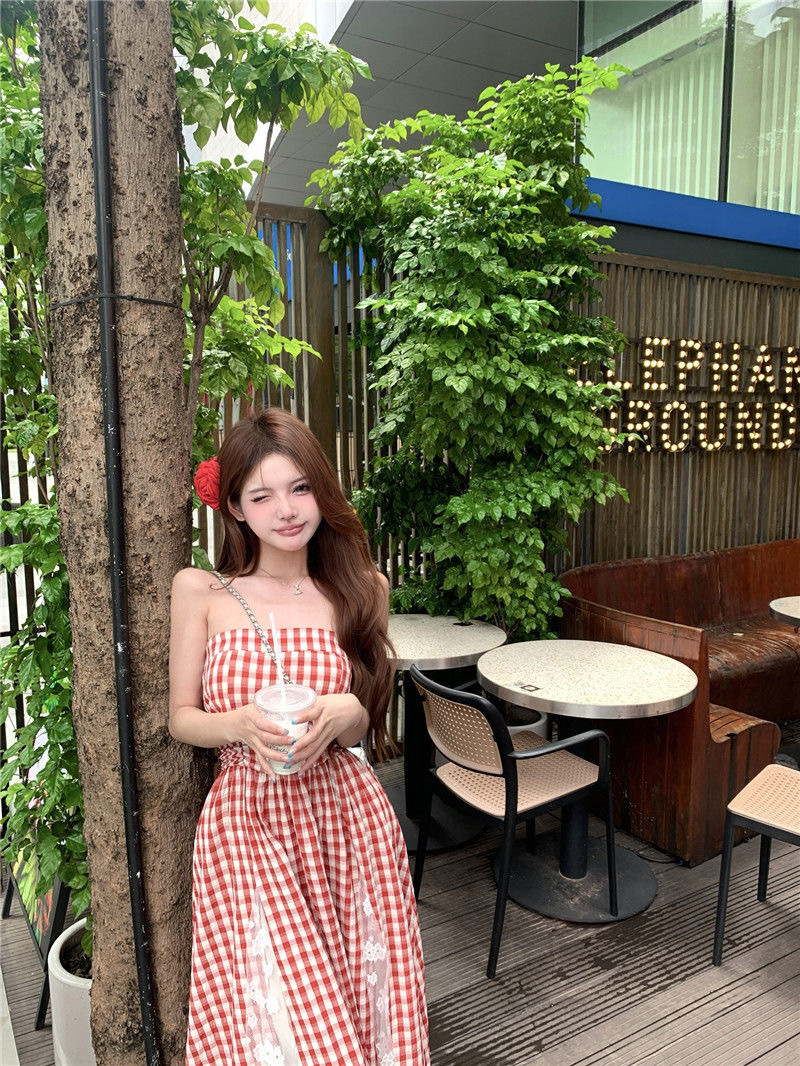 격자 무늬 레이스 스티칭 중공업 스트랩리스 원피스 2025 년 새 여름 한국 스타일 우아한 허리 슬리밍 여성용 긴 원피스스토어 가기
