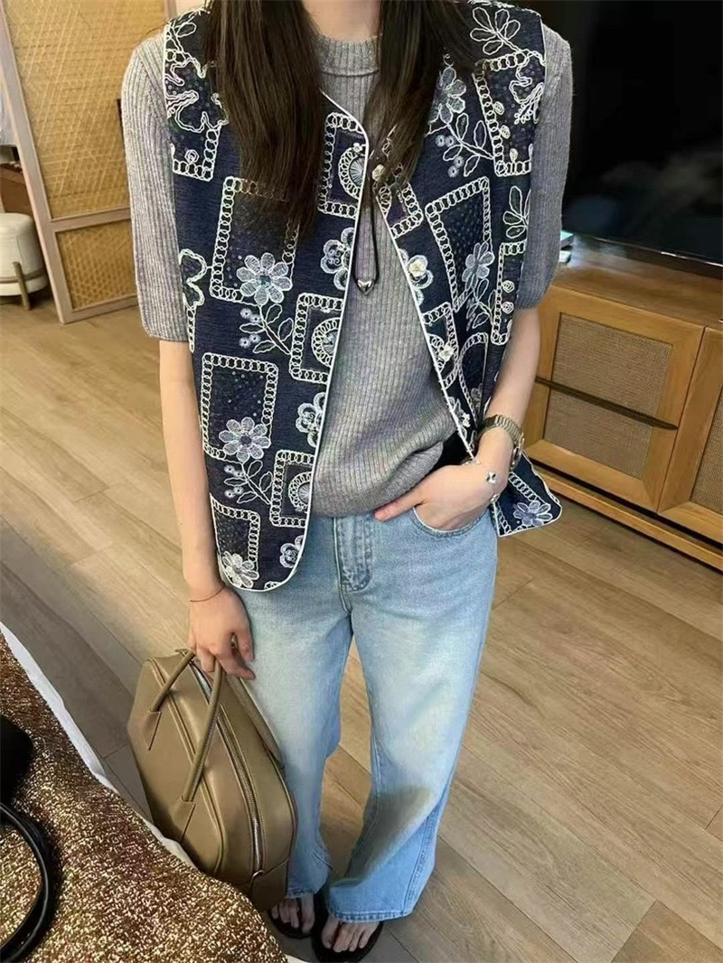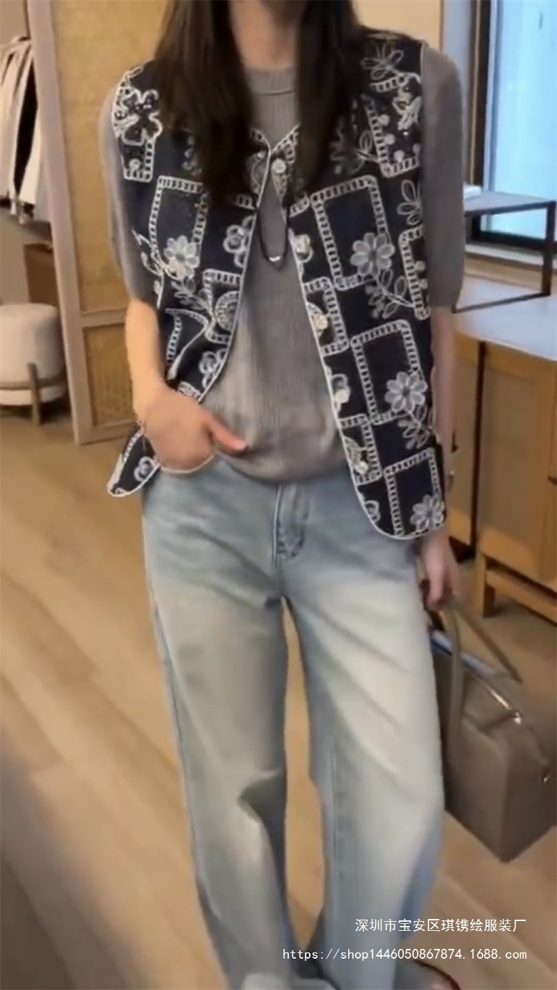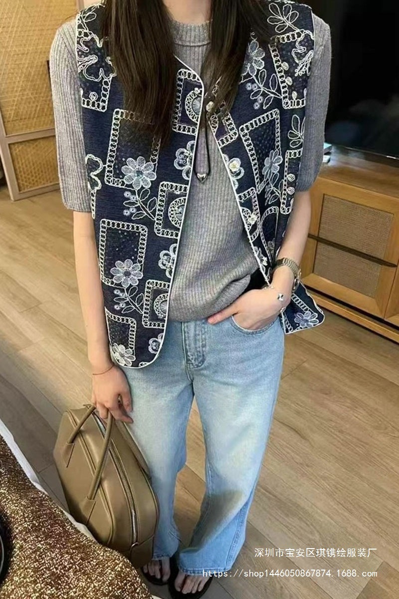 Qi는 중공업 데님 자수 꽃 조끼 재킷 코트 여성의 새로운 중국 스타일 국가 스타일 외부 물결 조끼 그리기