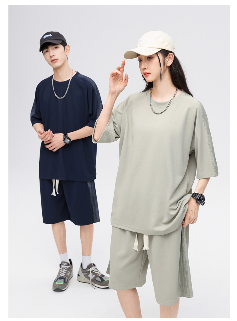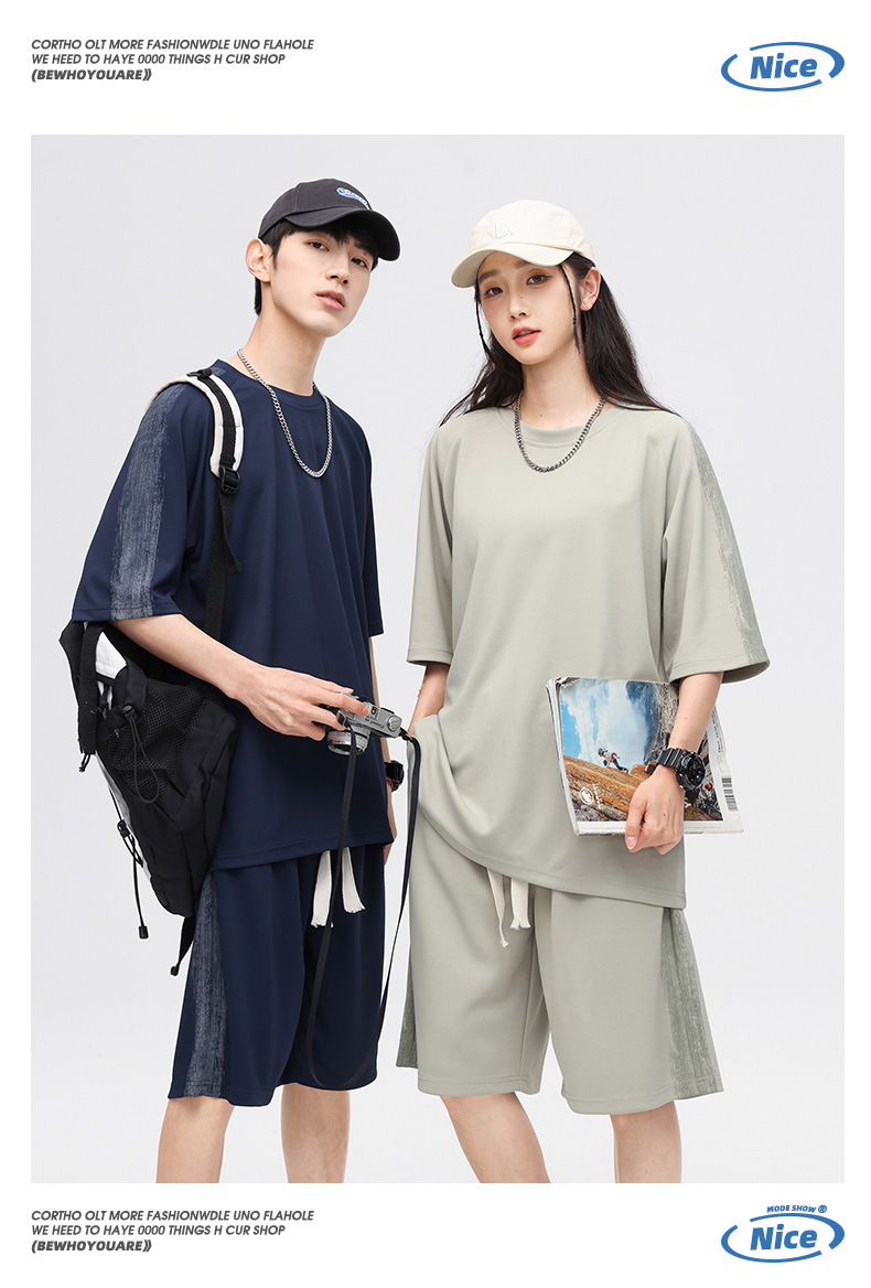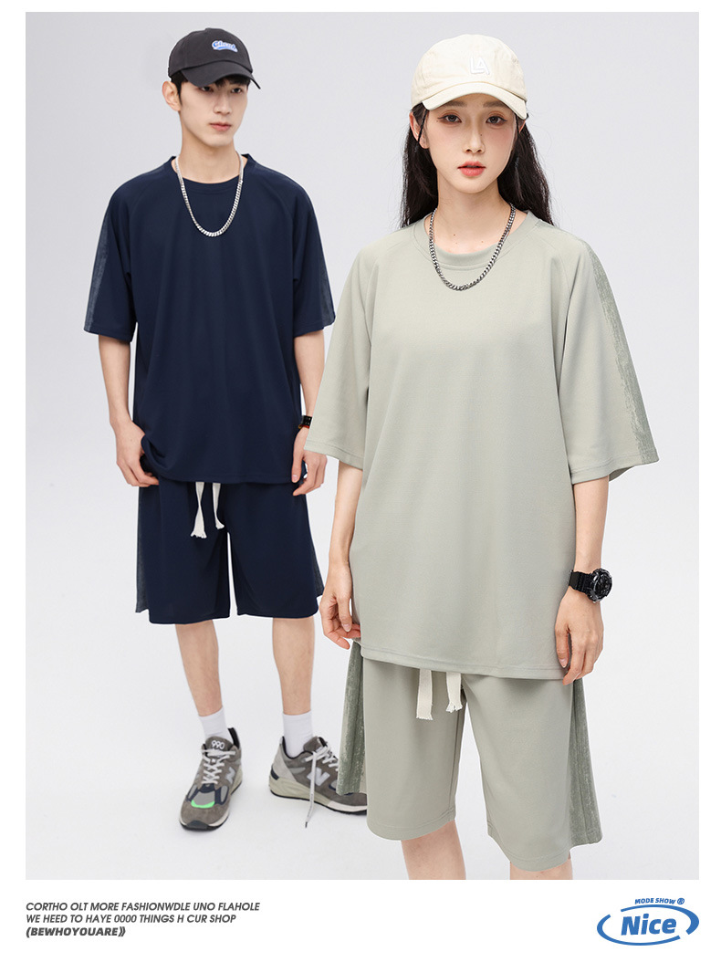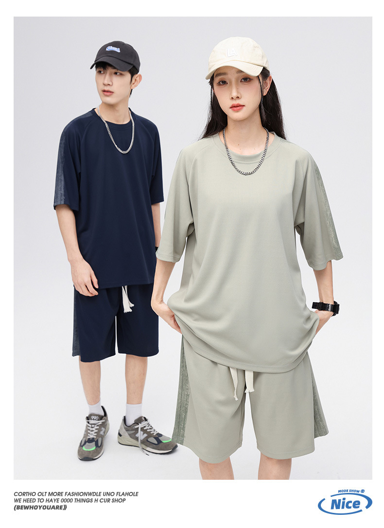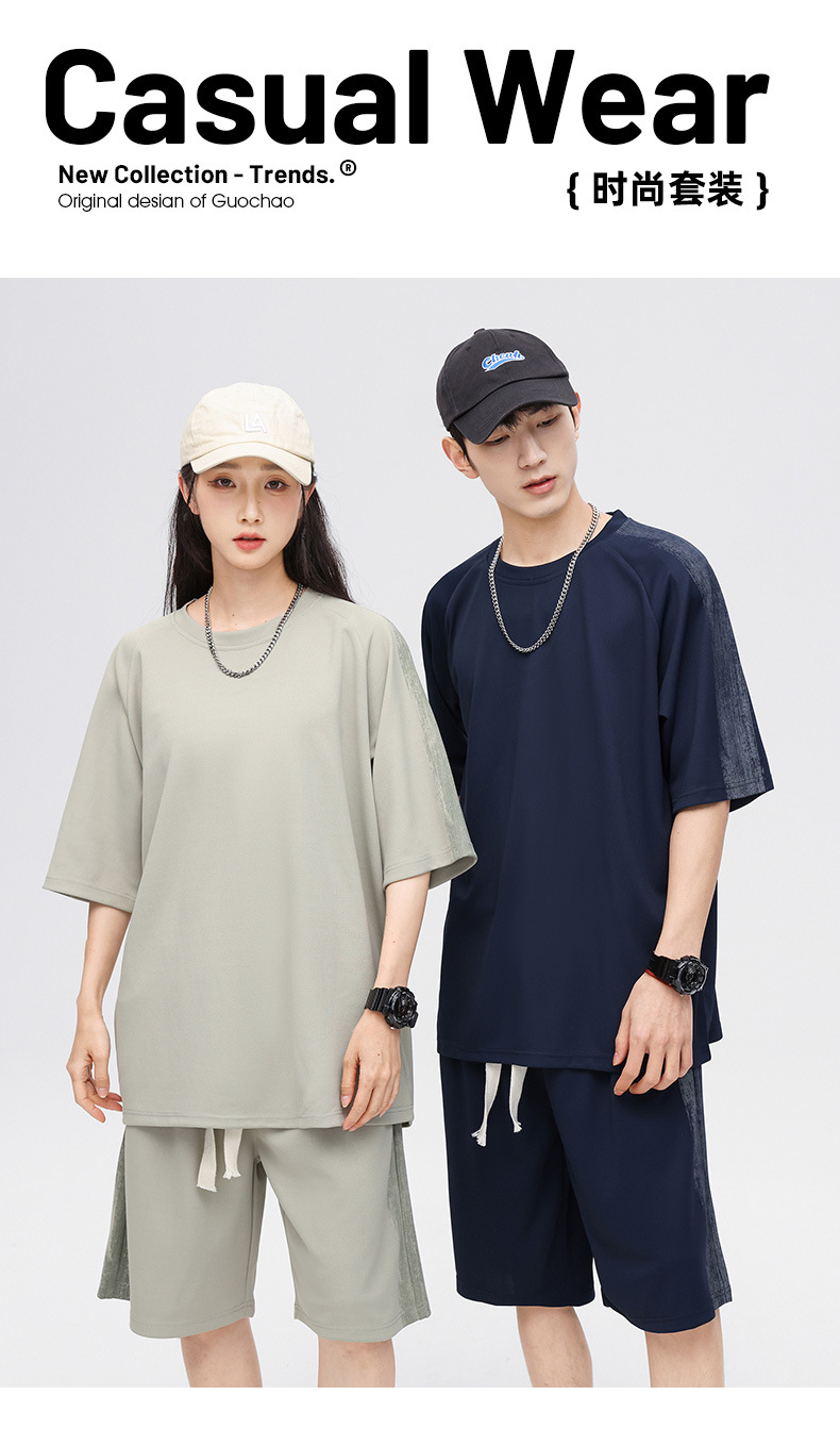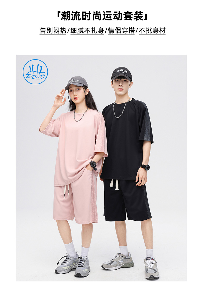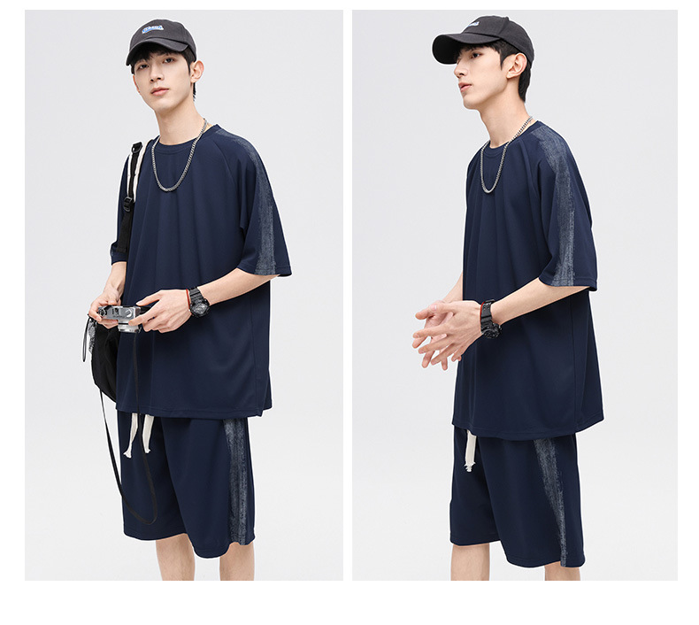 트렌디 한 브랜드 반팔 티셔츠 세트 남성 여름 아이스 실크 캐주얼 니트 세척 탄성 빠른 건조 남성 반바지 투피스 세트스토어 가기