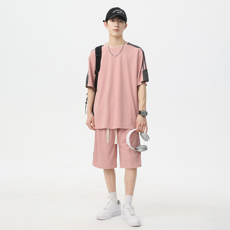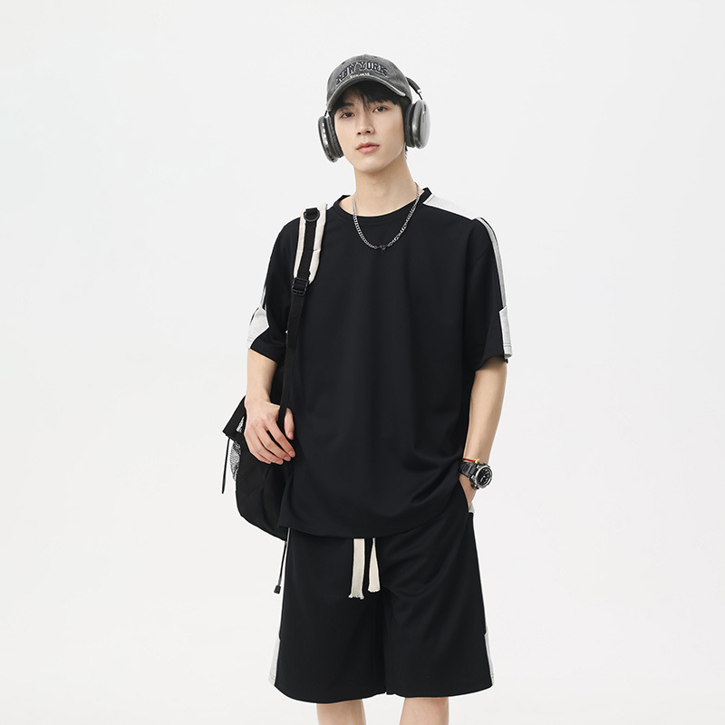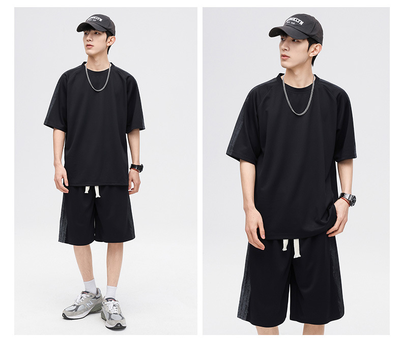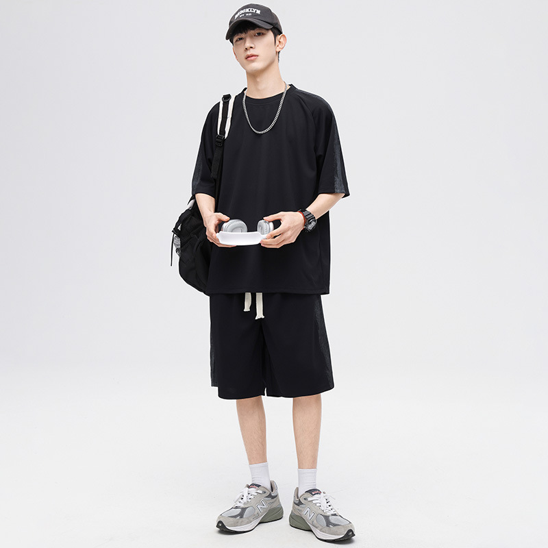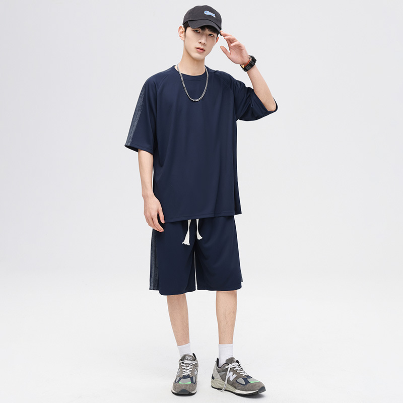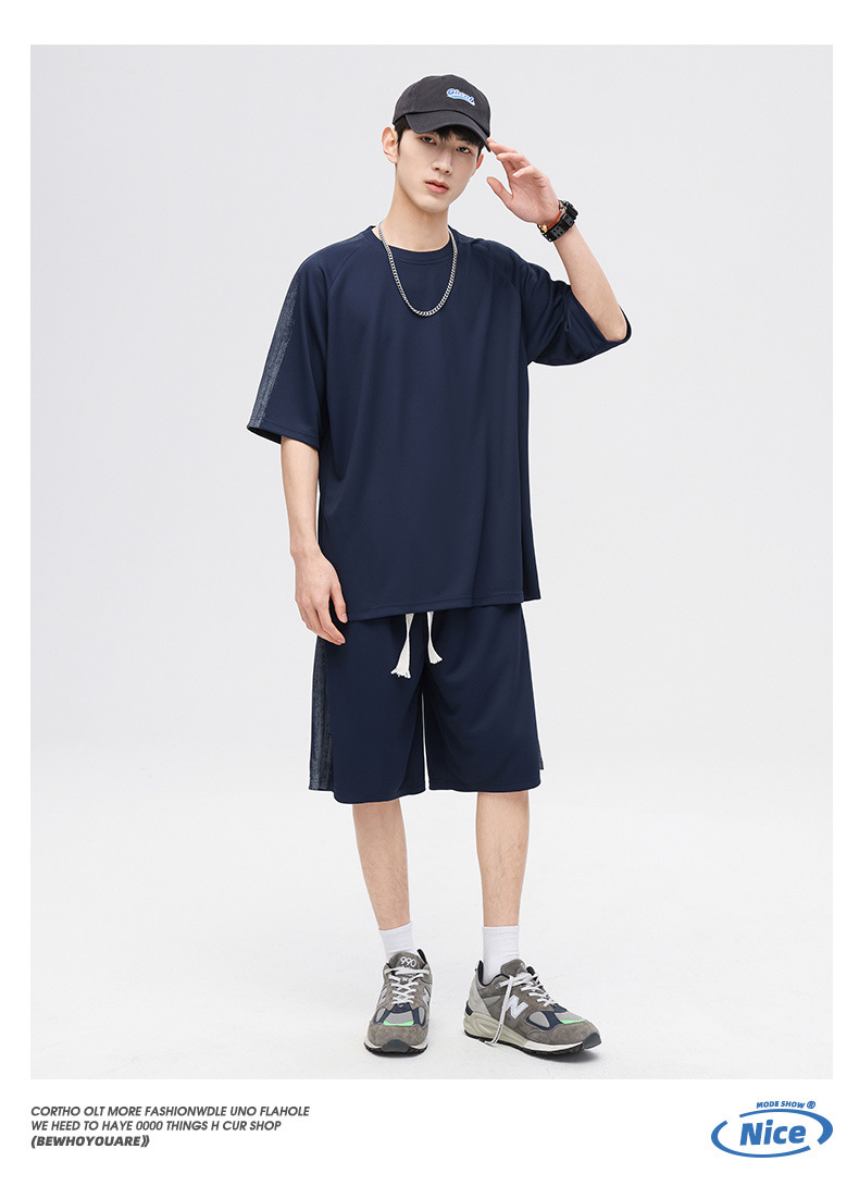 트렌디 한 브랜드 반팔 티셔츠 세트 남성 여름 아이스 실크 캐주얼 니트 세척 탄성 빠른 건조 남성 반바지 투피스 세트