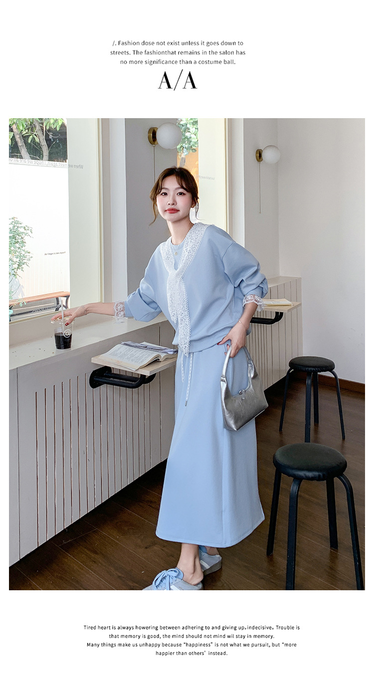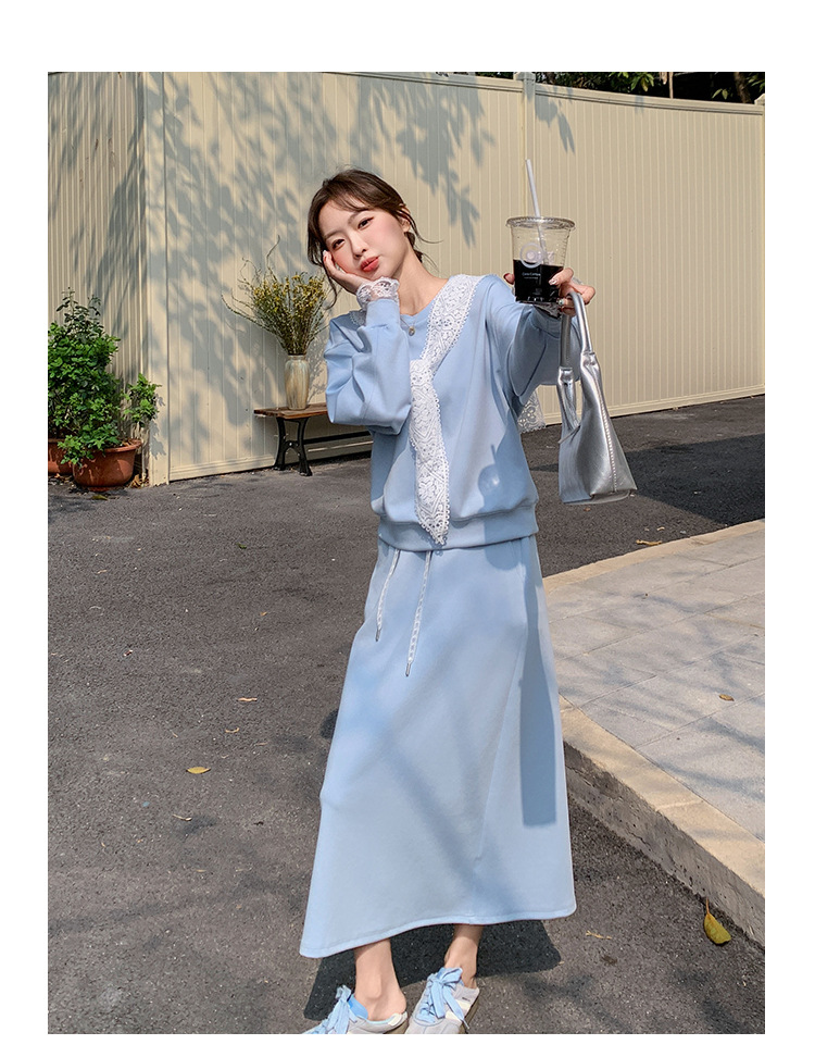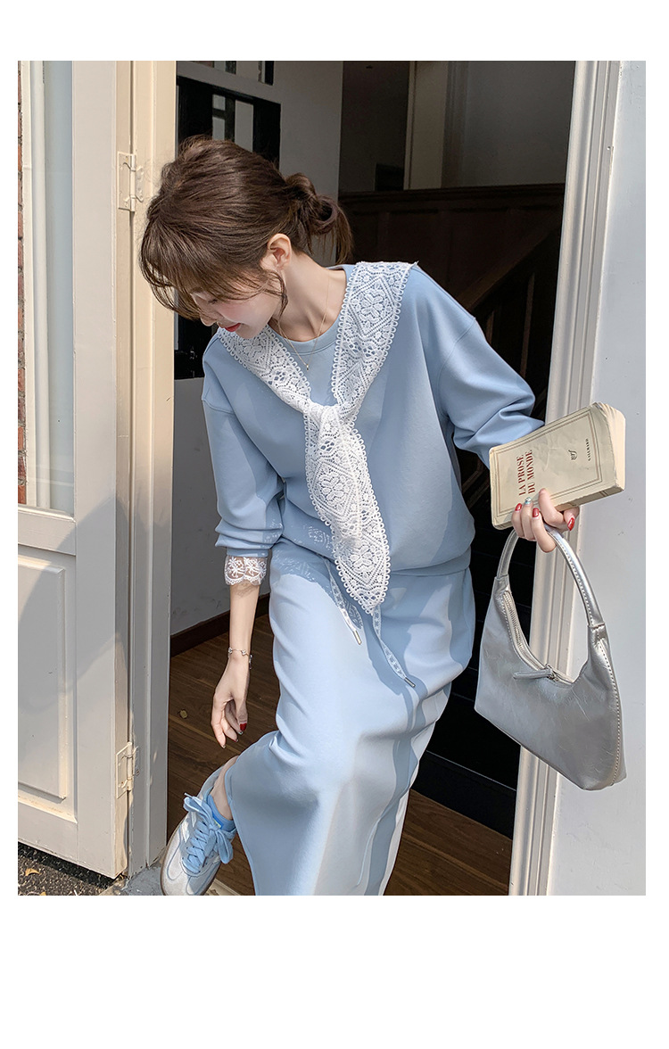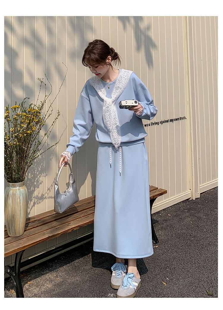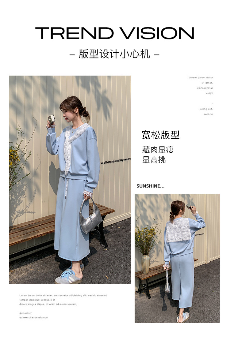 블루 레이스 목도리 스웨트 셔츠 세트 여성 봄 2025 새로운 슈퍼 잘 생긴 달콤한 나이 감소 스커트 투피스 세트스토어 가기