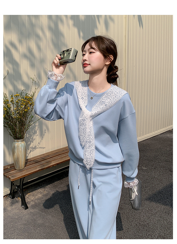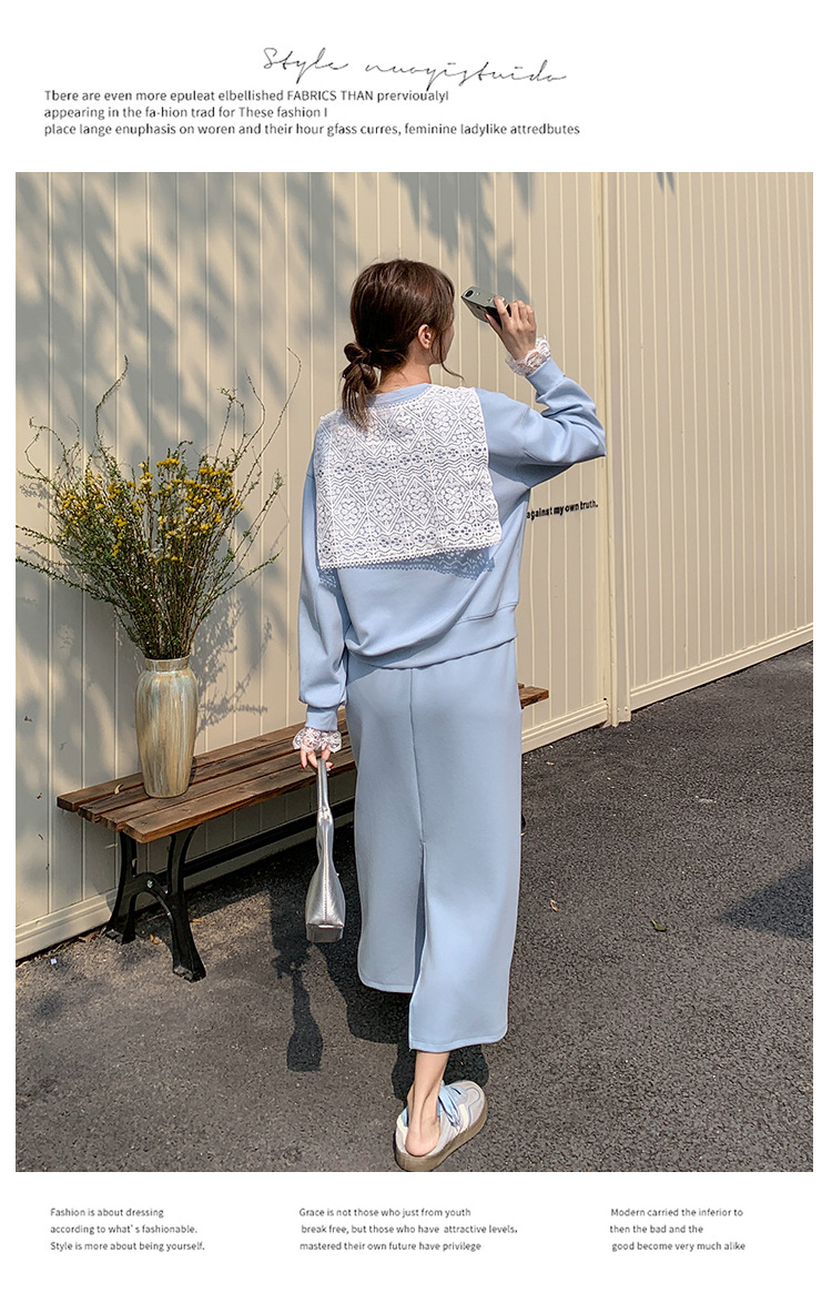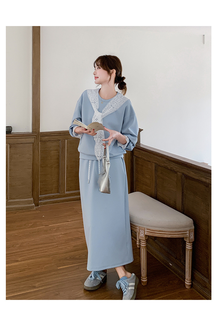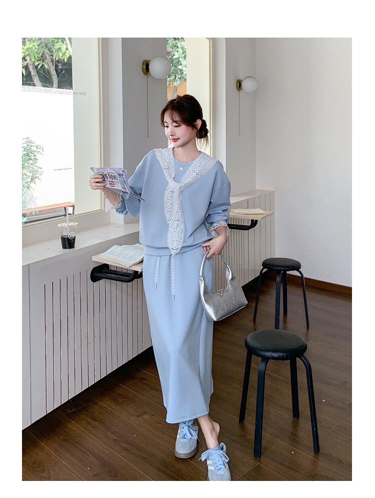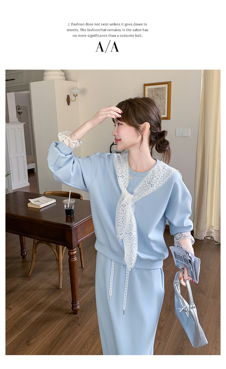 블루 레이스 목도리 스웨트 셔츠 세트 여성 봄 2025 새로운 슈퍼 잘 생긴 달콤한 나이 감소 스커트 투피스 세트스토어 가기