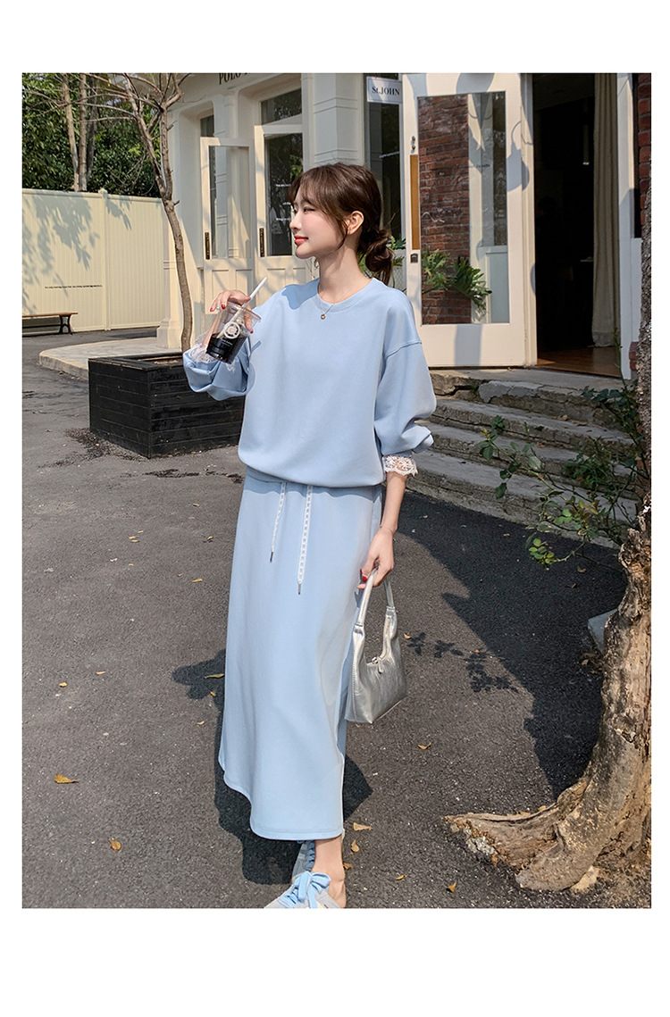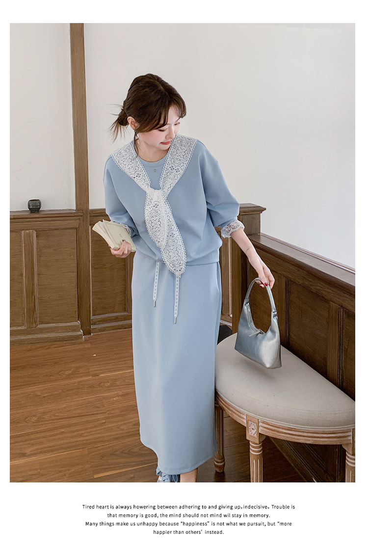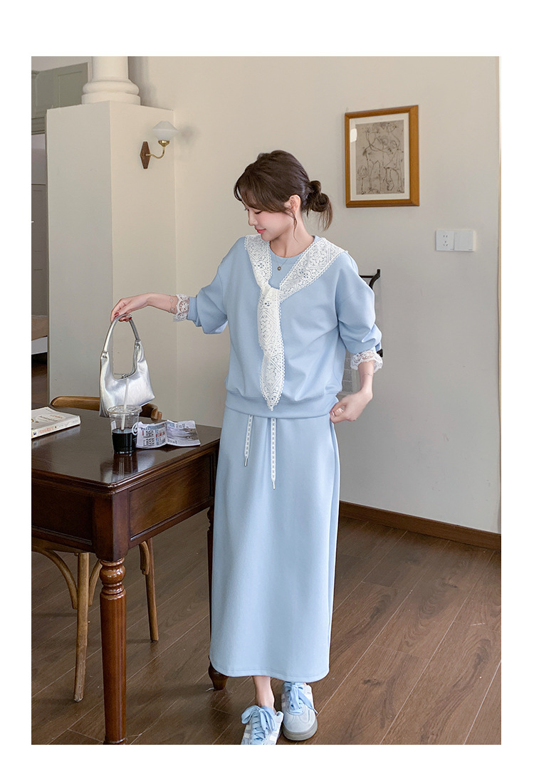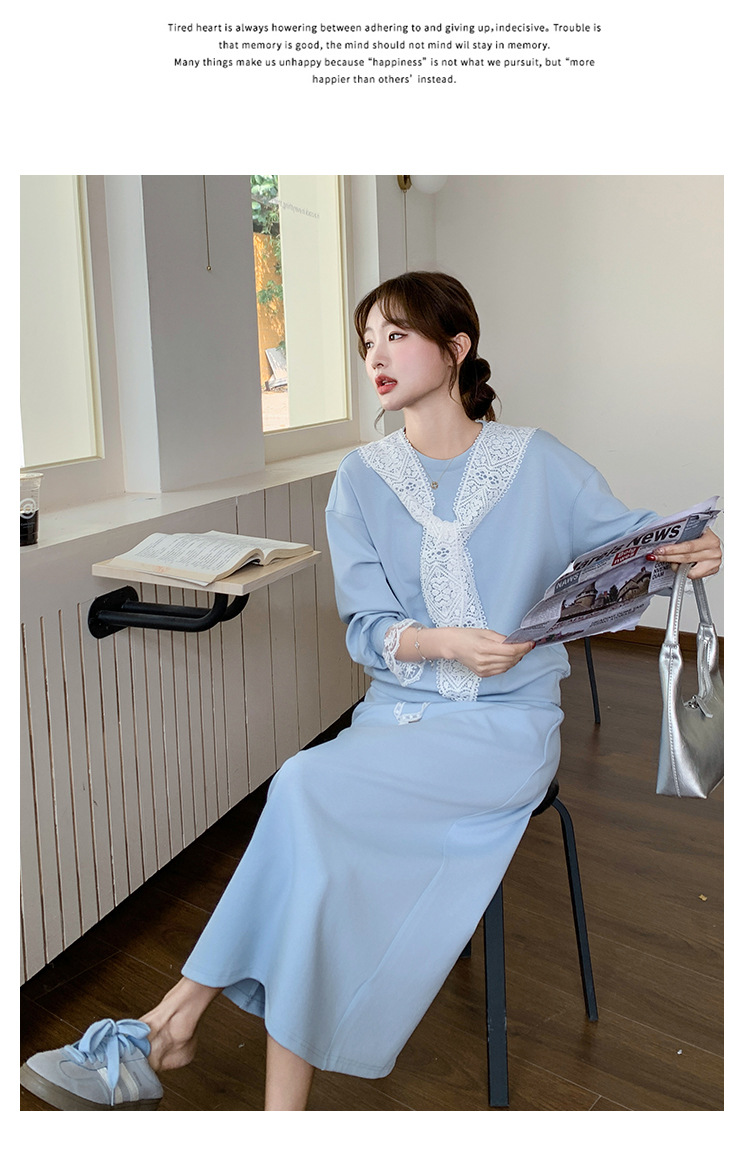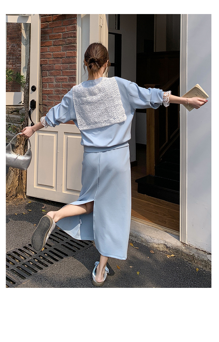 블루 레이스 목도리 스웨트 셔츠 세트 여성 봄 2025 새로운 슈퍼 잘 생긴 달콤한 나이 감소 스커트 투피스 세트스토어 가기