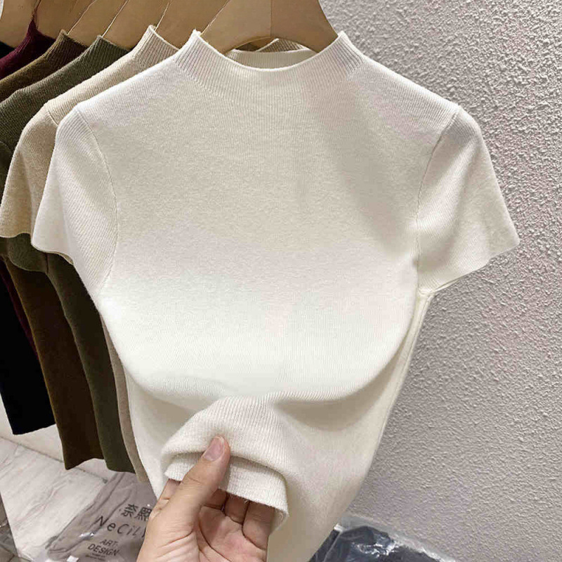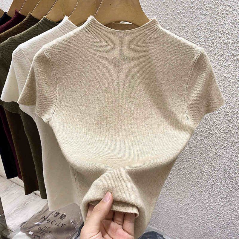 2025 프랑스 슬림 핏 반팔 티셔츠 여성 디자인 센스 새로운베이스 셔츠 하프 하이 칼라 니트 셔츠 내부 탑