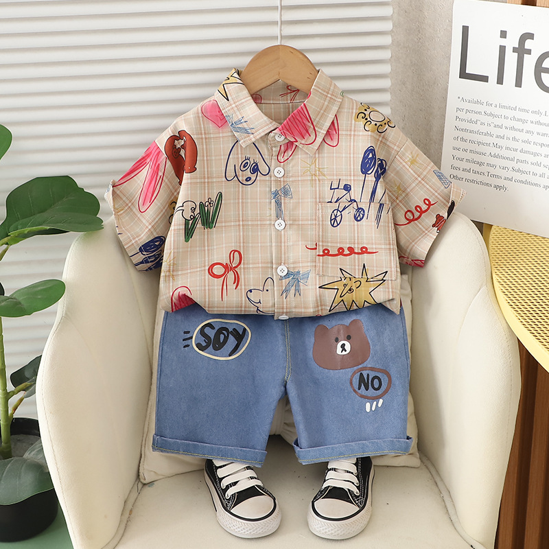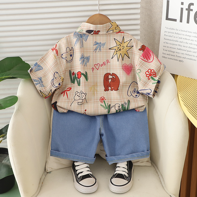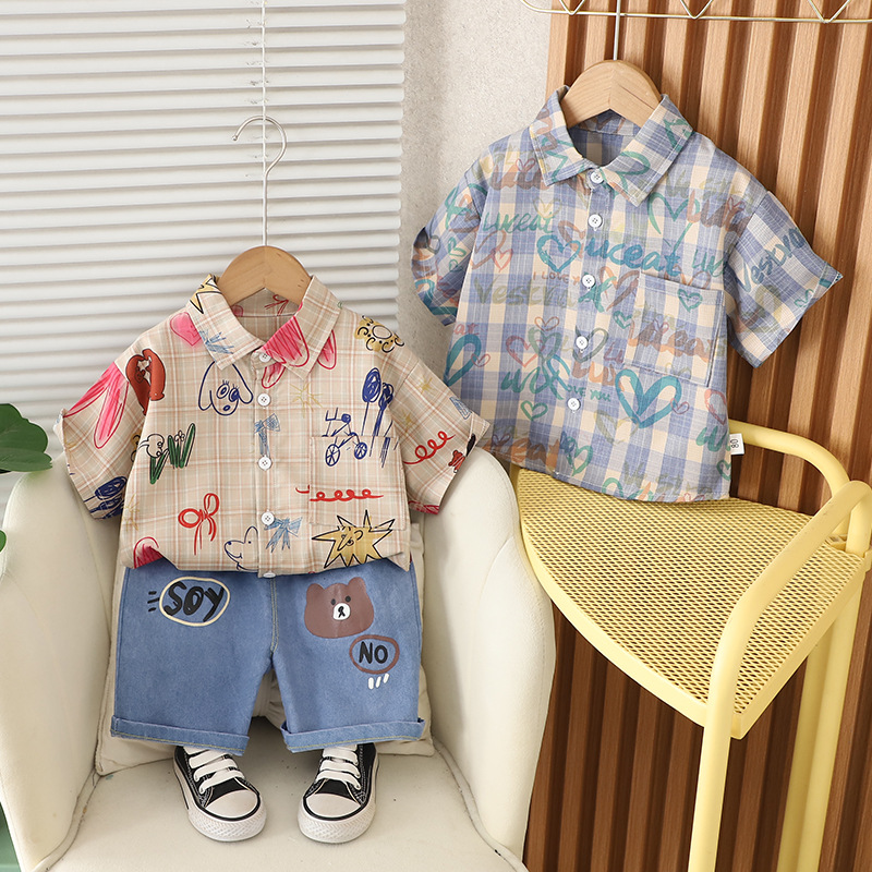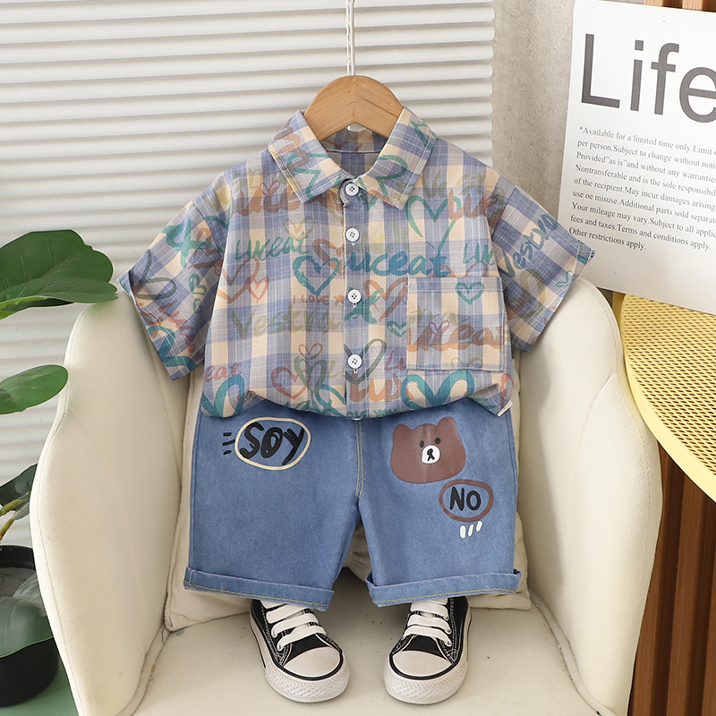 남자들의 여름 서양식 인터넷 인기 반팔 세트 2025 년 새 여름 어린이 격자 무늬 셔츠 반팔 세트스토어 가기