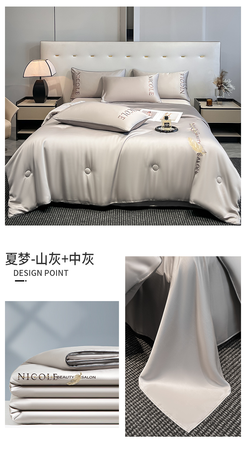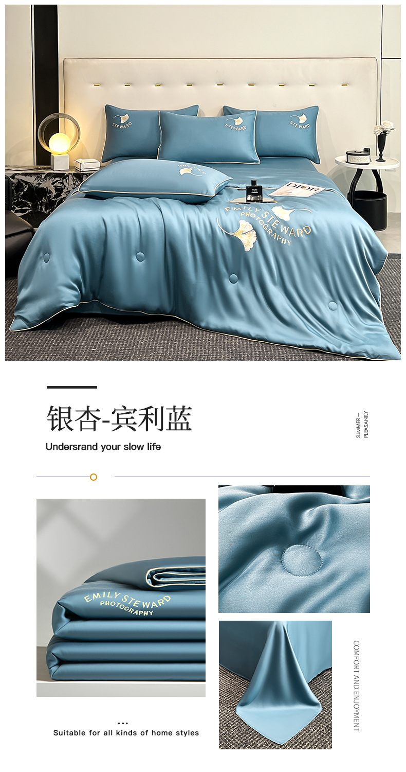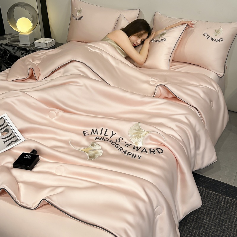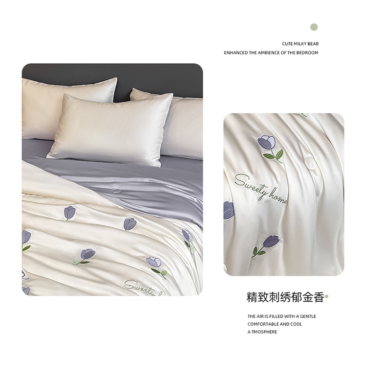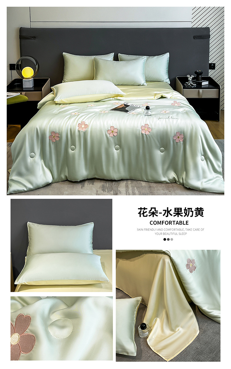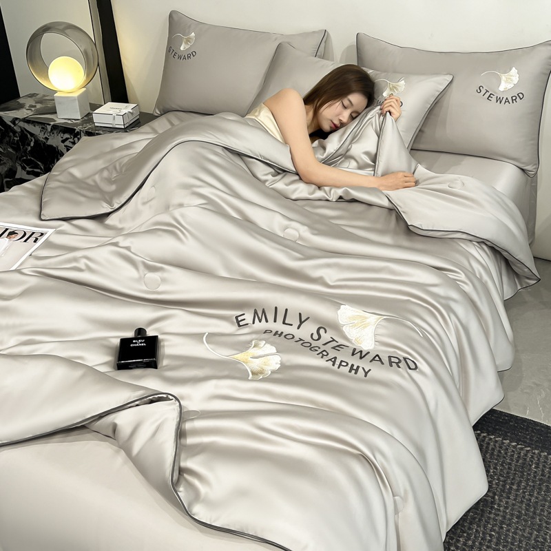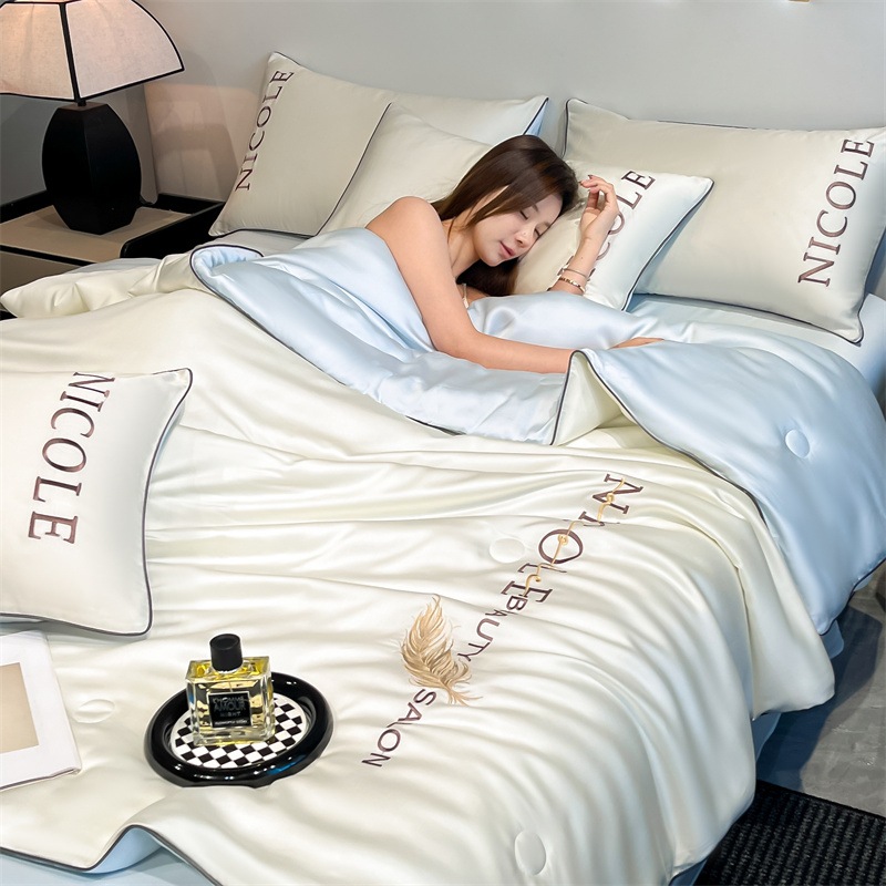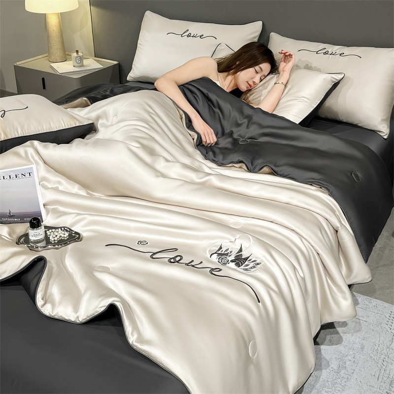 A급 여름 이불 아이스 실크 여름 이불 4종 세트 누드 수면용 실크처럼 부드러운 텐셀 자수 워시블 더블 에어컨 이불 얇은 이불